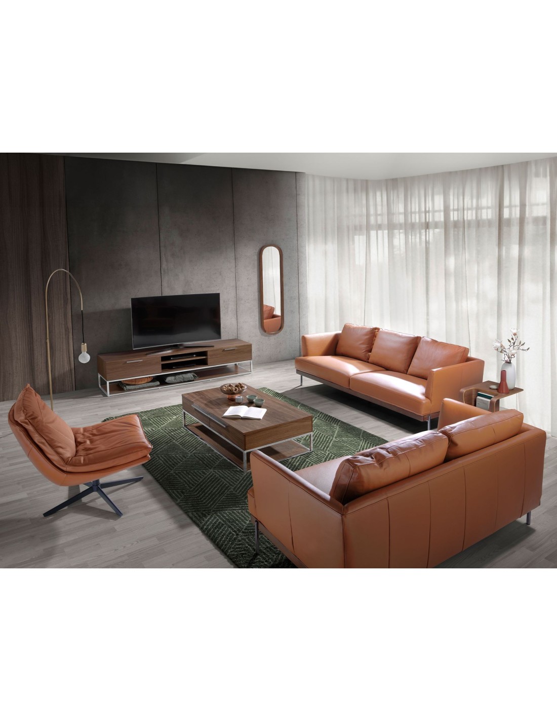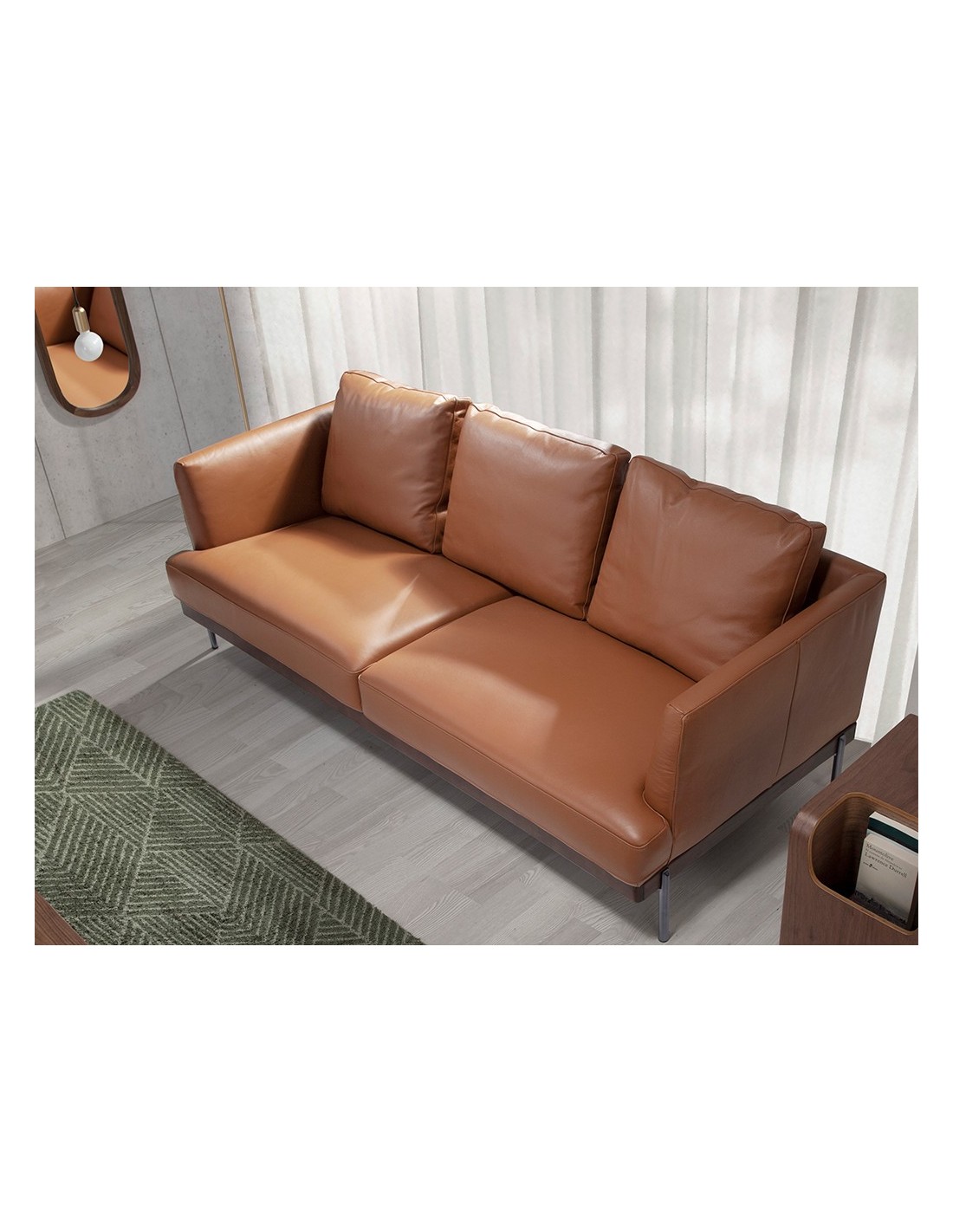 Sofá 3 plazas piel marrón Sofá de 3 plazas de diseño moderno tapizado en piel de origen vacuno color marrón. Tanto por su estilo, como por su embellecedor de madera de haya vaporizada en color nogal y patas de acero inoxidable oscurecido, este sofá aportará el toque de vanguardia y elegancia que busca para su hogar.Medidas del producto: 214 x 93 x 87 cm.- La gran calidad de su tapizado en piel de origen vacuno de 1,5mm de espesor, le confiere además de elegancia y distinción, una gran durabilidad y comodidad. - Todos nuestros sofás están fabricados con materiales de la más alta calidad, con una robusta estructura interna fabricada en madera maciza de pino natural. - Gracias a sus original embellecedor de madera de haya vaporizada tintada en color nogal aporta el toque de calidez y distinción que buscas para tu salón.