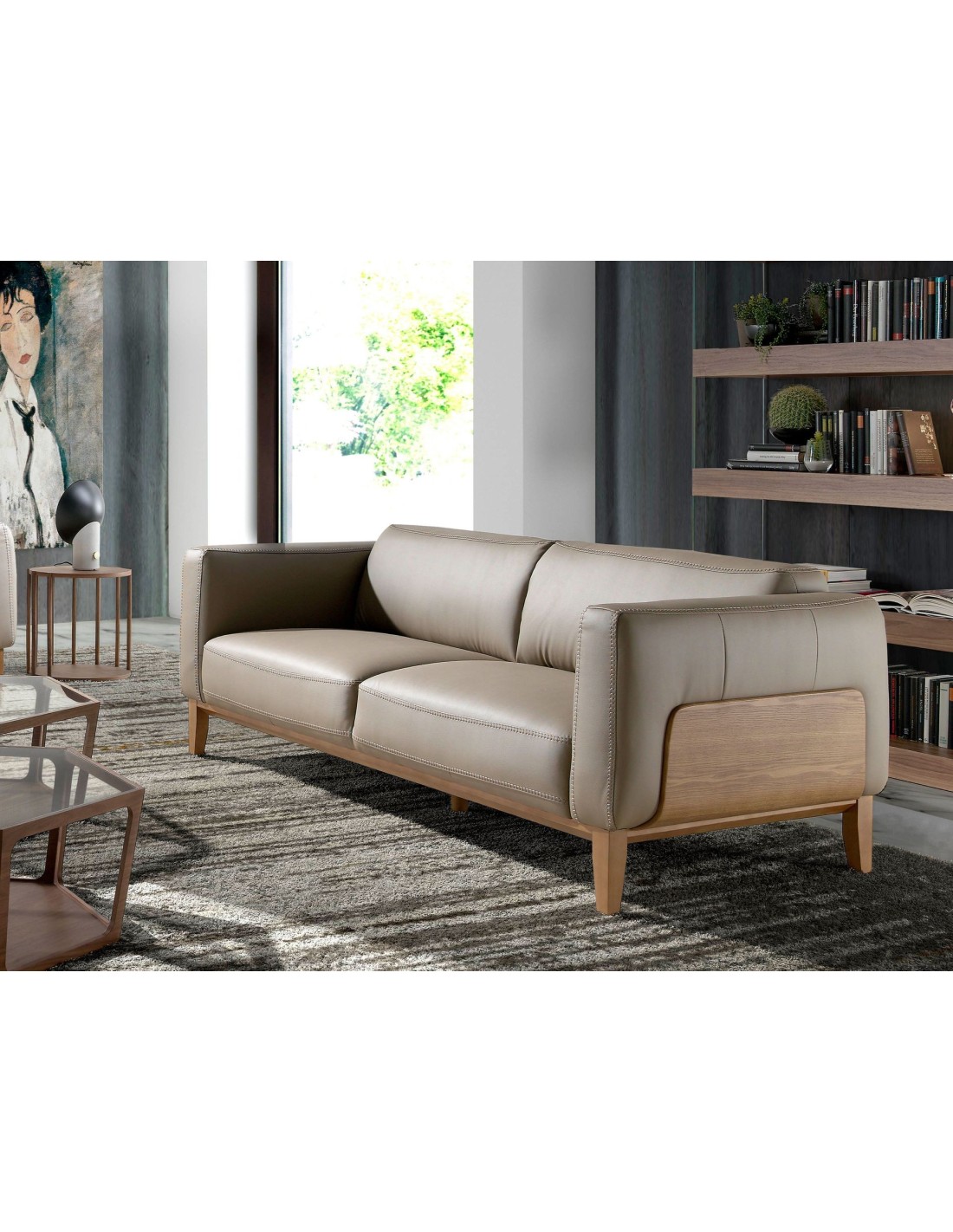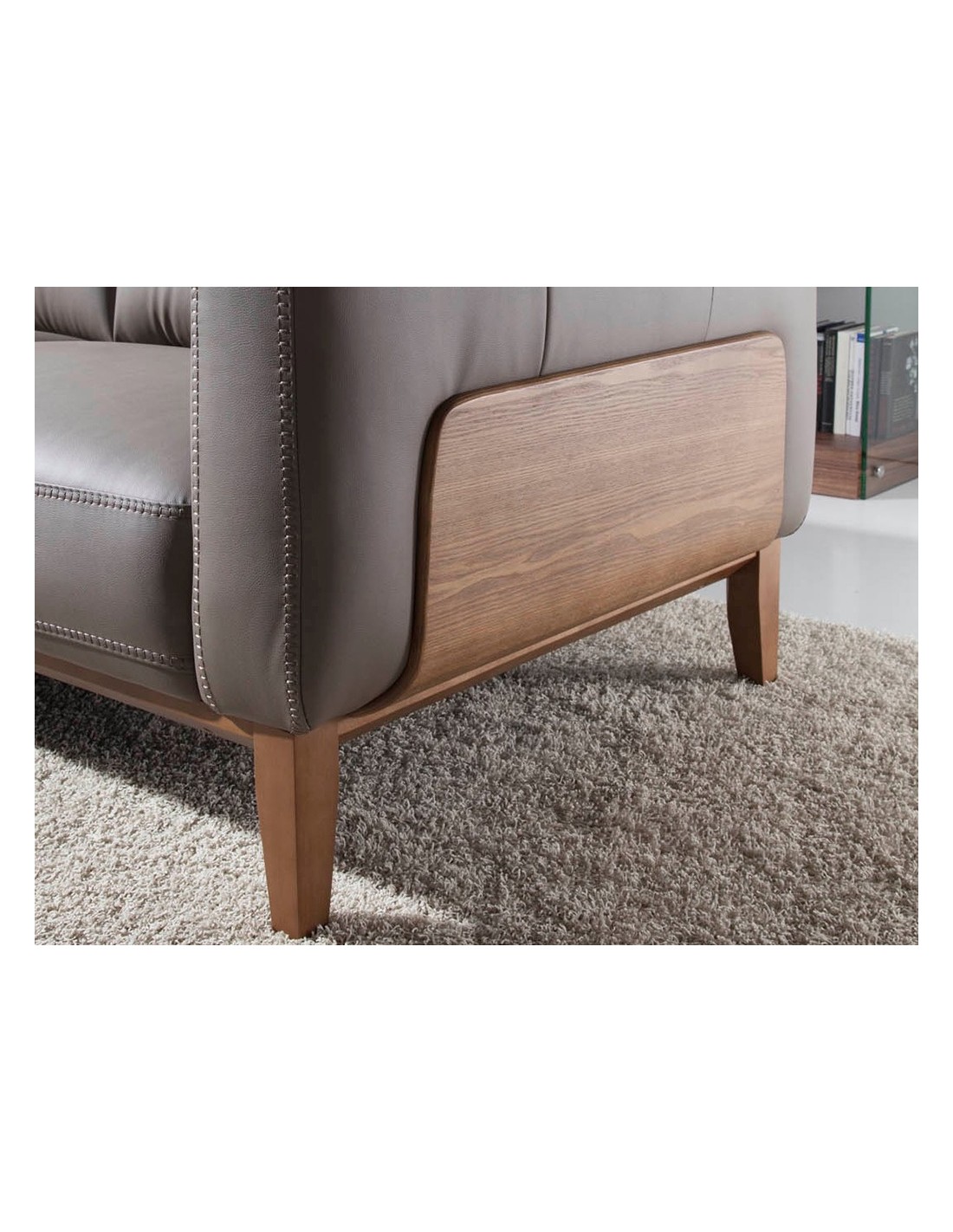 Sofá 3 plazas piel visón Sofá de 3 plazas de diseño moderno tapizado en piel de origen vacuno color visón. Tanto por su estilo, como por su embellecedor de madera de roble tintado en color nogal y patas de madera en color nogal, este sofá aportará el toque de vanguardia y elegancia que busca para su hogar.Medidas del producto: 209 x 92 x 77 cm.- La gran calidad de su tapizado en piel de origen vacuno de 1,5mm de espesor, le confiere además de elegancia y distinción, una gran durabilidad y comodidad. - Todos nuestros sofás están fabricados con materiales de la más alta calidad, con una robusta estructura interna fabricada en madera maciza de pino natural. - Gracias a sus originales embellecedores de madera de roble tintado en color nogal aporta el toque de calidez y distinción que buscas para tu salón.