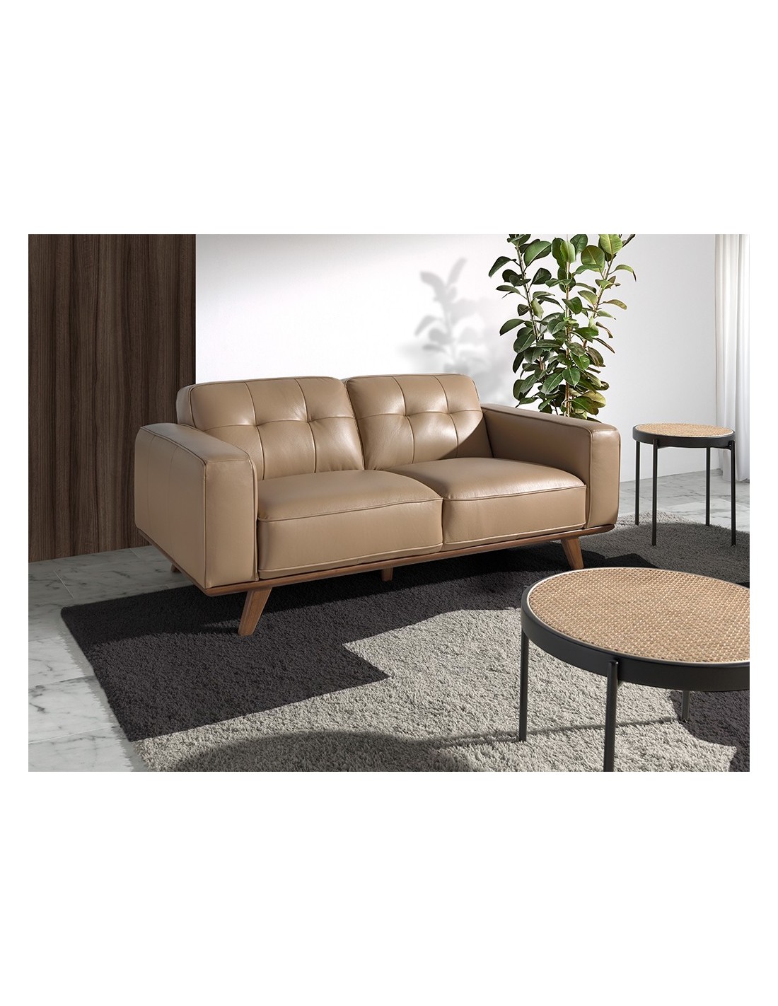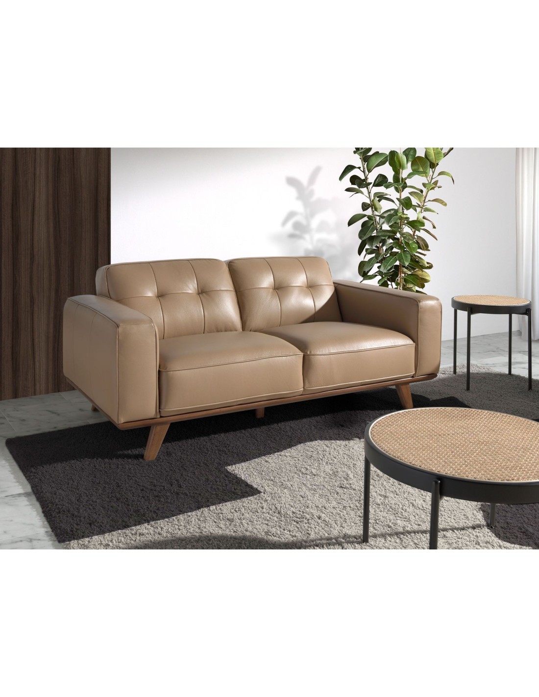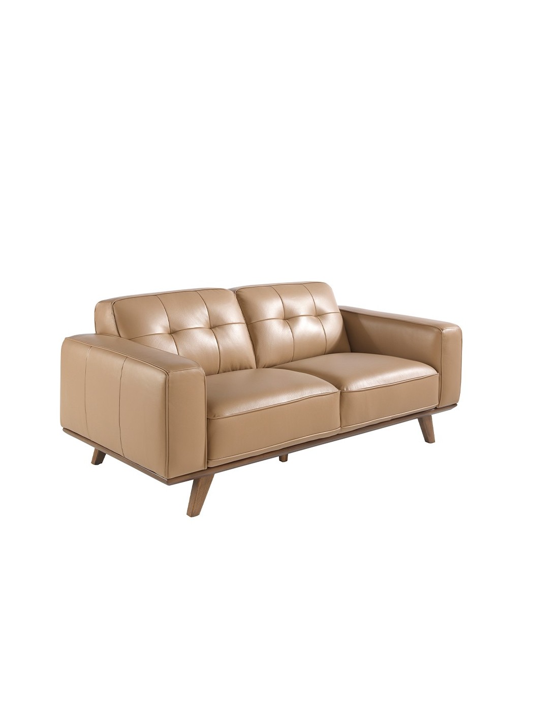 Sofá Chester 2 plazas piel arena Sofá Chester de 2 plazas de diseño moderno tapizado en piel de origen vacuno color arena. Tanto por su estilo, como por sus patas de madera en color nogal, este sofá aportará el toque de vanguardia y elegancia que busca para su hogar.Medidas del producto: 181 x 95 x 78 cm.- La gran calidad de su tapizado en piel de origen vacuno de 1,5mm de espesor con efecto capitoné, le confiere además de elegancia y distinción, una gran durabilidad y comodidad. - Todos nuestros sofás están fabricados con materiales de la más alta calidad, con una robusta estructura interna fabricada en madera maciza de pino natural.