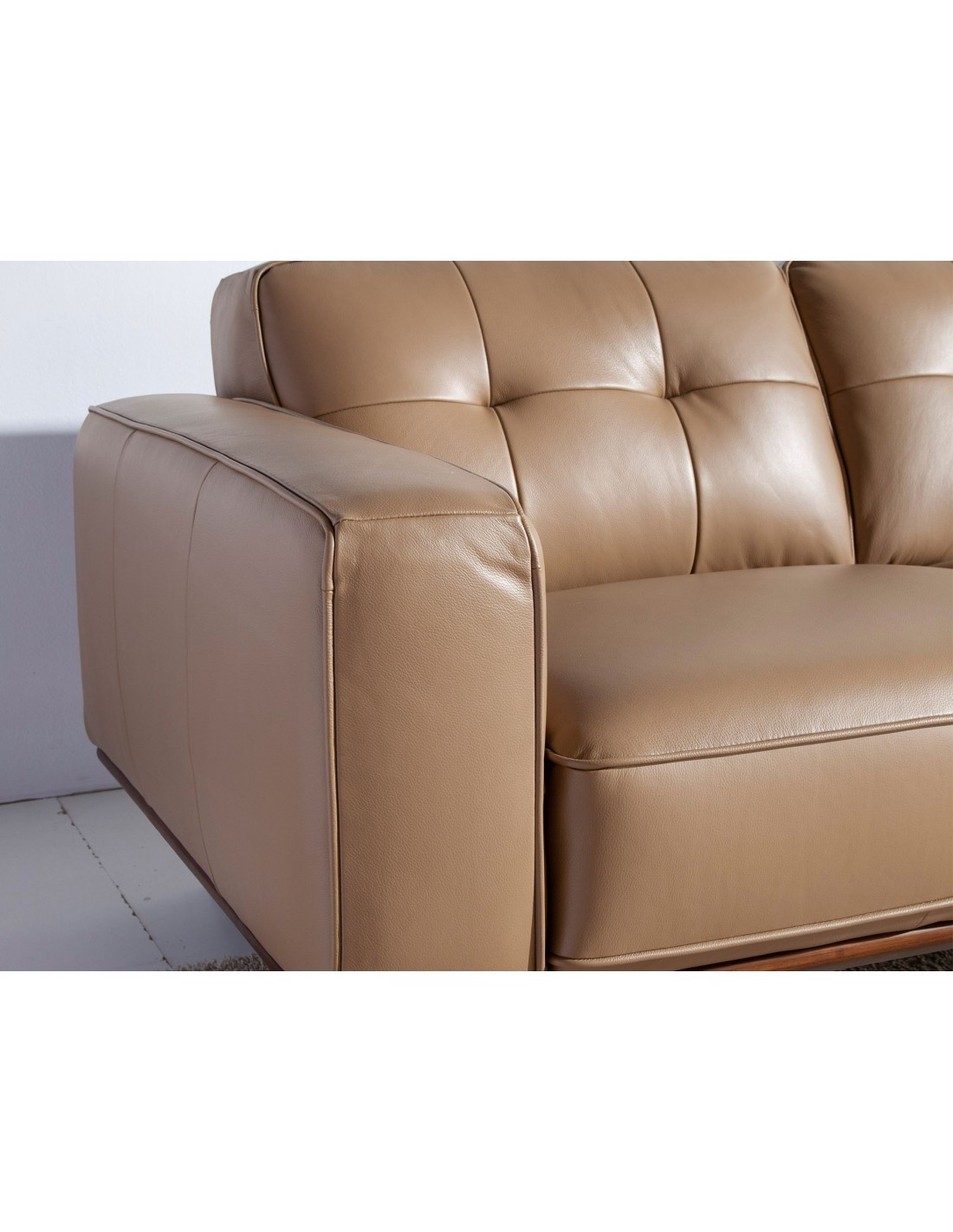 Sofá Chester 3 plazas piel arena Sofá Chester de 3 plazas de diseño moderno tapizado en piel de origen vacuno color arena. Tanto por su estilo, como por sus patas de madera en color nogal, este sofá aportará el toque de vanguardia y elegancia que busca para su hogar.Medidas del producto: 227 x 95 x 78 cm.- La gran calidad de su tapizado en piel de origen vacuno de 1,5mm de espesor con efecto capitoné, le confiere además de elegancia y distinción, una gran durabilidad y comodidad. - Todos nuestros sofás están fabricados con materiales de la más alta calidad, con una robusta estructura interna fabricada en madera maciza de pino natural.
