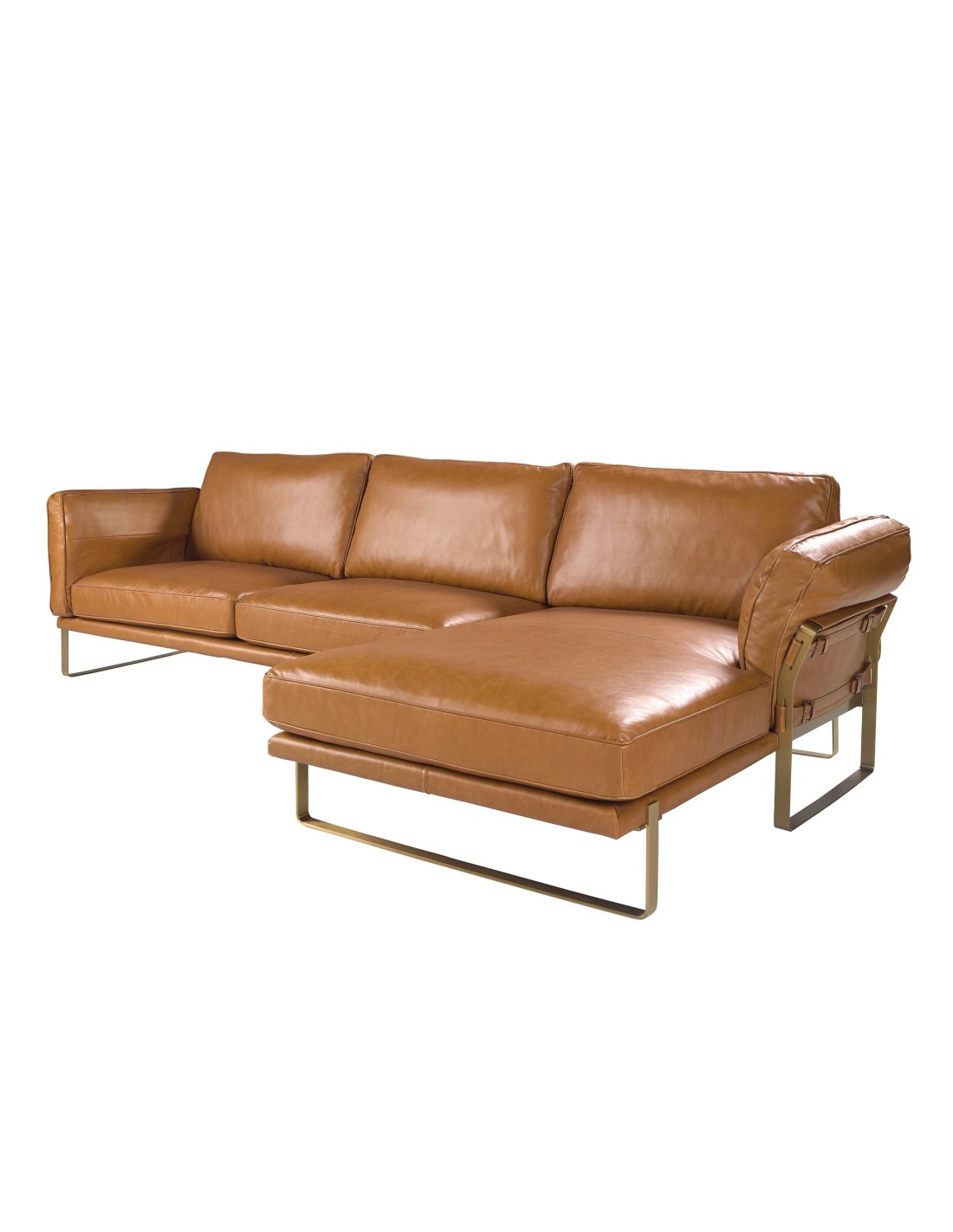 Sofá chaise longue derecha piel camel Sofá chaise longue derecha de 5 plazas de diseño moderno tapizado en piel de origen vacuno color camel. Tanto por su estilo, como por sus patas de acero inoxidable en color dorado, este sofá aportará el toque de vanguardia y elegancia que busca para su hogar.Medidas del producto: 302 x 166 x 84 cm.- La gran calidad de su tapizado en piel de origen vacuno de 1,25mm de espesor, le confiere además de elegancia y distinción, una gran durabilidad y comodidad. - Todos nuestros sofás están fabricados con materiales de la más alta calidad, con una robusta estructura interna fabricada en madera maciza de pino natural. - Su diseño original de correas que envuelve su estructura, le brinda un toque diferente y exclusivo convirtiéndolo en una pieza de estilo moderno ideal .