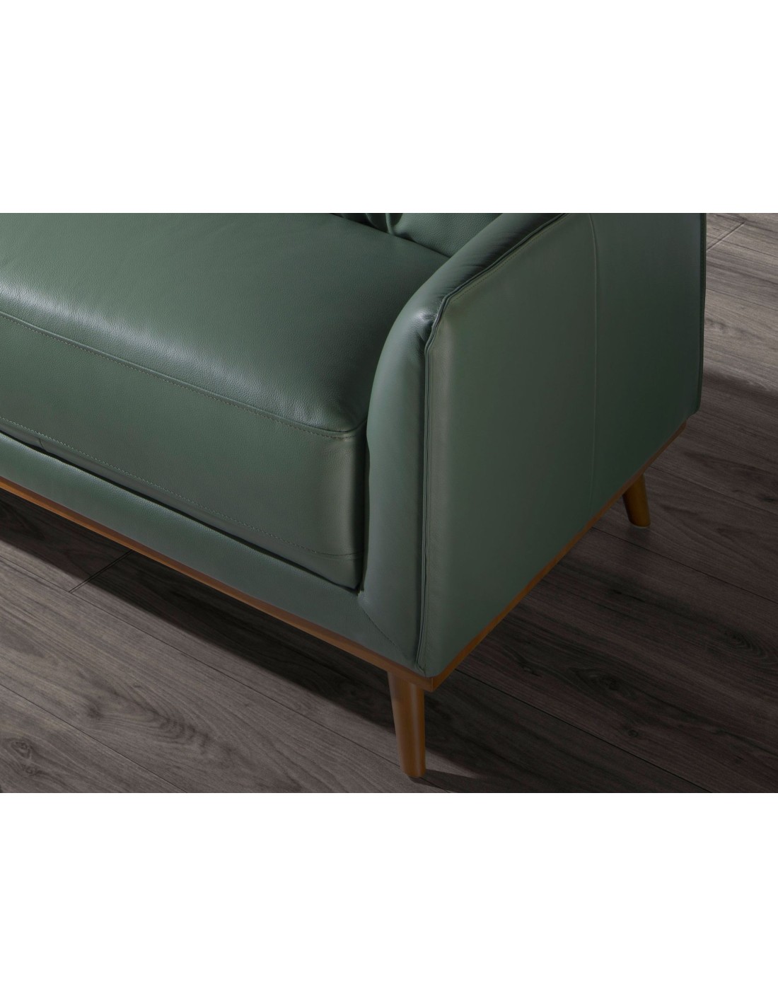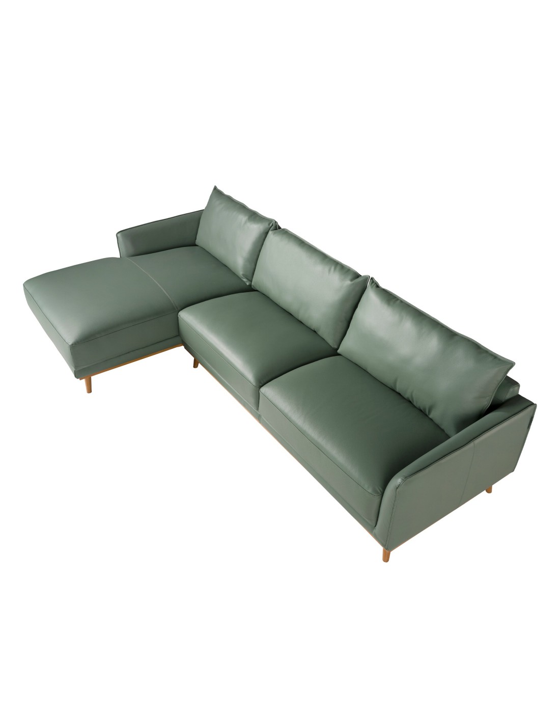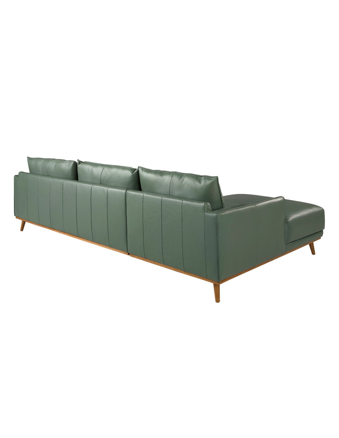 Sofá chaise longue izquierda piel verde Sofá chaise longue izquierda de 5 plazas de diseño moderno tapizado en piel de origen vacuno color verde. Tanto por su estilo, como por sus patas de madera en color miel, este sofá aportará el toque de vanguardia y elegancia que busca para su hogar.Medidas del producto: 295 x 160 x 90 cm.- La gran calidad de su tapizado en piel de origen vacuno de 1,5mm de espesor, le confiere además de elegancia y distinción, una gran durabilidad y comodidad. - Todos nuestros sofás están fabricados con materiales de la más alta calidad, con una robusta estructura interna fabricada en madera maciza de pino natural. - Los cojines del respaldo son extraíbles y desenfundables con sistema de cremallera.