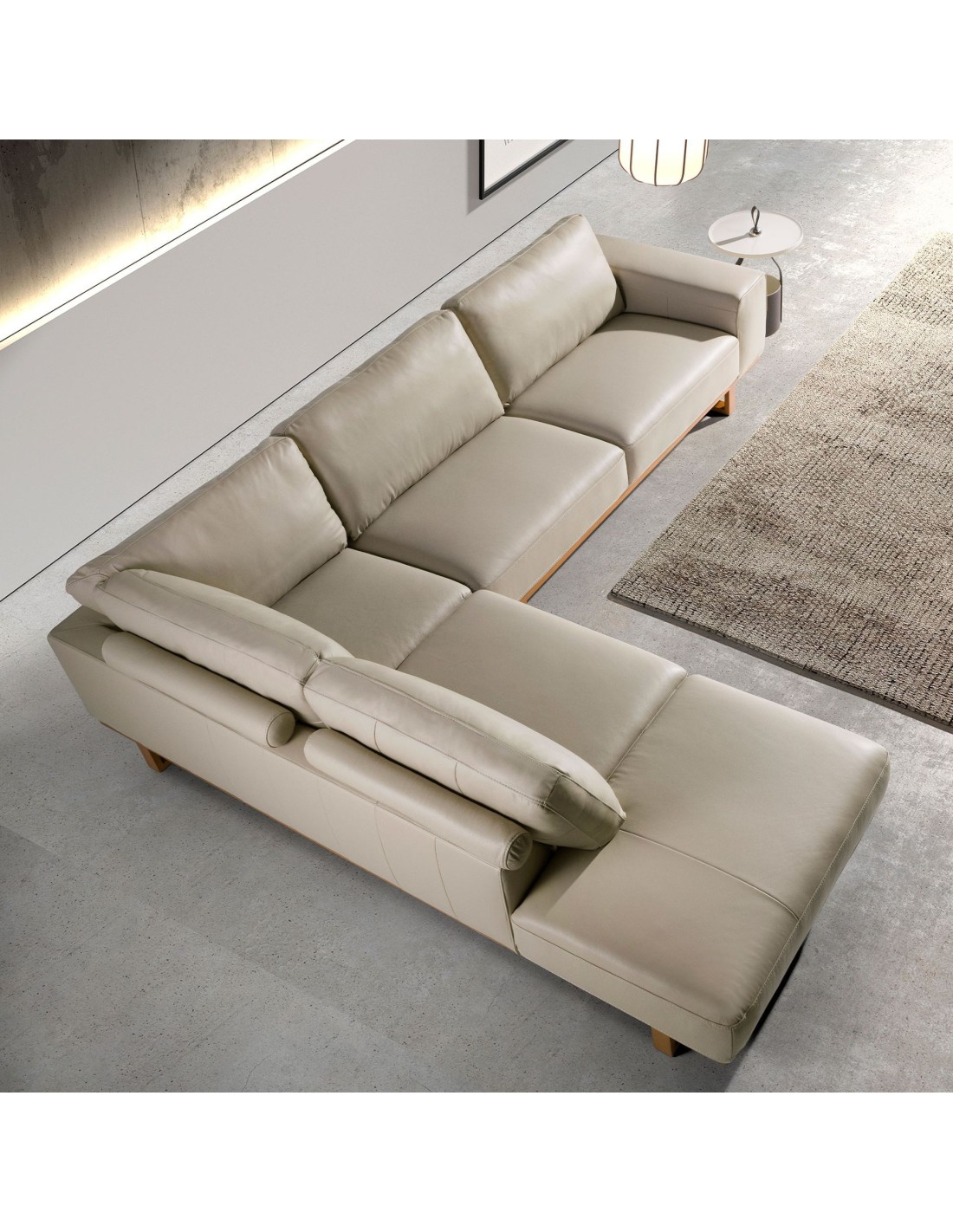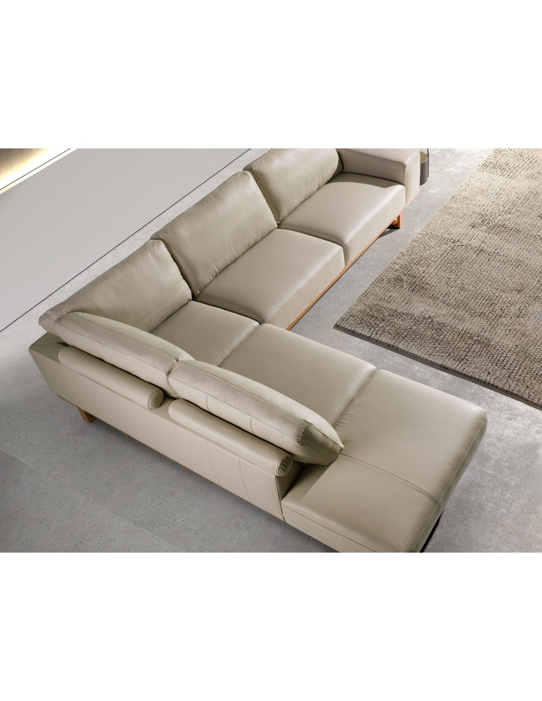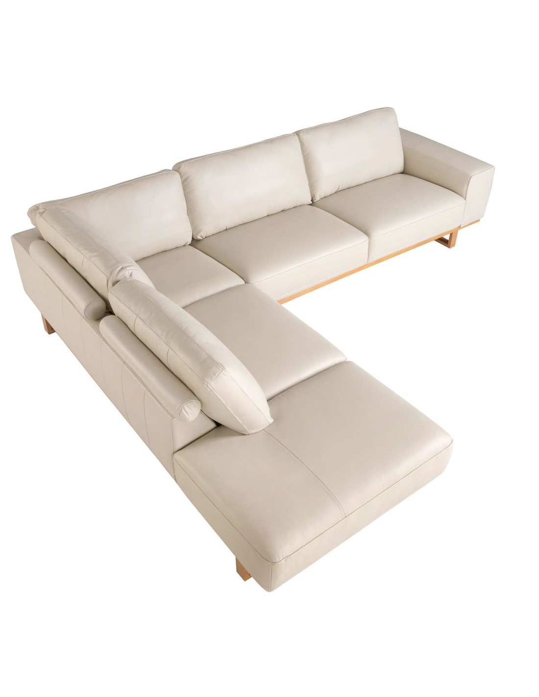 Sofá rinconera izquierda piel arena Sofá rinconera izquierda de 5 plazas de diseño moderno tapizado en piel de origen vacuno color arena. Tanto por su estilo, como por sus patas de madera en color miel, este sofá aportará el toque de vanguardia y elegancia que busca para su hogar.Medidas del producto: 316 x 252 x 82 cm.- La gran calidad de su tapizado en piel de origen vacuno de 1,5mm de espesor, le confiere además de elegancia y distinción, una gran durabilidad y comodidad. - Todos nuestros sofás están fabricados con materiales de la más alta calidad, con una robusta estructura interna fabricada en madera maciza de pino natural. - Los cojines del respaldo son extraíbles y desenfundables con sistema de cremallera.