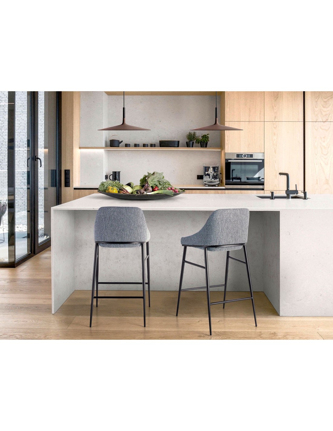 Taburete tela gris Taburete de diseño moderno con asiento y respaldo tapizados en tela color gris. Sus patas de acero inoxidable color negro de estilo vanguardista a la vez que atemporal, lo convertirán en el must have de su cocina o comedor. Este taburete de la firma Angel Cerdá, aúna el estilo único y personal de la marca, así como la mayor comodidad y estabilidad, gracias a la alta calidad de su tapizado y la original estructura de patas.Medidas del producto: 49 x 53 x 90 cm.- La combinación de la tela con el acero negro, ofrece además de un toque moderno, un aire distintivo y sofisticado al espacio. - Sus patas robustas y de carácter lineal lo convierten en una pieza que complementa al 100% diseño, confort y el estilo más vanguardista. - Si busca el taburete perfecto para su cocina o comedor, ésta es una opción ideal para aunar el toque moderno y de vanguardia que necesita, con la mayor calidad y funcionalidad. - Tanto por el tamaño de su asiento y su relleno en espuma de poliuretano de 25kg/m3, así como su cómodo respaldo le permitirá contar con el máximo confort, sin dejar de lado el diseño más actual.