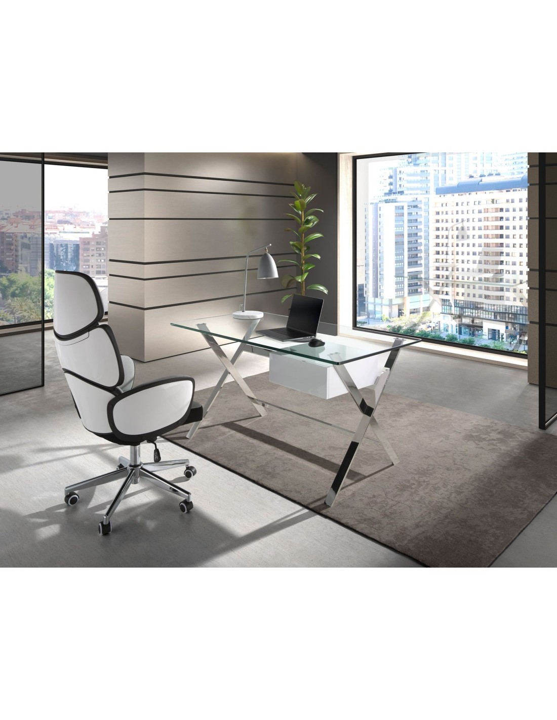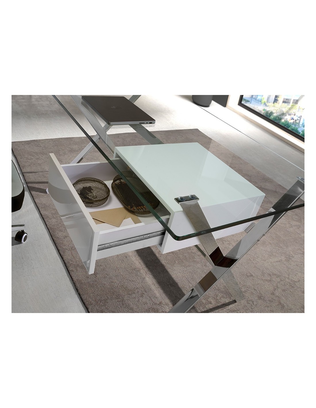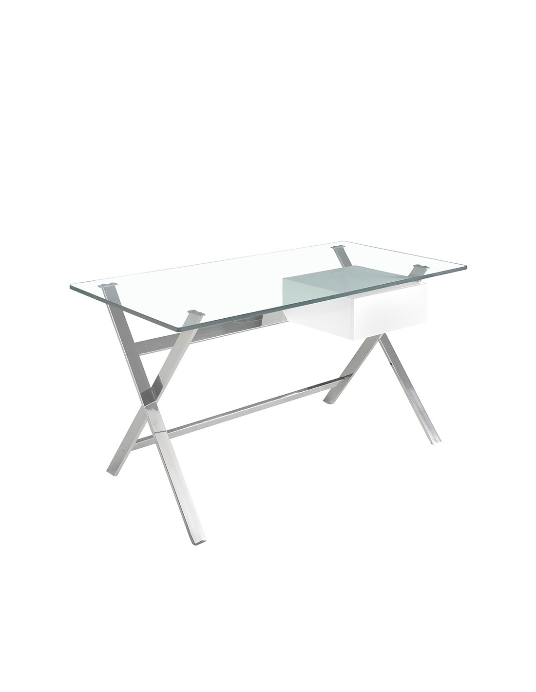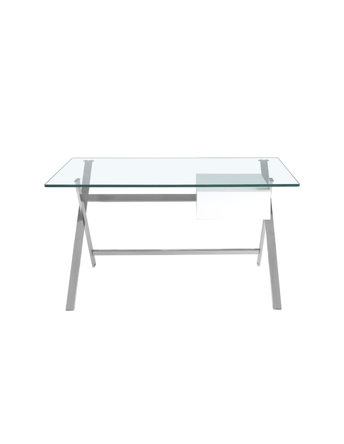 Escritorio madera blanca y acero cromado con tapa de cristal templado