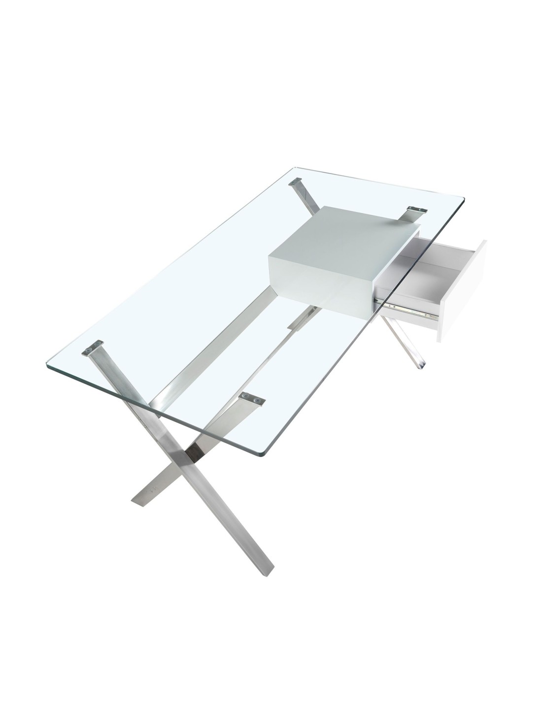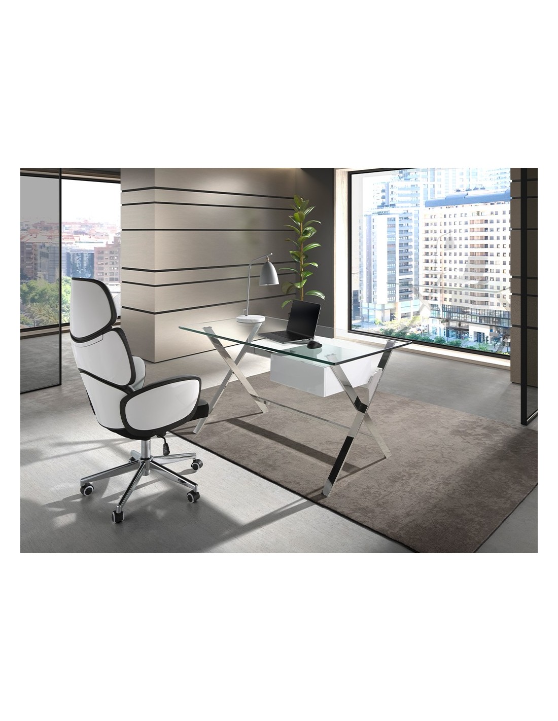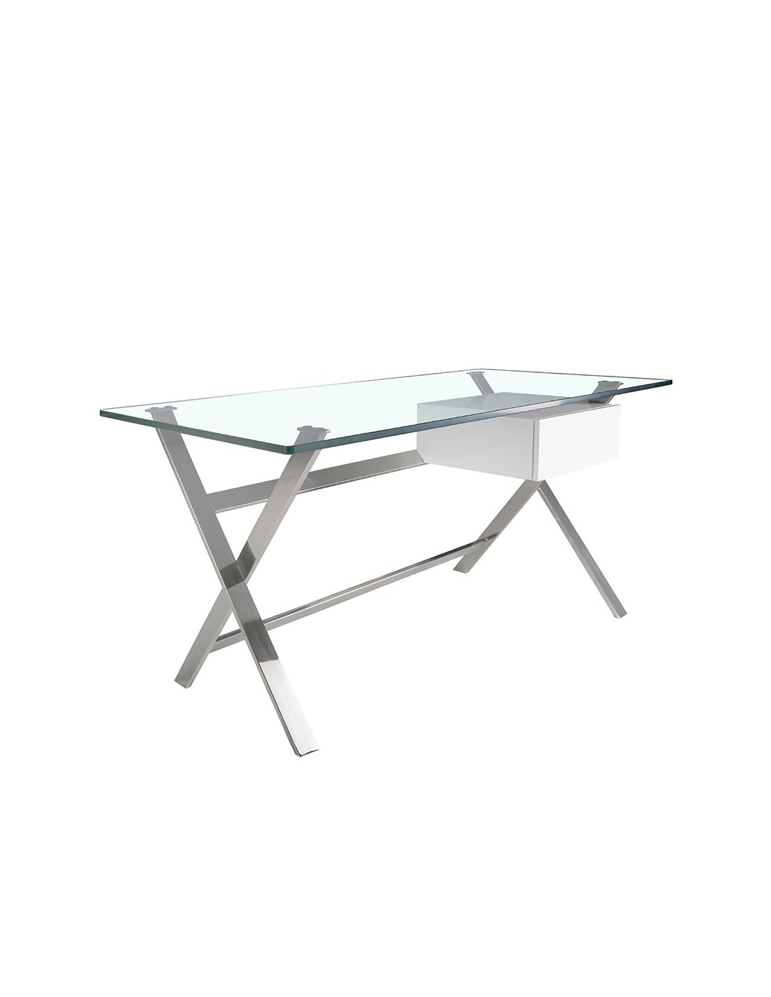Escritorio madera blanca y acero cromado con tapa de cristal templado
