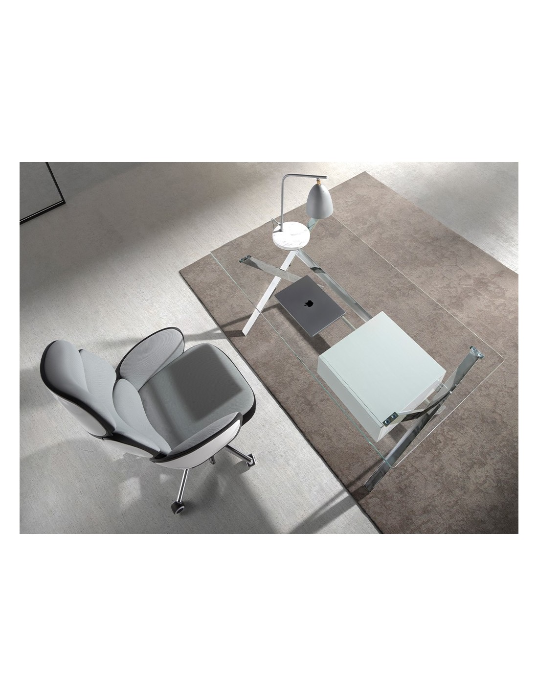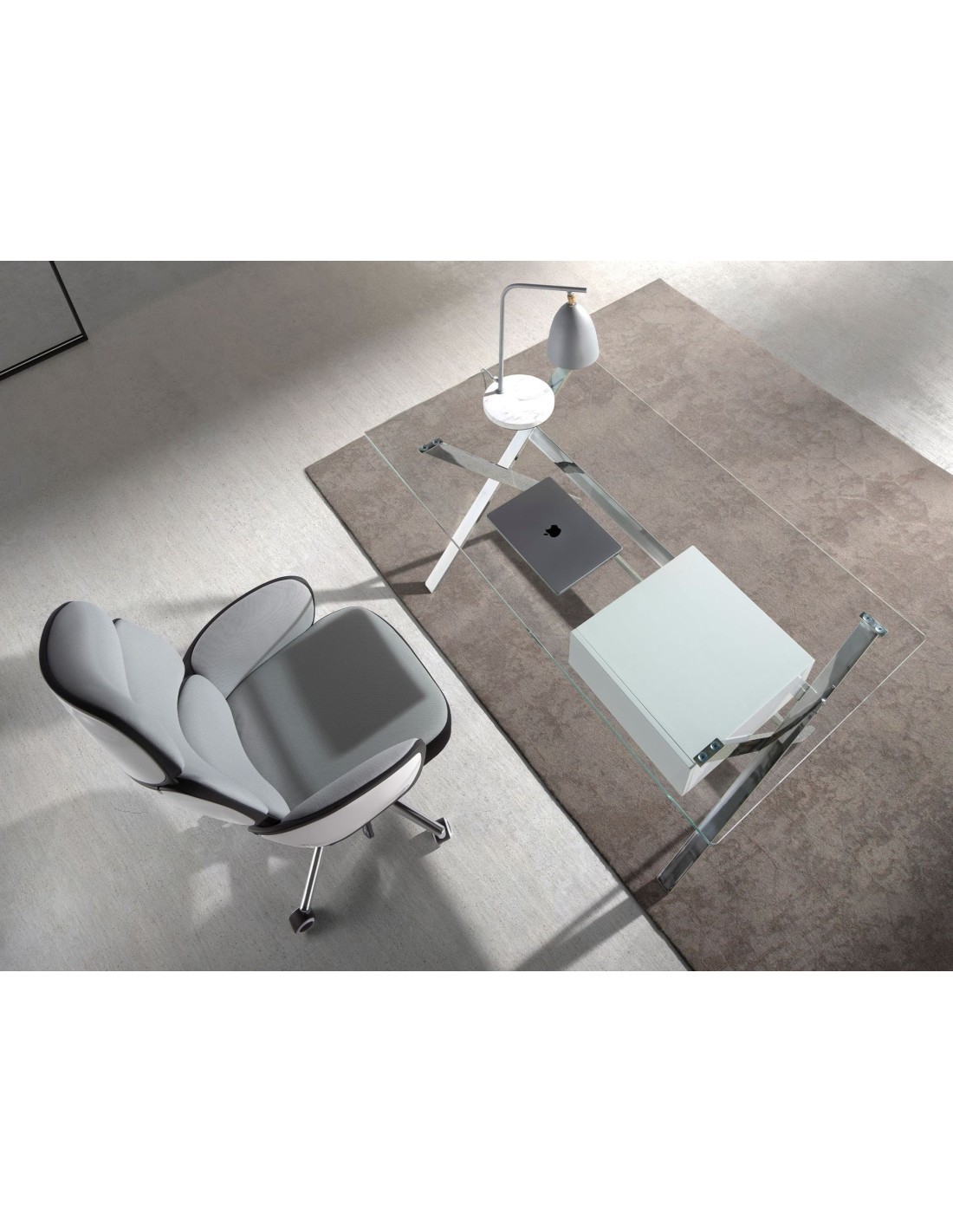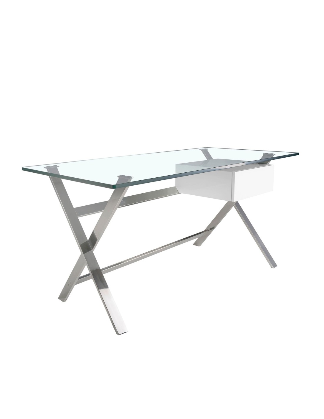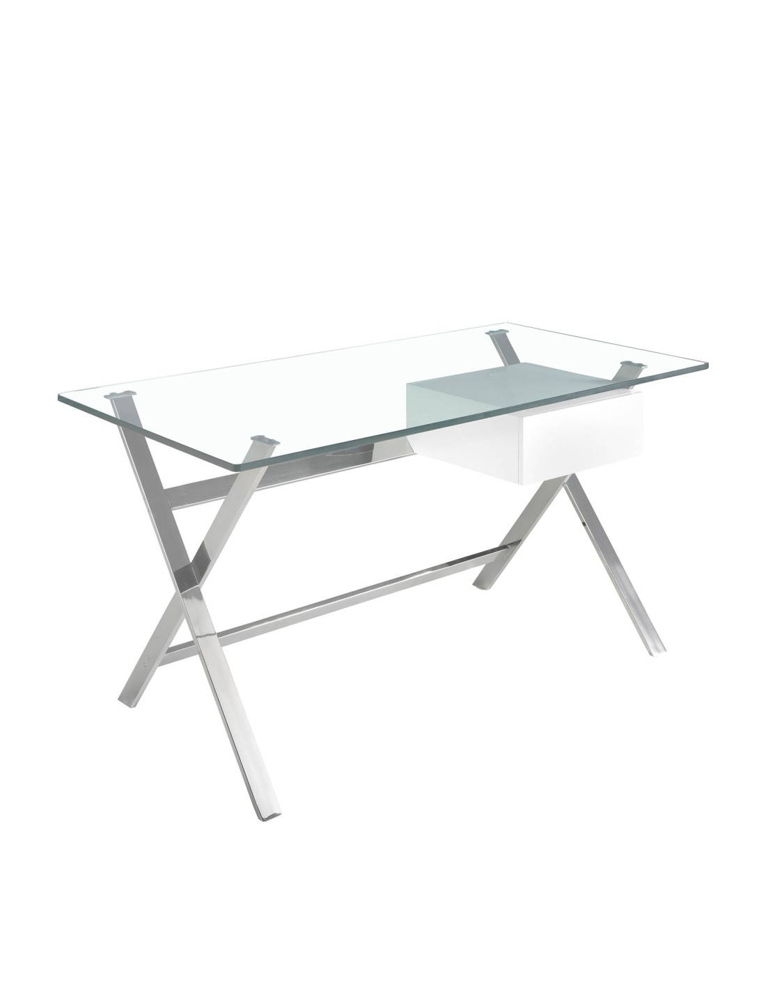Escritorio madera blanca y acero cromado con tapa de cristal templado