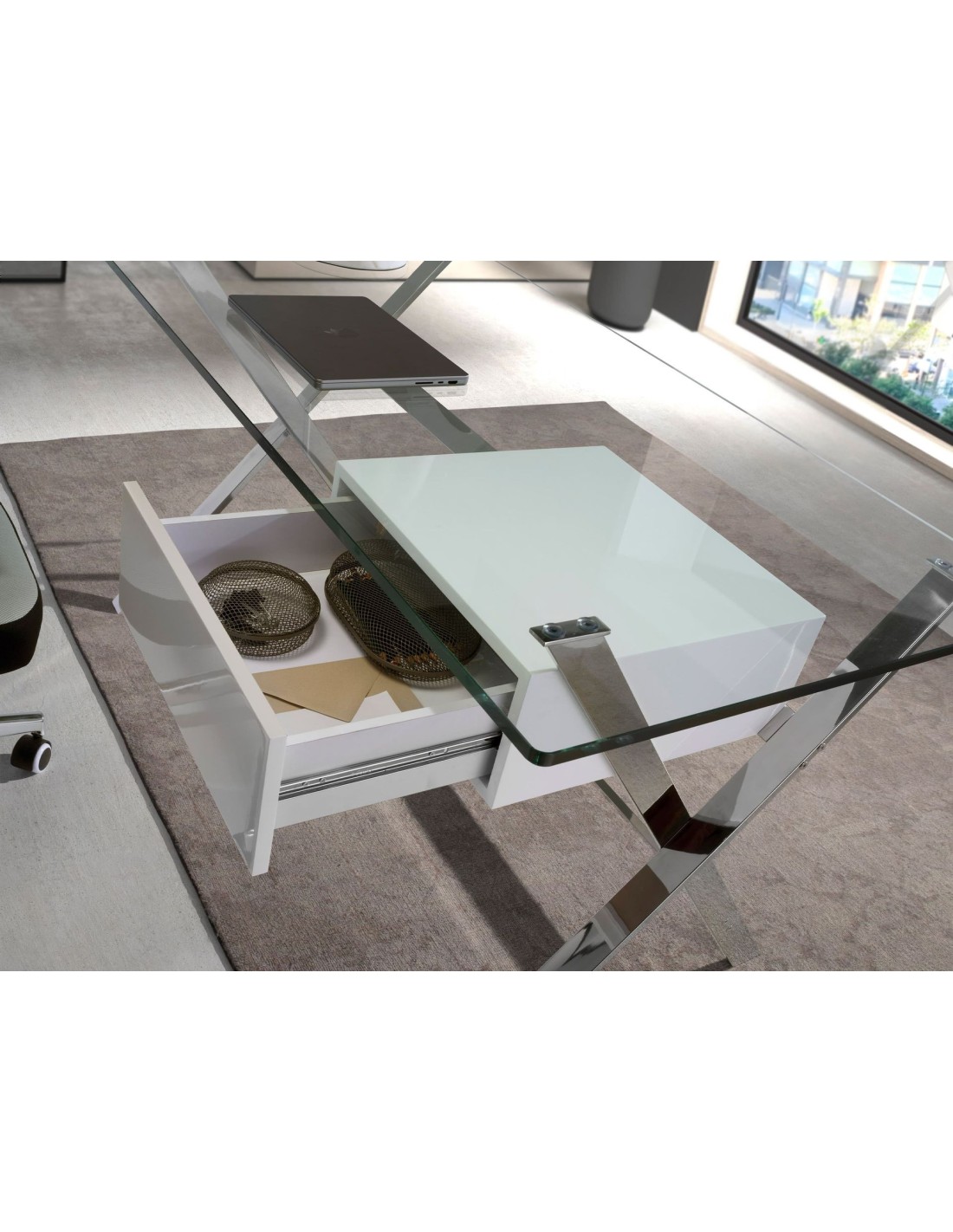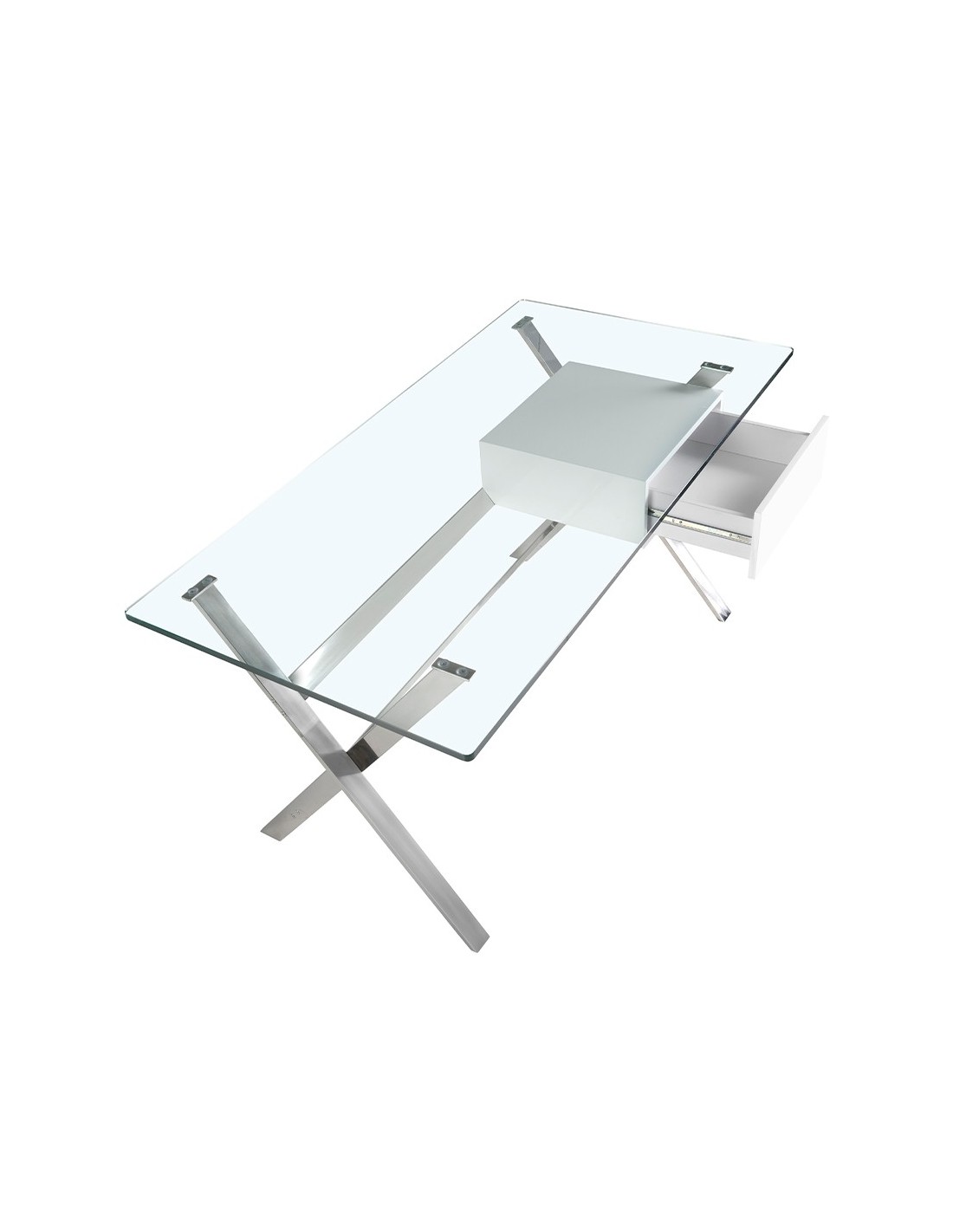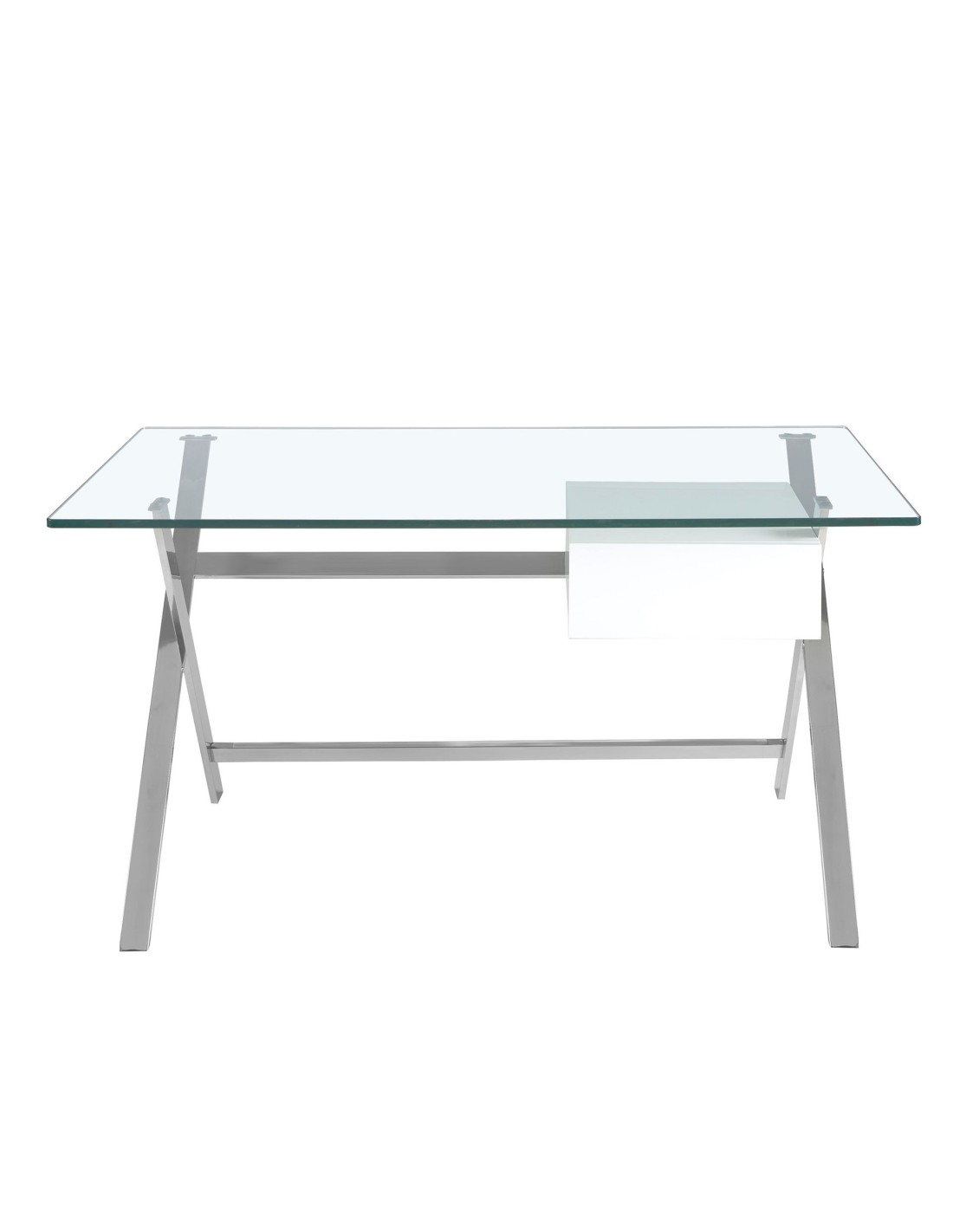 Escritorio madera blanca y acero cromado con tapa de cristal templado Escritorio de diseño moderno con tapa de cristal templado y estructura de madera de MDF color blanco. El diseño de sus patas de acero inoxidable cromado aportará un toque sofisticado y exclusivo a su estancia. Gracias a su amplio espacio de almacenaje con 1 cajón con sistema de apertura y cierre uñero, le permitirá mantener todo en orden y en su sitio. Medidas del producto: 145 x 75 x 75 cm.- Tanto por su diseño como por su tapa de cristal templado, este escritorio aportará amplitud y elegancia a su oficina, convirtiéndolo en una pieza clave en la decoración de su zona de trabajo. - El acero de sus patas, así como su diseño lineal, permite que encaje en cualquier espacio de su hogar. - Todos nuestros productos están fabricados con materiales de la más alta calidad, siendo además un elemento versátil y funcional para su zona de trabajo o vestidor. - Gracias a su cajón lateral, cuenta con espacio de almacenaje para poder guardar todo lo que necesite tener a mano para su día a día, manteniendo así el orden visual en la habitación.