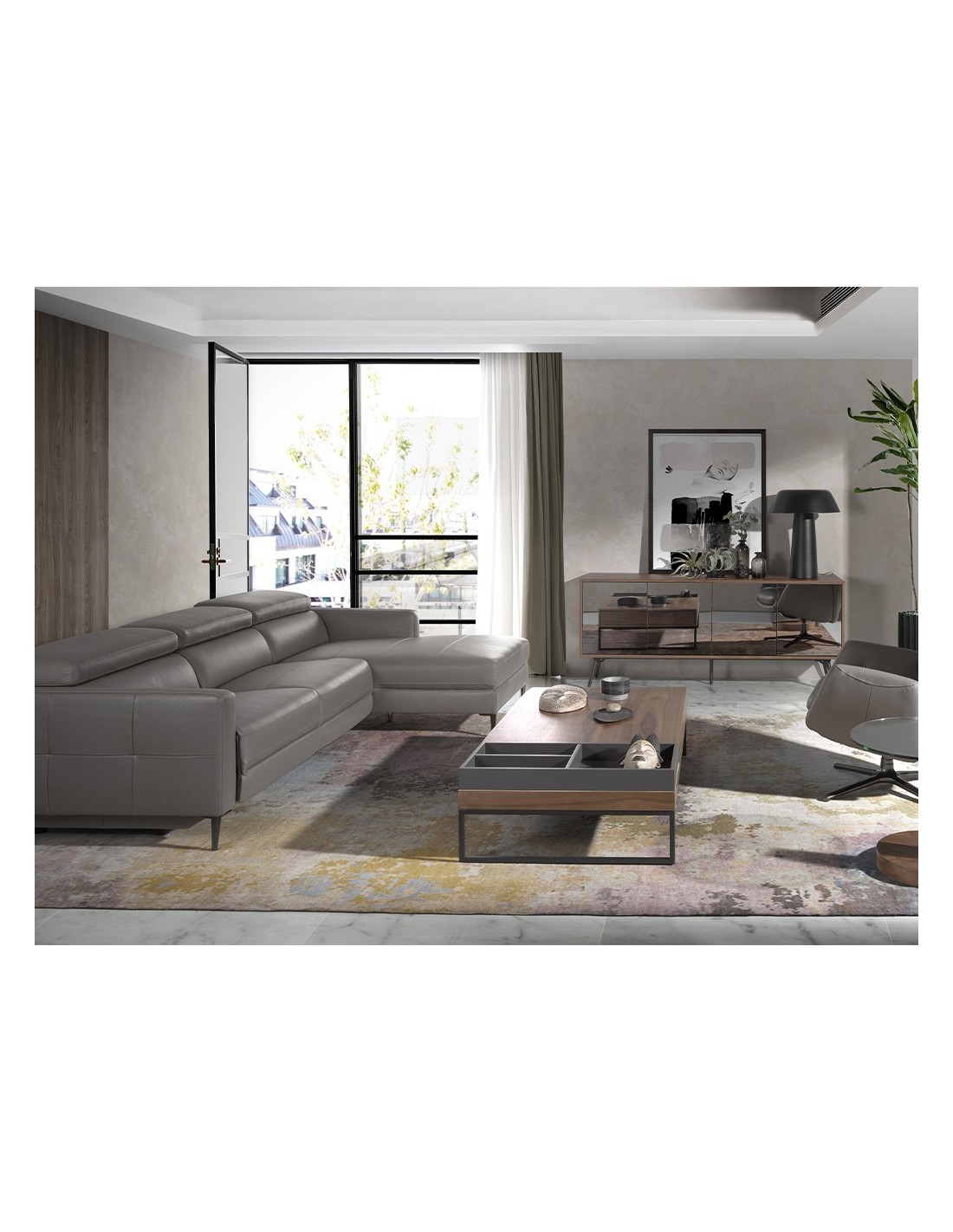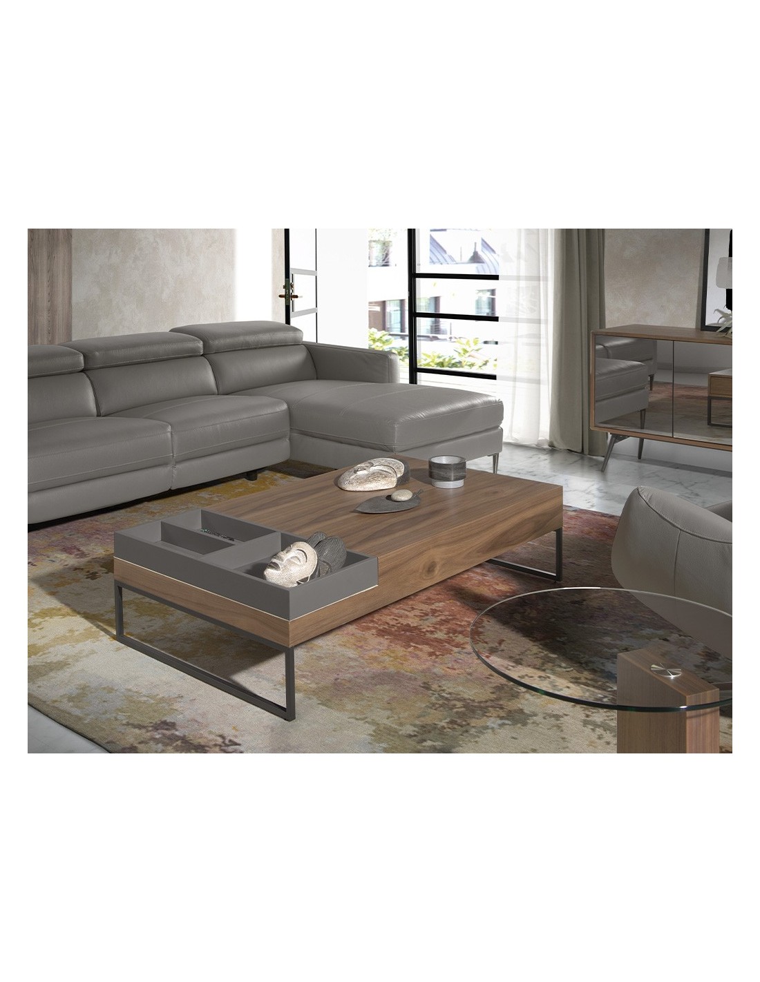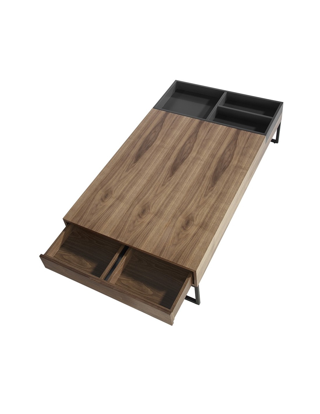 Mesa centro rectangular nogal y acero negro Mesa centro rectangular de diseño moderno fabricada en madera chapada en nogal natural. Su estructura de patas de acero inoxidable pintado en epoxi negro, aporta el toque de modernidad y vanguardia que busca para su hogar. Su original detalle en madera de MDF color gris oscuro en acabado mate aporta el toque de estilo ideal para tu salón. Cuenta con un amplio espacio de almacenaje con 1 cajón con sistema de apertura push and pull y cierre soft-closing. Medidas del producto: 140 x 80 x 35 cm.- La sencillez y la elegancia de la estructura de madera chapada en nogal natural de 0,5 mm de espesor de esta mesita, es perfecta para crear un ambiente moderno y repleto de estilo. - Fiel a las últimas tendencias en decoración, el acero negro le permitirá crear un espacio único, personal y con carácter. - Su diseño de líneas rectas le permitirá conseguir un ambiente de estilo vanguardista a la vez que sofisticado. - Tanto por su diseño como por su espacio de almacenaje, esta mesa auxiliar es perfecta para crear ambientes amplio y cálidos, a la vez que mantener todo en su sitio. - Su acabado en madera MDF lacada en color es perfecta para combinar con las últimas tendencias en decoración.