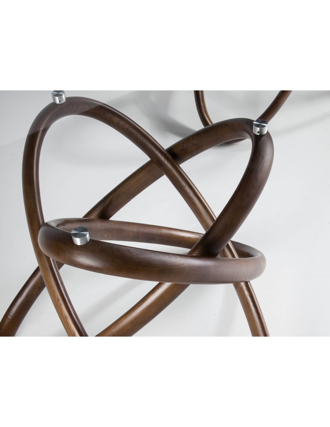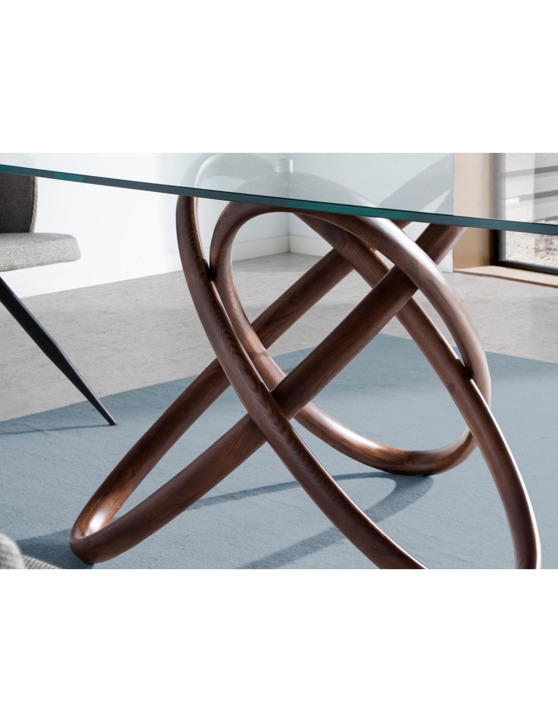 Mesa comedor ovalada medio punto cristal templado y nogal