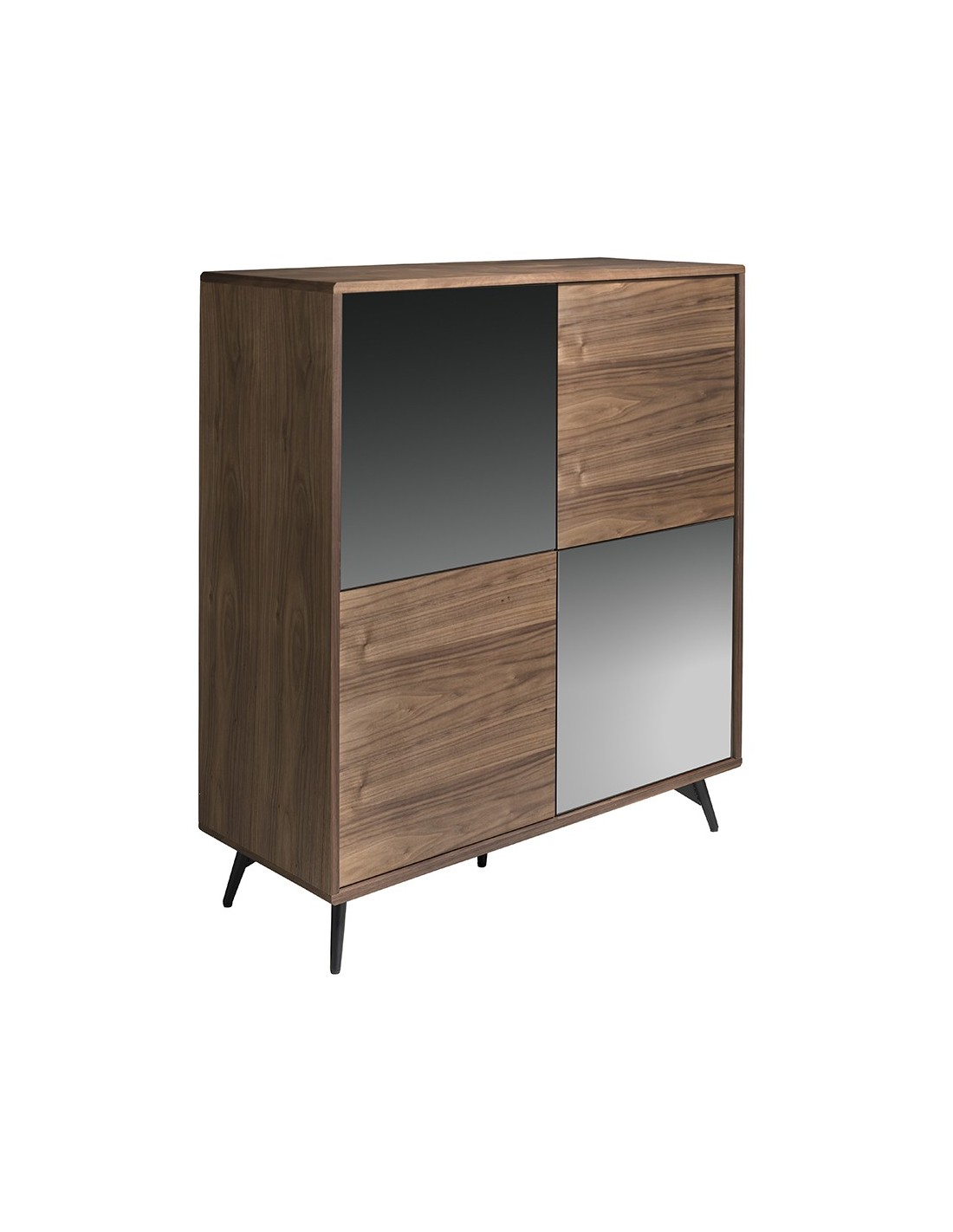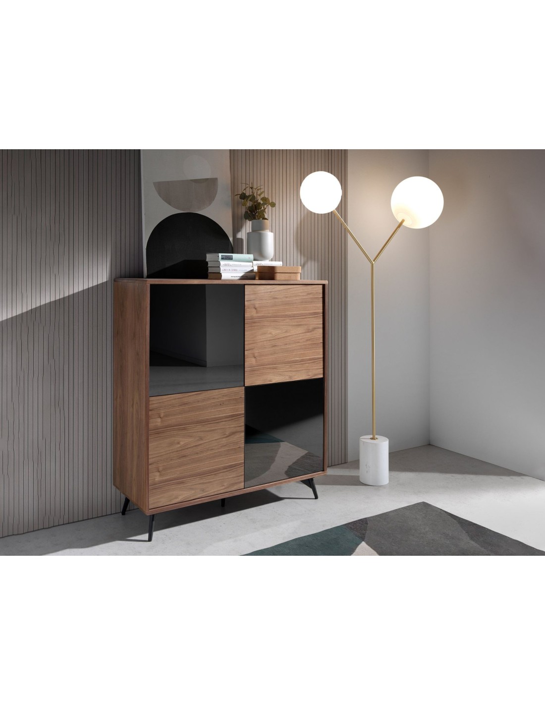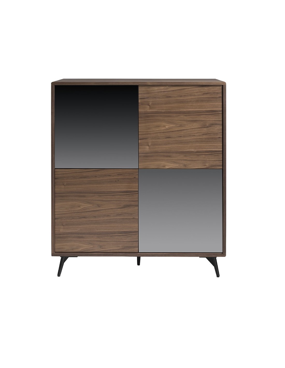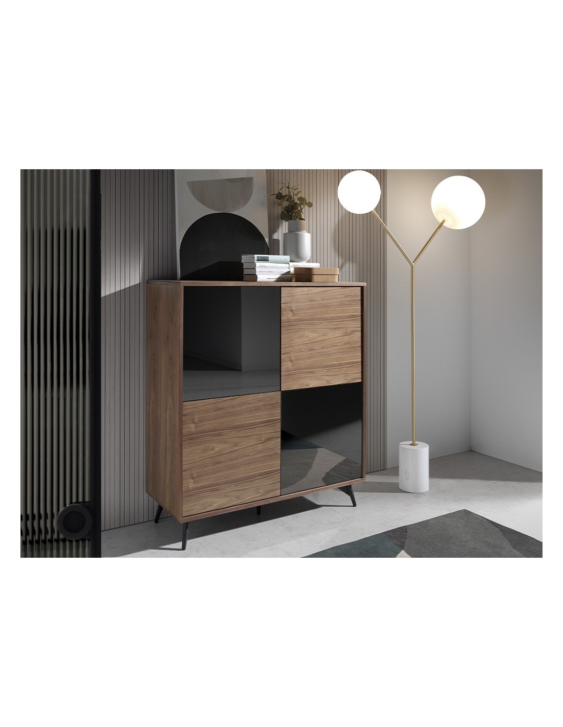 Aparador alto cristal negro efecto espejo, nogal y acero negro Aparador alto de diseño moderno con estructura de madera chapada en nogal natural y unas originales patas de acero inoxidable pintado en epoxi negro. Su original detalle en cristal de color negro efecto espejo aporta el toque de estilo ideal para tu salón. Cuenta con un amplio espacio de almacenaje con 4 puertas con sistema de apertura push and pull y cierre soft-closing. Medidas del producto: 110 x 45 x 124 cm.- Este elegante aparador de madera chapada en nogal natural de 0,5 mm de espesor, aportará el toque diferente y moderno que busca para su hogar. - Fiel a las últimas tendencias en decoración, gracias a sus patas en acero negro, conseguirá un ambiente con carácter, personalidad y de diseño moderno. - Por su diseño de líneas rectas, aportará un aire de calma y calidez a cualquier estancia. - Gracias a sus baldas de madera, podrá disfrutar de un amplio espacio para guardar su vajilla o menaje de mesa. - Práctico y funcional, gracias a su espacio de almacenaje podrá mantener todo en su sitio, eliminando ruido visual en su salón o comedor. - Sus puertas de cristal negro efecto espejo, le confieren un aire de exclusividad y distinción.