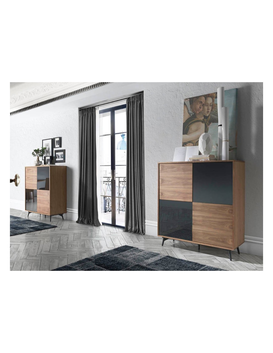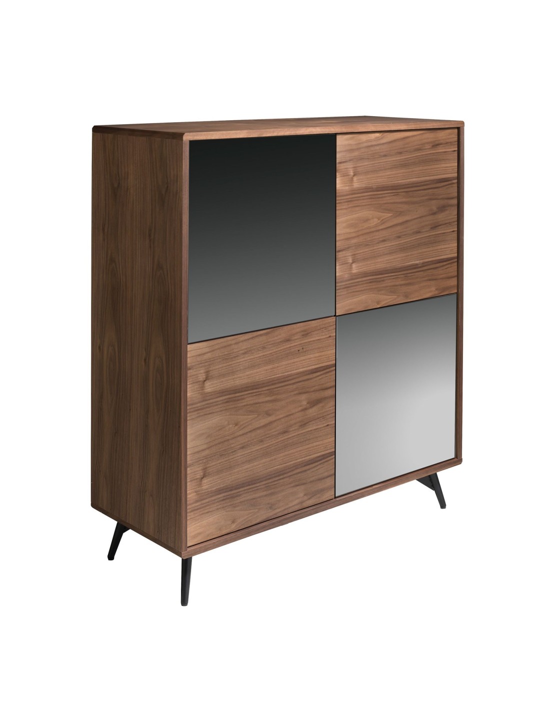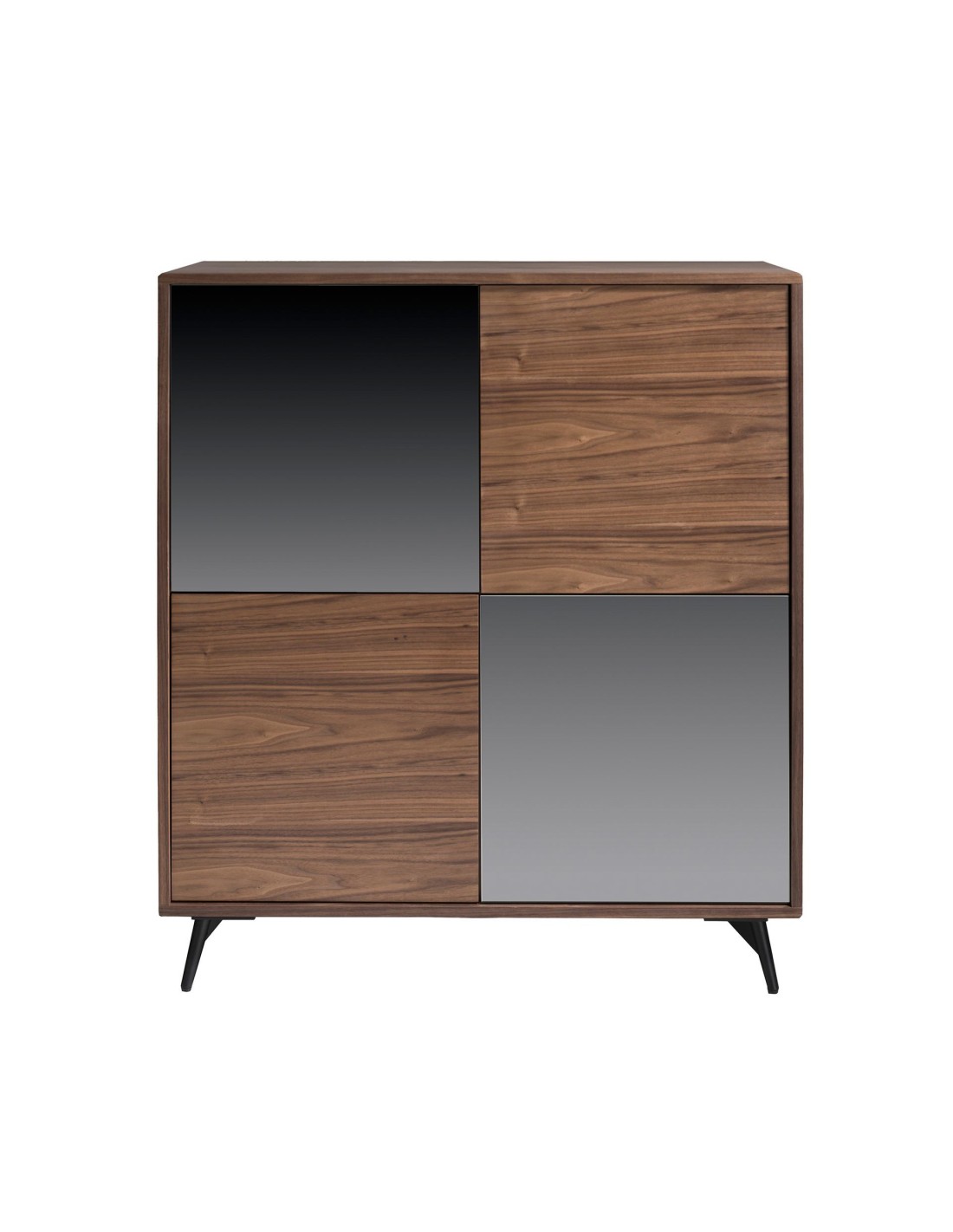 Aparador alto cristal negro efecto espejo, nogal y acero negro