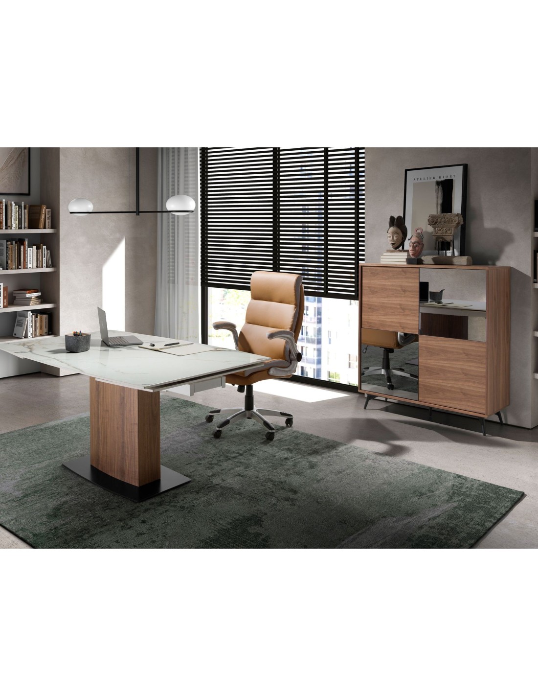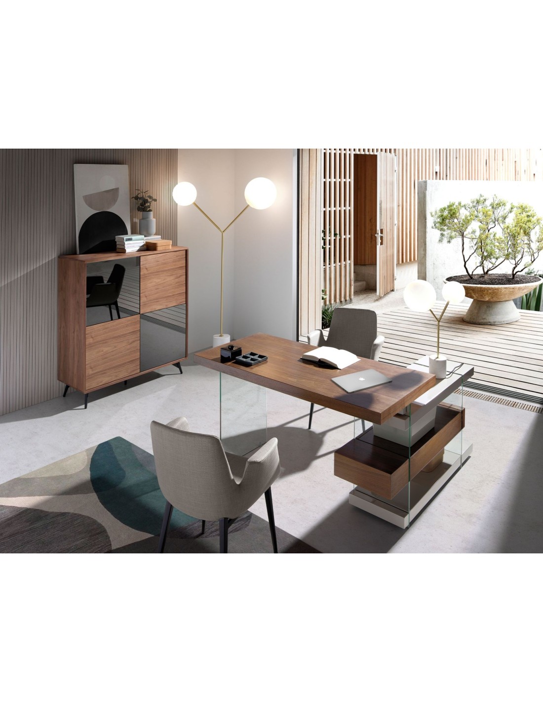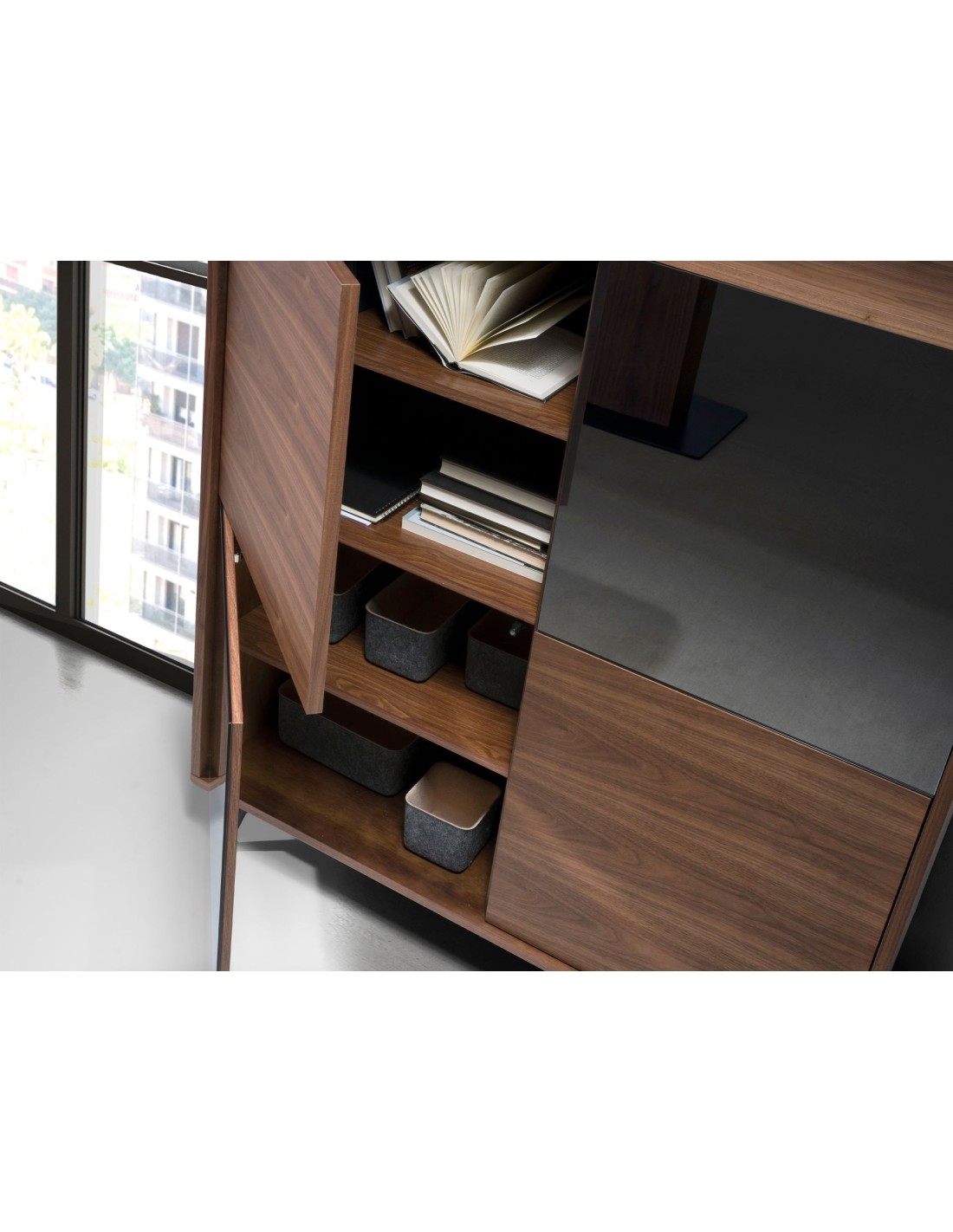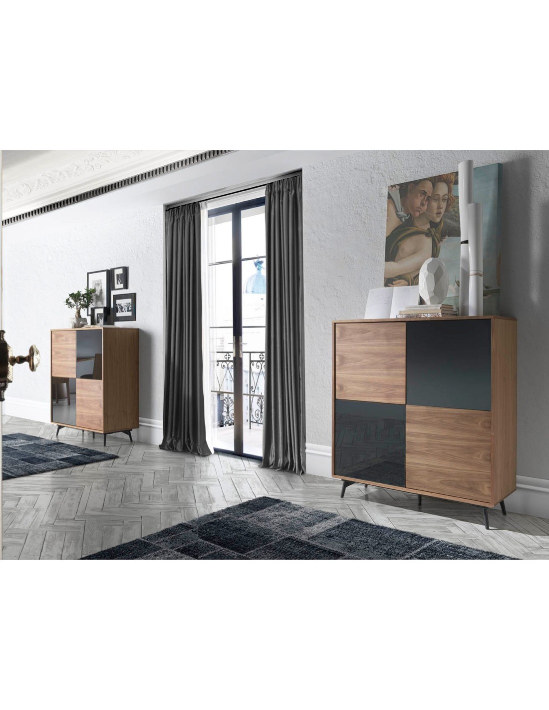 Aparador alto cristal negro efecto espejo, nogal y acero negro