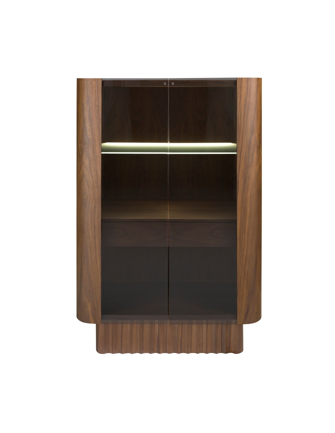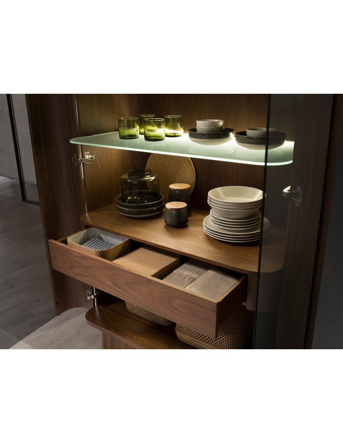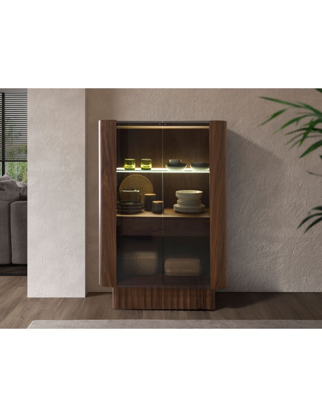 Aparador alto cristal templado, nogal con iluminación interior