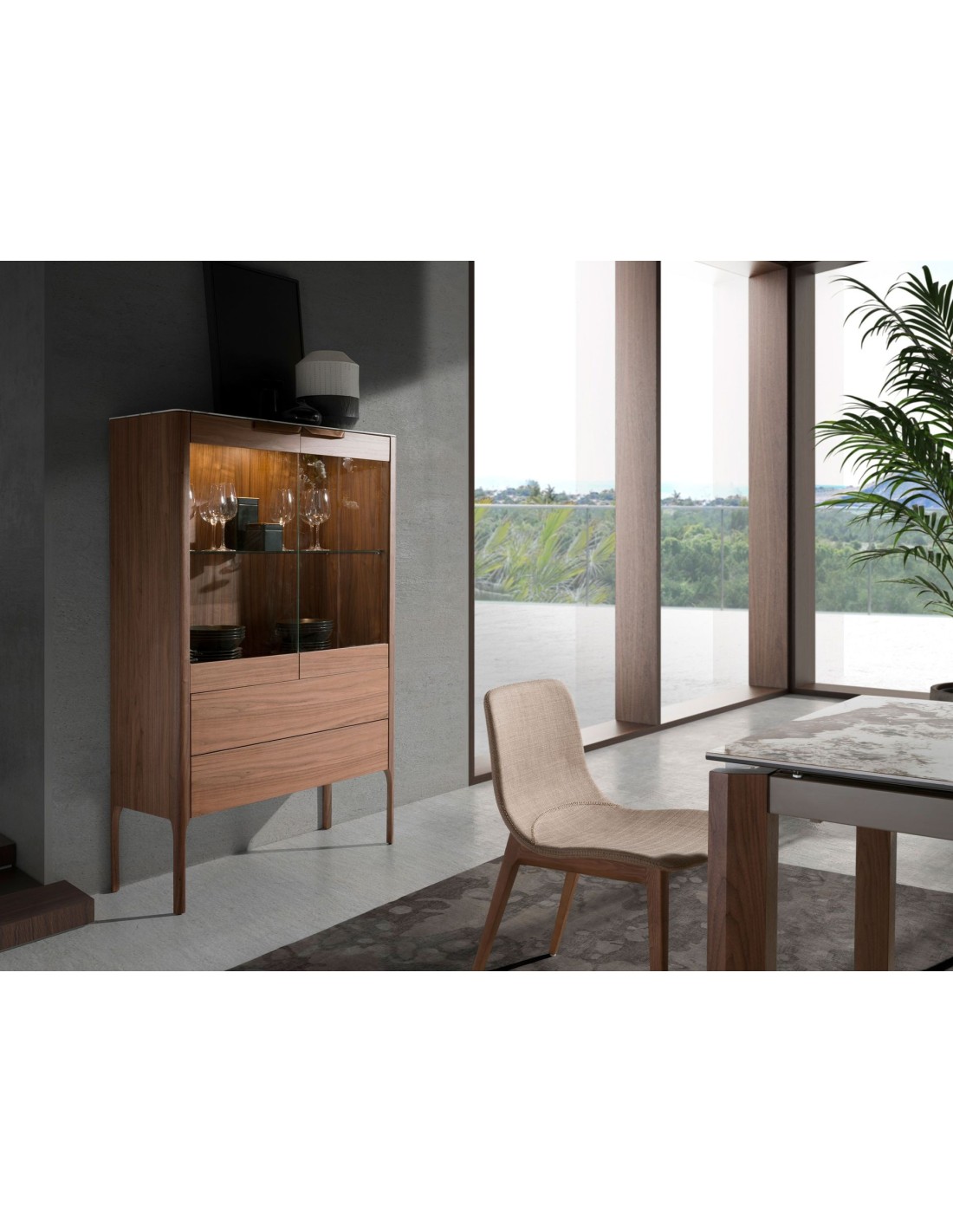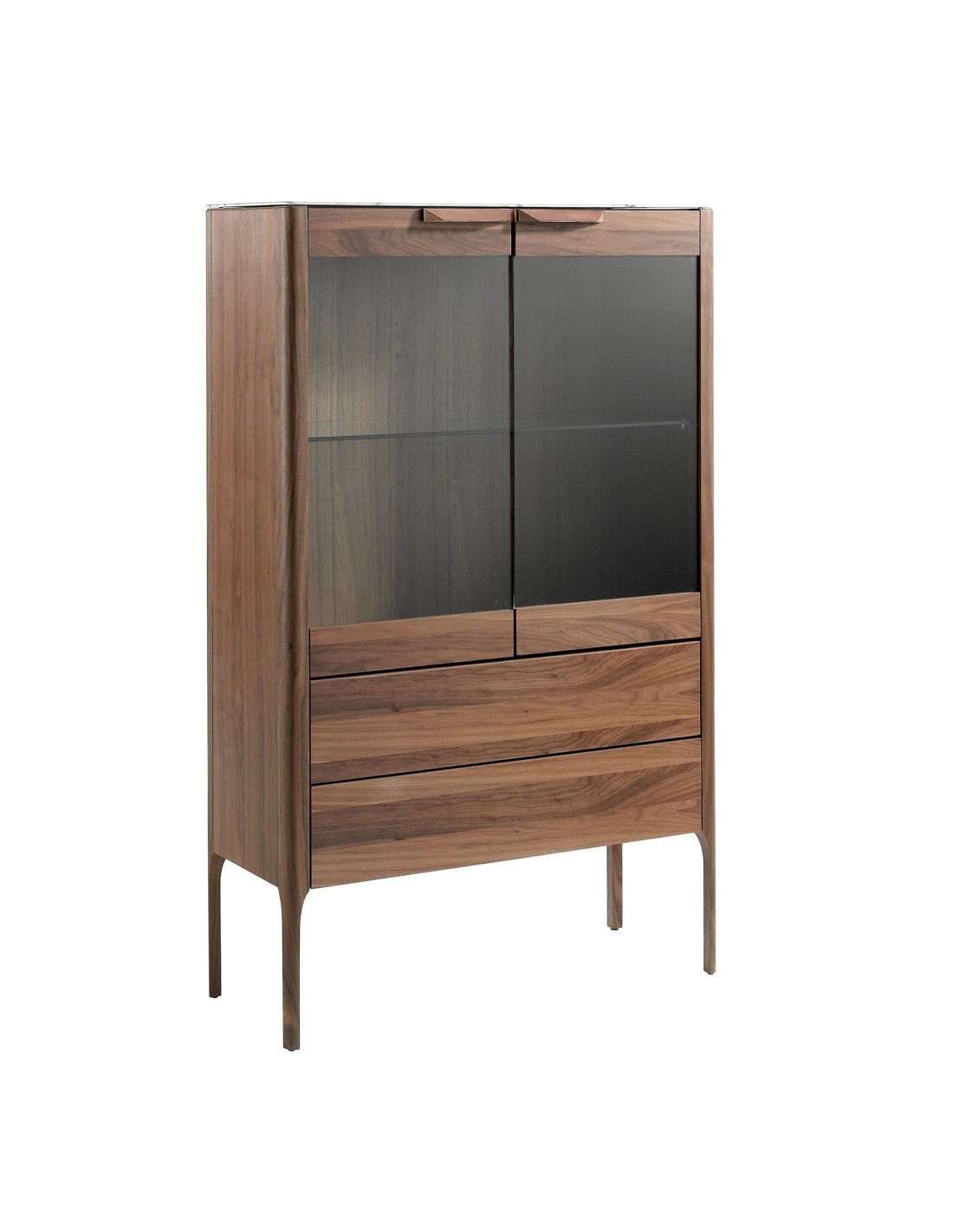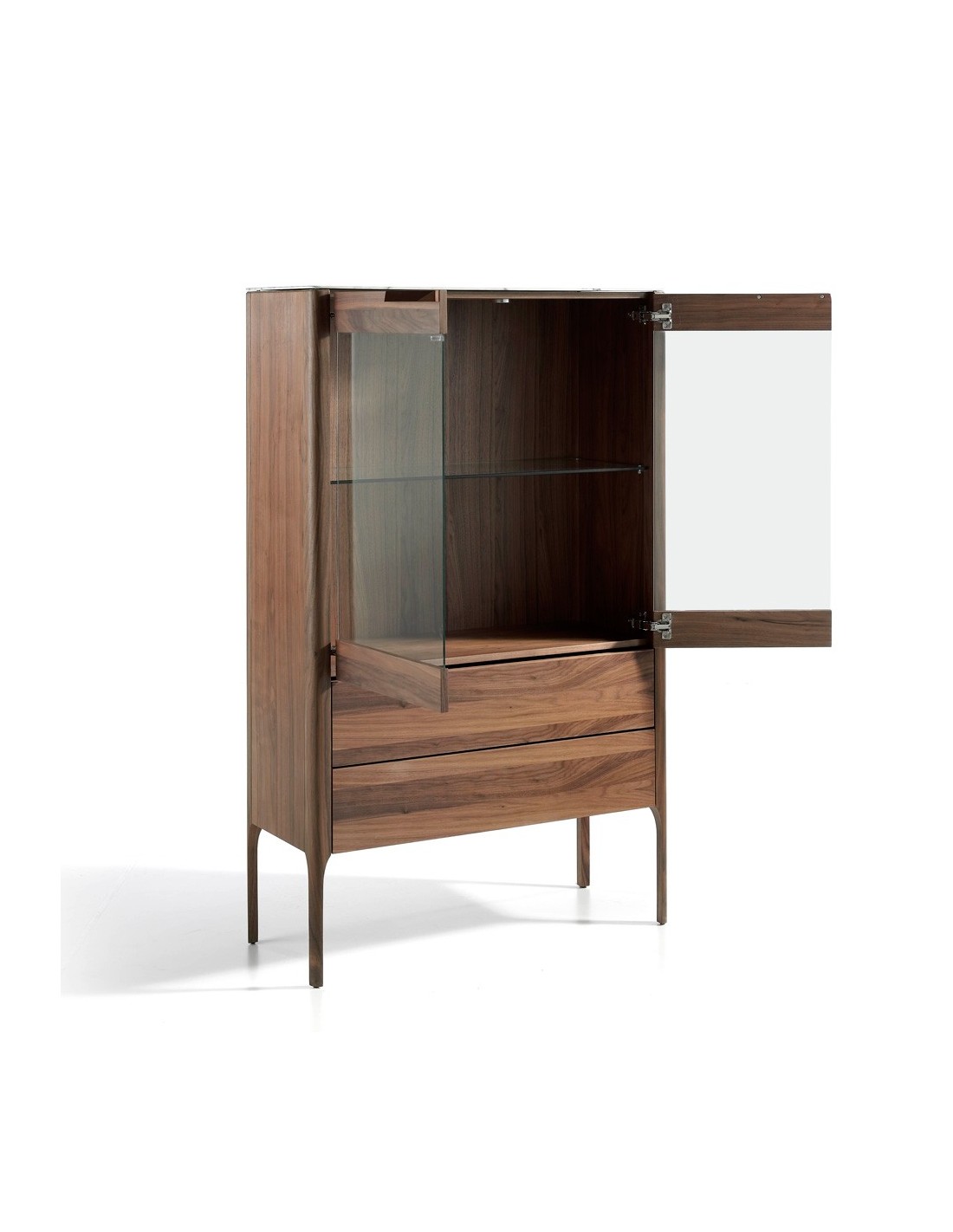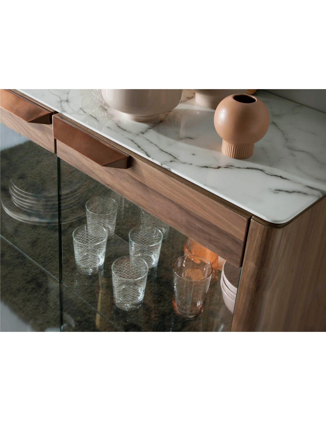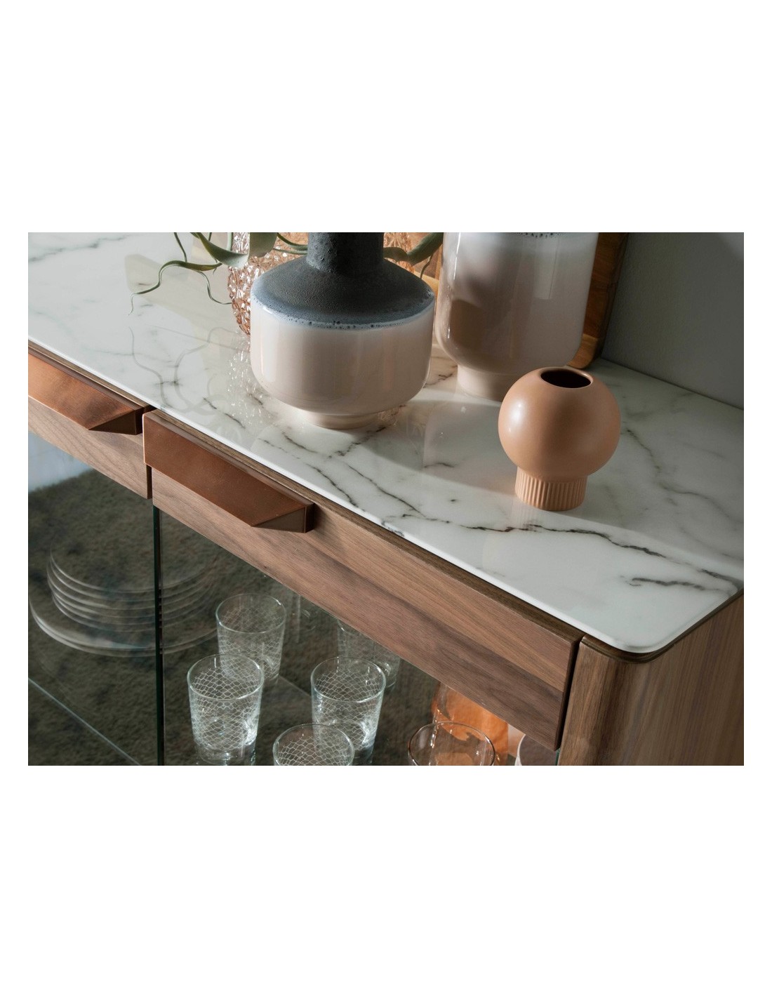 Aparador alto nogal con tapa de cristal imitación mármol e iluminación interior