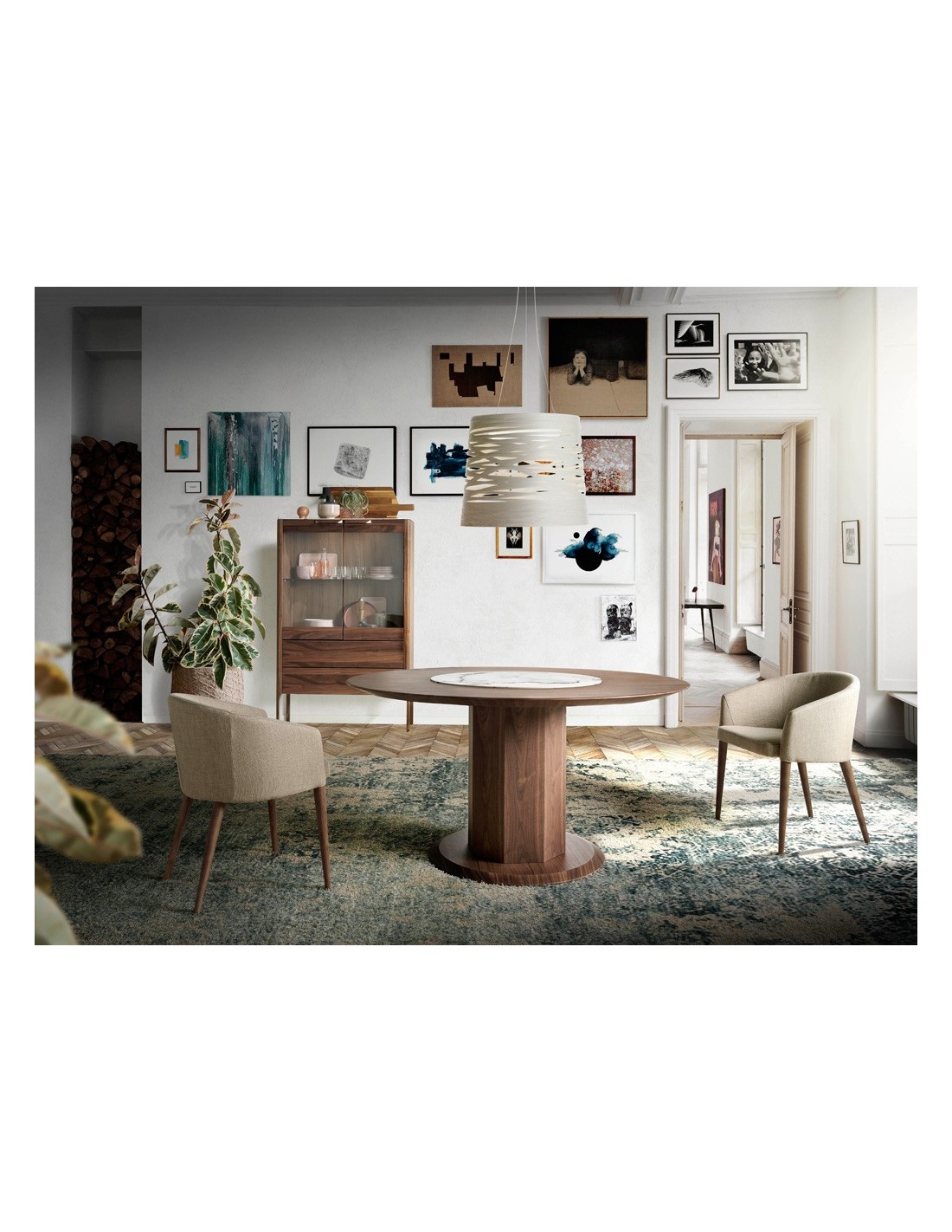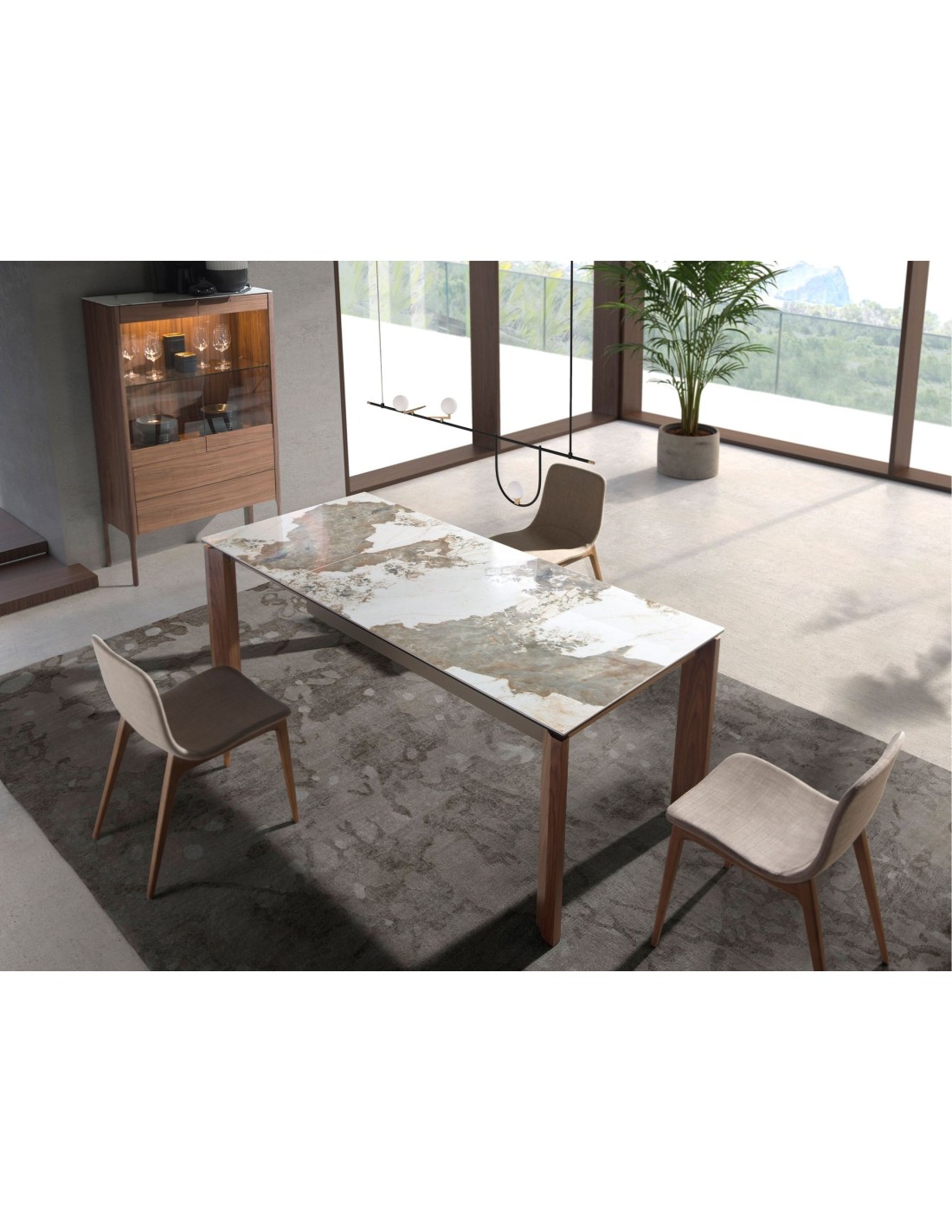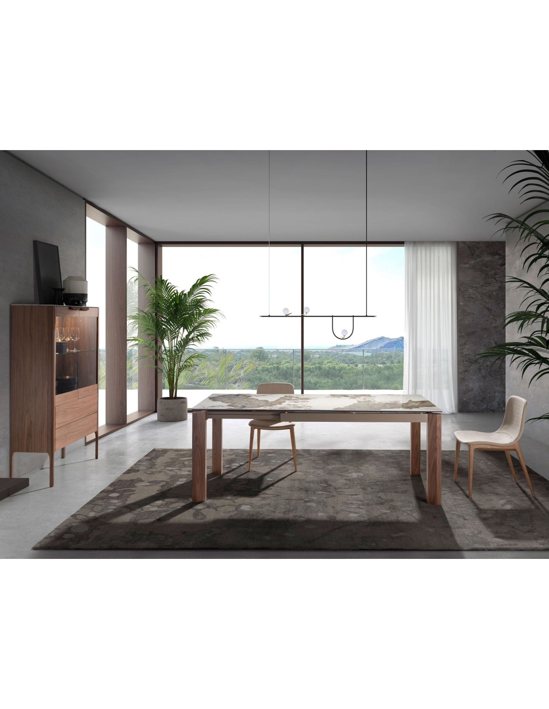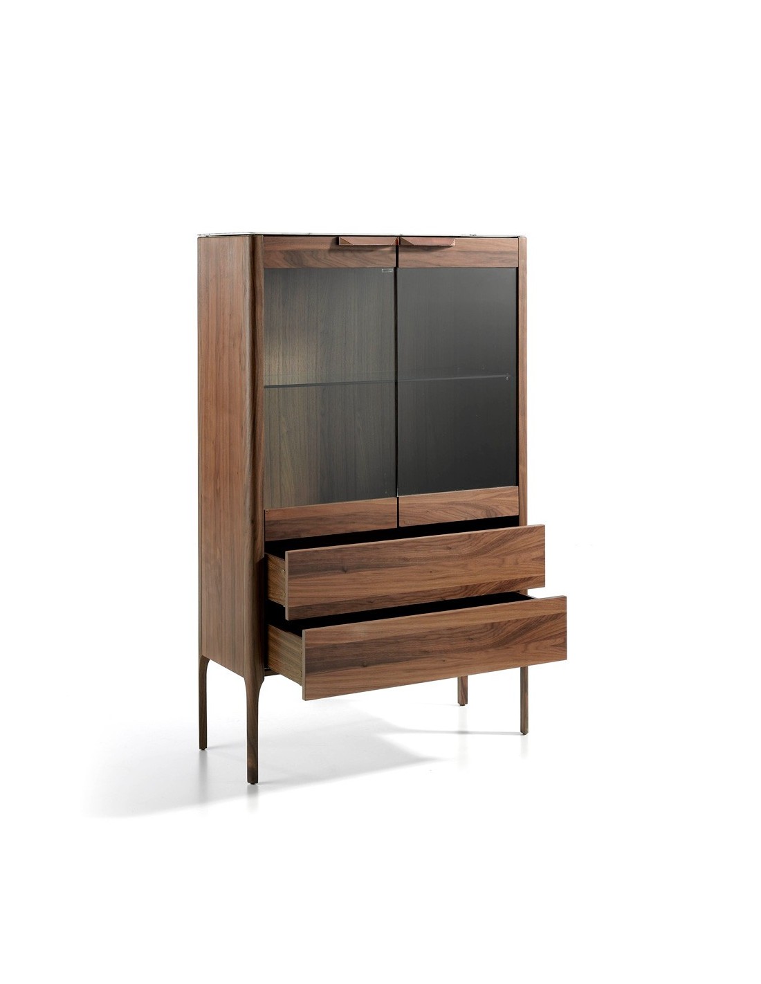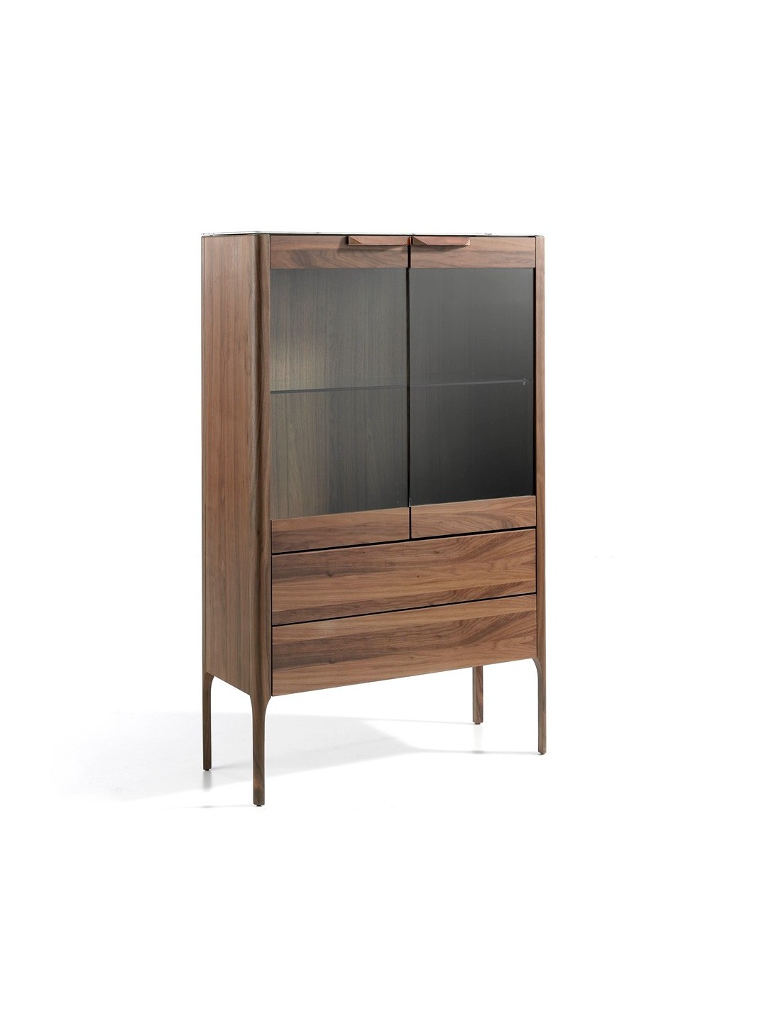 Aparador alto nogal con tapa de cristal imitación mármol e iluminación interior