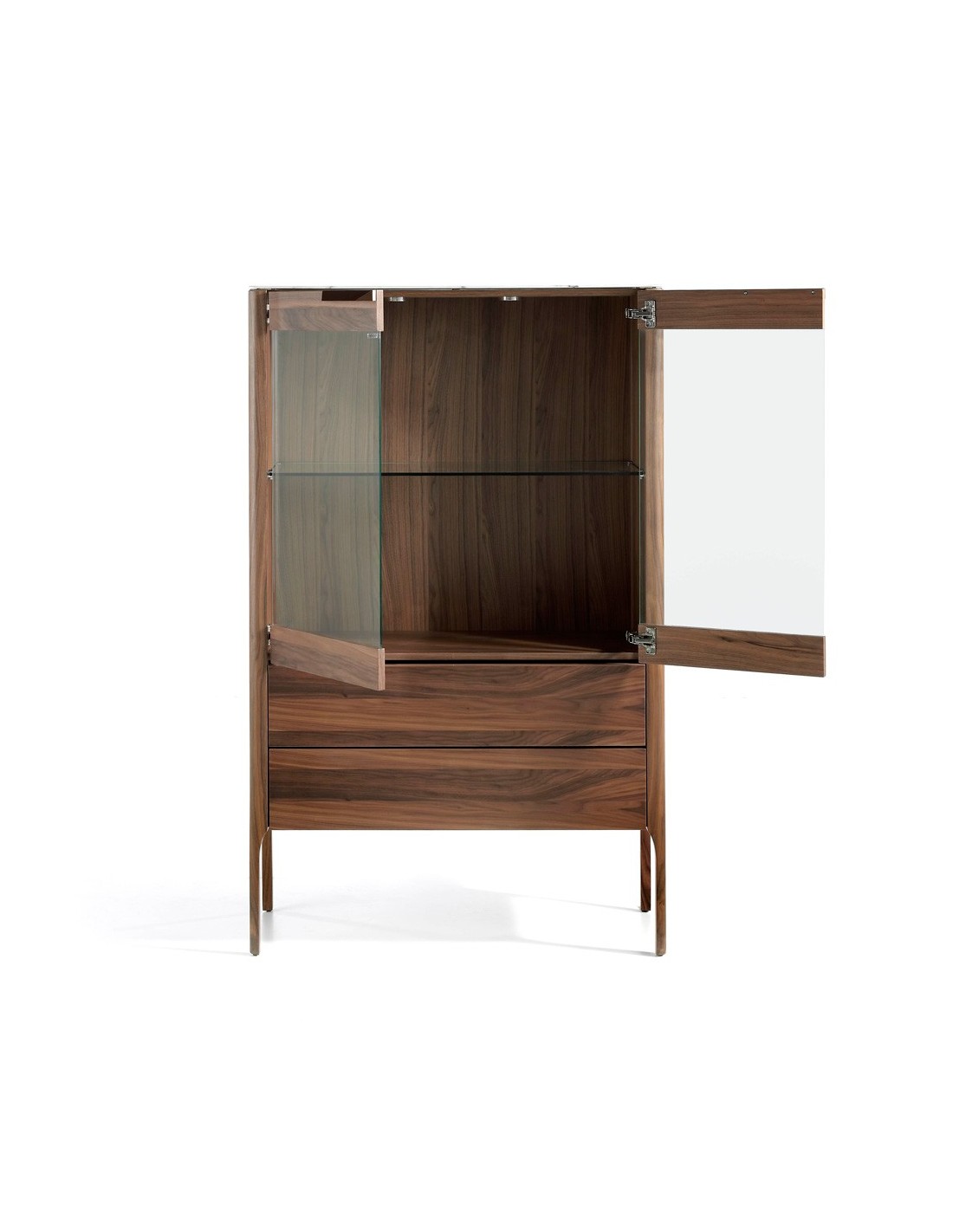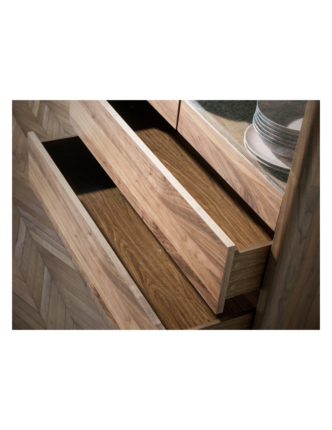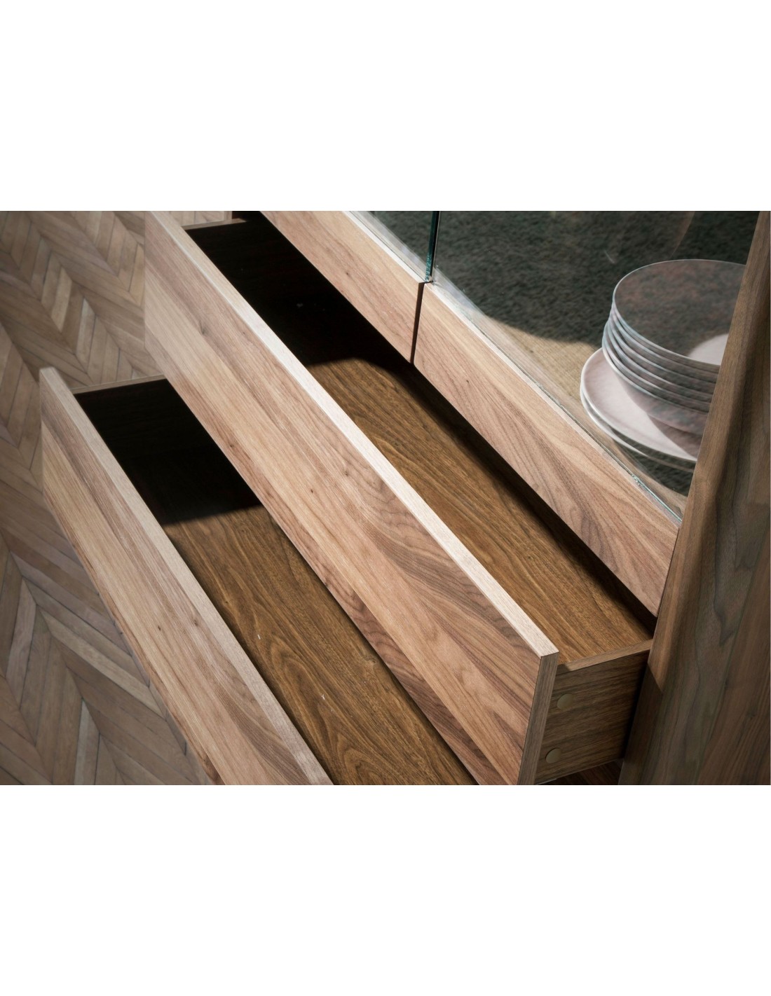 Aparador alto nogal con tapa de cristal imitación mármol e iluminación interior Aparador alto de diseño moderno con estructura de madera chapada en nogal natural y unas originales patas de madera chapada en nogal natural. La iluminación interior de este aparador alto le permitirá crear un ambiente cálido y relajado, a la vez que ofrece una mejor visión del interior del mueble. Gracias a su elegante tapa de cristal imitación mármol porcelánico color blanco con vetas grises en acabado brillo, conseguirá el look sofisticado que busca para sus estancias. Su original detalle en cristal templado aporta el toque de estilo ideal para tu salón. Cuenta con un amplio espacio de almacenaje con 2 cajones con sistema de apertura push and pull y cierre soft-closing, y 2 puertas con sistema de apertura tirador de lengüeta y cierre soft-closing. Medidas del producto: 99 x 40 x 161 cm.- Un aparador elegante y sofisticado de madera chapada en nogal natural de 0,5 mm de espesor con el que conseguirá el toque de modernidad y calidez que busca para su salón o comedor. - Versátil y funcional, su diseño permite que encaje en cualquier ambiente, convirtiéndose en un elemento clave de la decoración de su hogar. - Gracias a su balda de cristal extraíble y ajustable en altura, podrá disfrutar de un amplio espacio para guardar su vajilla o menaje de mesa. - Práctico y funcional, gracias a su espacio de almacenaje podrá mantener todo en su sitio, eliminando ruido visual en su salón o comedor. - Su diseño con puertas de cristal templado, lo convierte en un mueble auxiliar único, versátil y adaptable para diferentes espacios de su hogar.