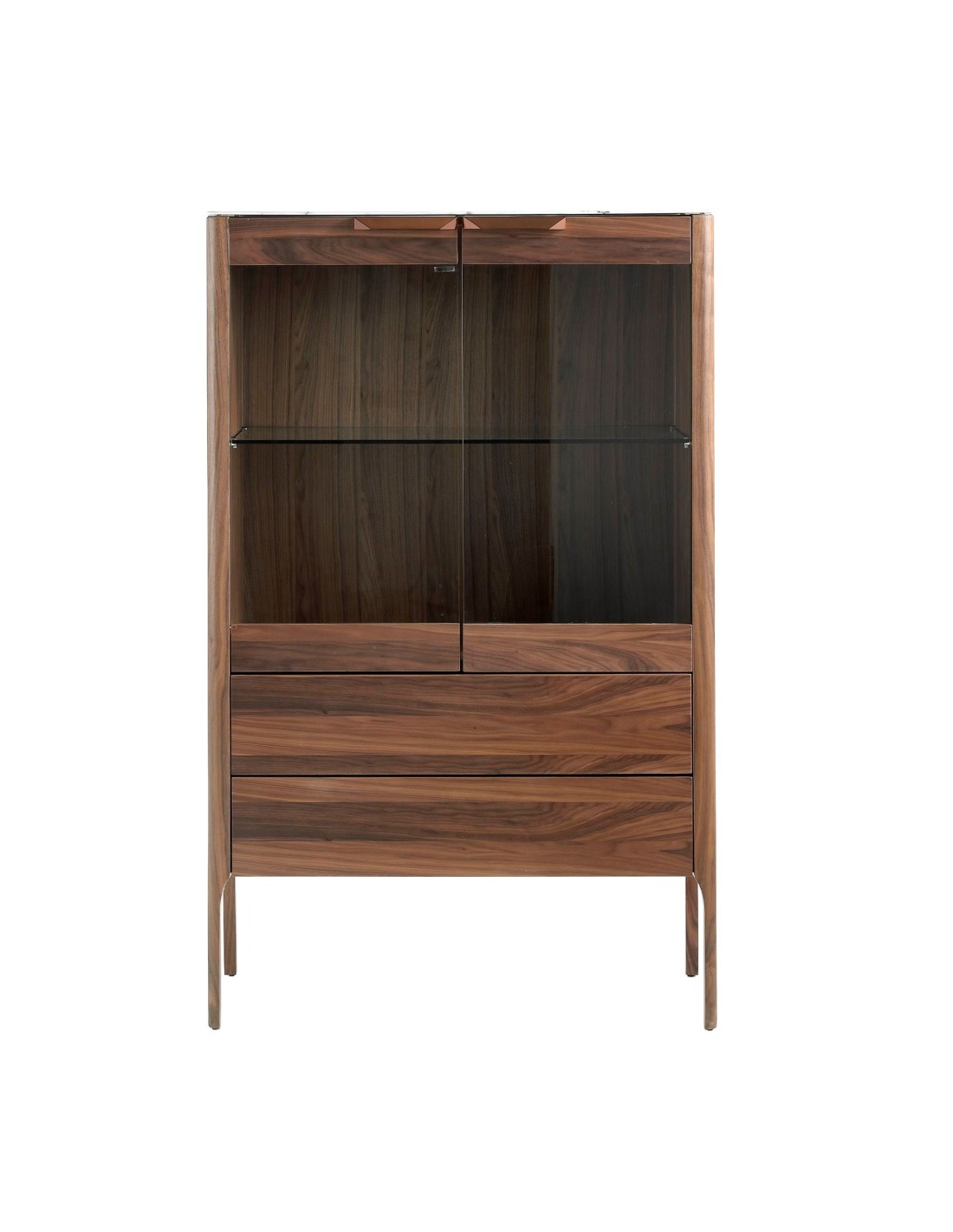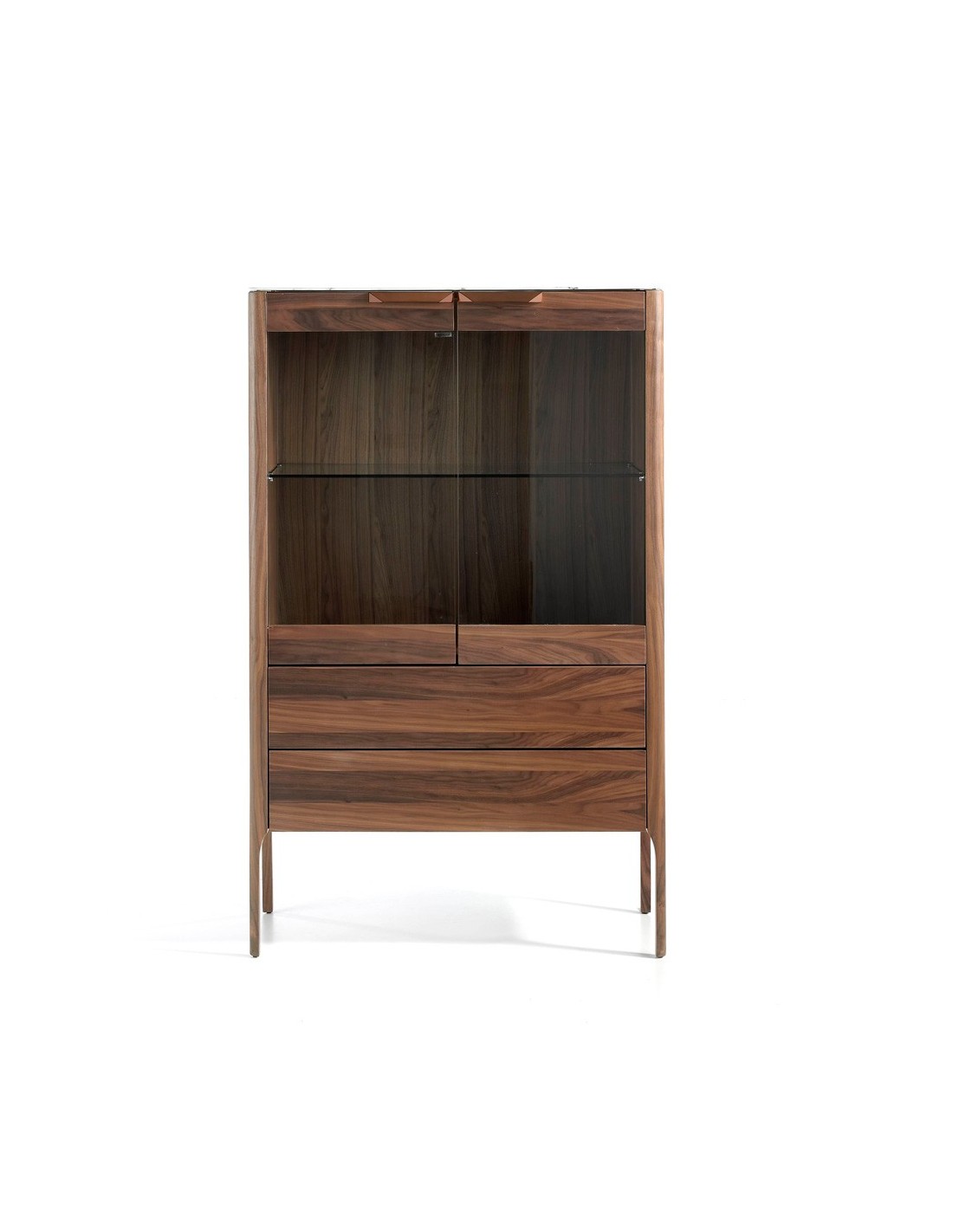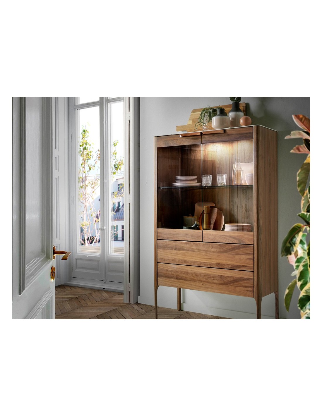 Aparador alto nogal con tapa de cristal imitación mármol e iluminación interior Aparador alto de diseño moderno con estructura de madera chapada en nogal natural y unas originales patas de madera chapada en nogal natural. La iluminación interior de este aparador alto le permitirá crear un ambiente cálido y relajado, a la vez que ofrece una mejor visión del interior del mueble. Gracias a su elegante tapa de cristal imitación mármol porcelánico color blanco con vetas grises en acabado brillo, conseguirá el look sofisticado que busca para sus estancias. Su original detalle en cristal templado aporta el toque de estilo ideal para tu salón. Cuenta con un amplio espacio de almacenaje con 2 cajones con sistema de apertura push and pull y cierre soft-closing, y 2 puertas con sistema de apertura tirador de lengüeta y cierre soft-closing. Medidas del producto: 99 x 40 x 161 cm.- Un aparador elegante y sofisticado de madera chapada en nogal natural de 0,5 mm de espesor con el que conseguirá el toque de modernidad y calidez que busca para su salón o comedor. - Versátil y funcional, su diseño permite que encaje en cualquier ambiente, convirtiéndose en un elemento clave de la decoración de su hogar. - Gracias a su balda de cristal extraíble y ajustable en altura, podrá disfrutar de un amplio espacio para guardar su vajilla o menaje de mesa. - Práctico y funcional, gracias a su espacio de almacenaje podrá mantener todo en su sitio, eliminando ruido visual en su salón o comedor. - Su diseño con puertas de cristal templado, lo convierte en un mueble auxiliar único, versátil y adaptable para diferentes espacios de su hogar.