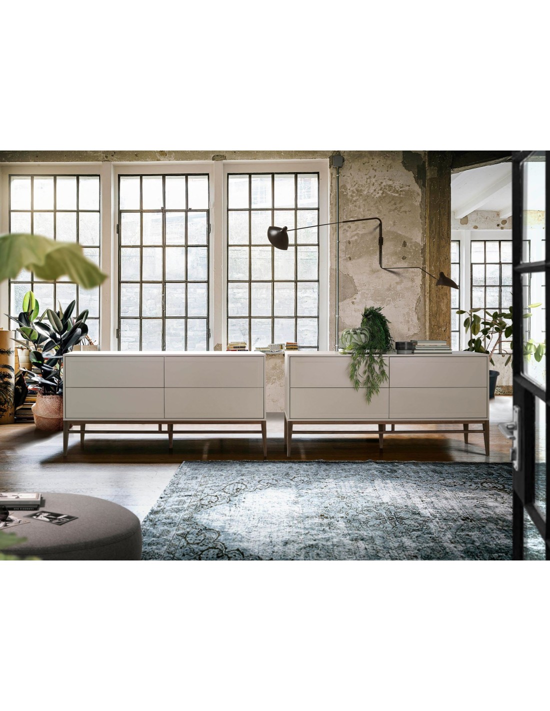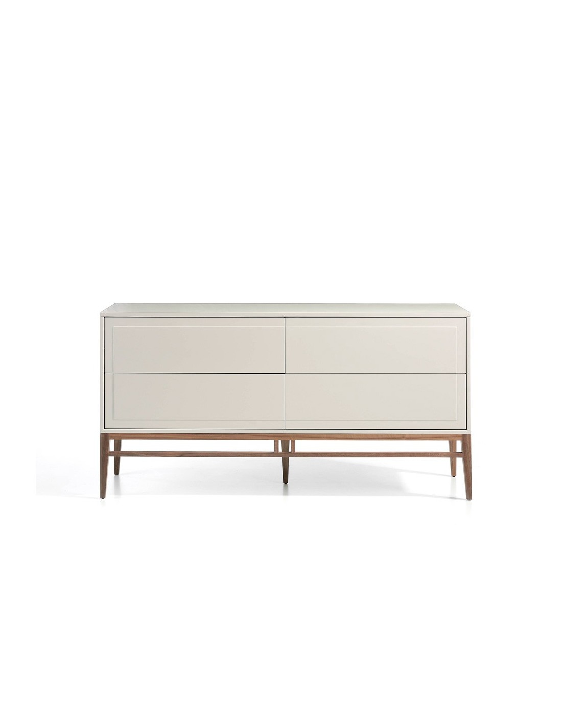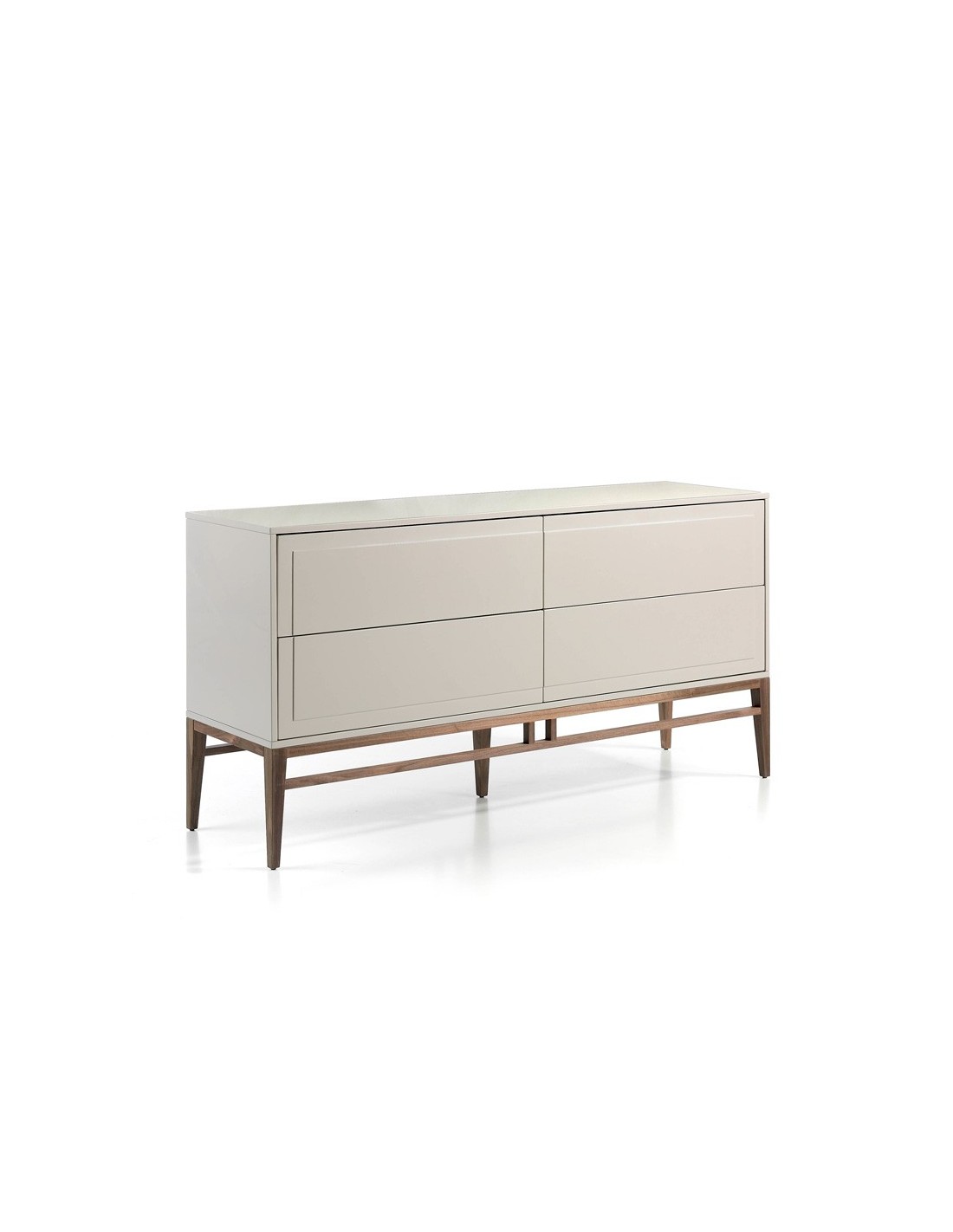 Aparador madera beige y nogal Aparador de diseño moderno con estructura de madera de MDF color beige y unas originales patas de madera chapada en nogal natural. Cuenta con un amplio espacio de almacenaje con 4 cajones con sistema de apertura push and pull y cierre soft-closing. Medidas del producto: 160 x 45 x 80 cm.- Gracias a su acabado lacado, este aparador es ideal para crear un ambiente con carácter y personalidad, sin dejar de lado la parte más funcional y práctica para el día a día. - La robusta estructura de patas de madera chapada en nogal natural aporta el toque de calidez. - Versátil y funcional, su diseño permite que encaje en cualquier ambiente, convirtiéndose en un elemento clave de la decoración de su hogar. - Tanto por su tamaño como por su gran espacio de almacenaje es ideal para mantener todo en orden y en su sitio.