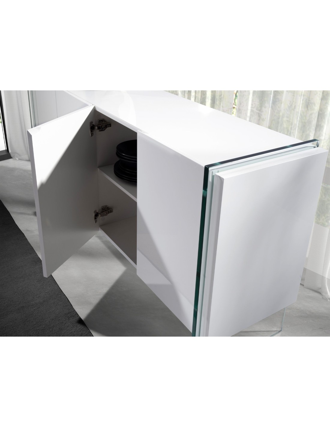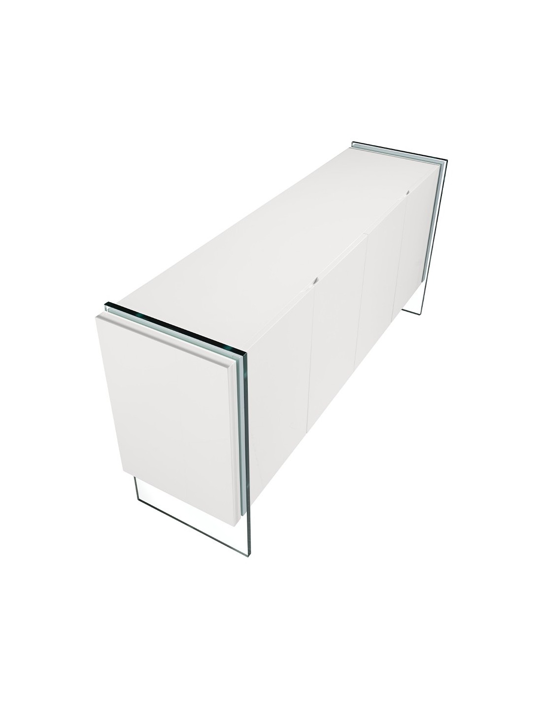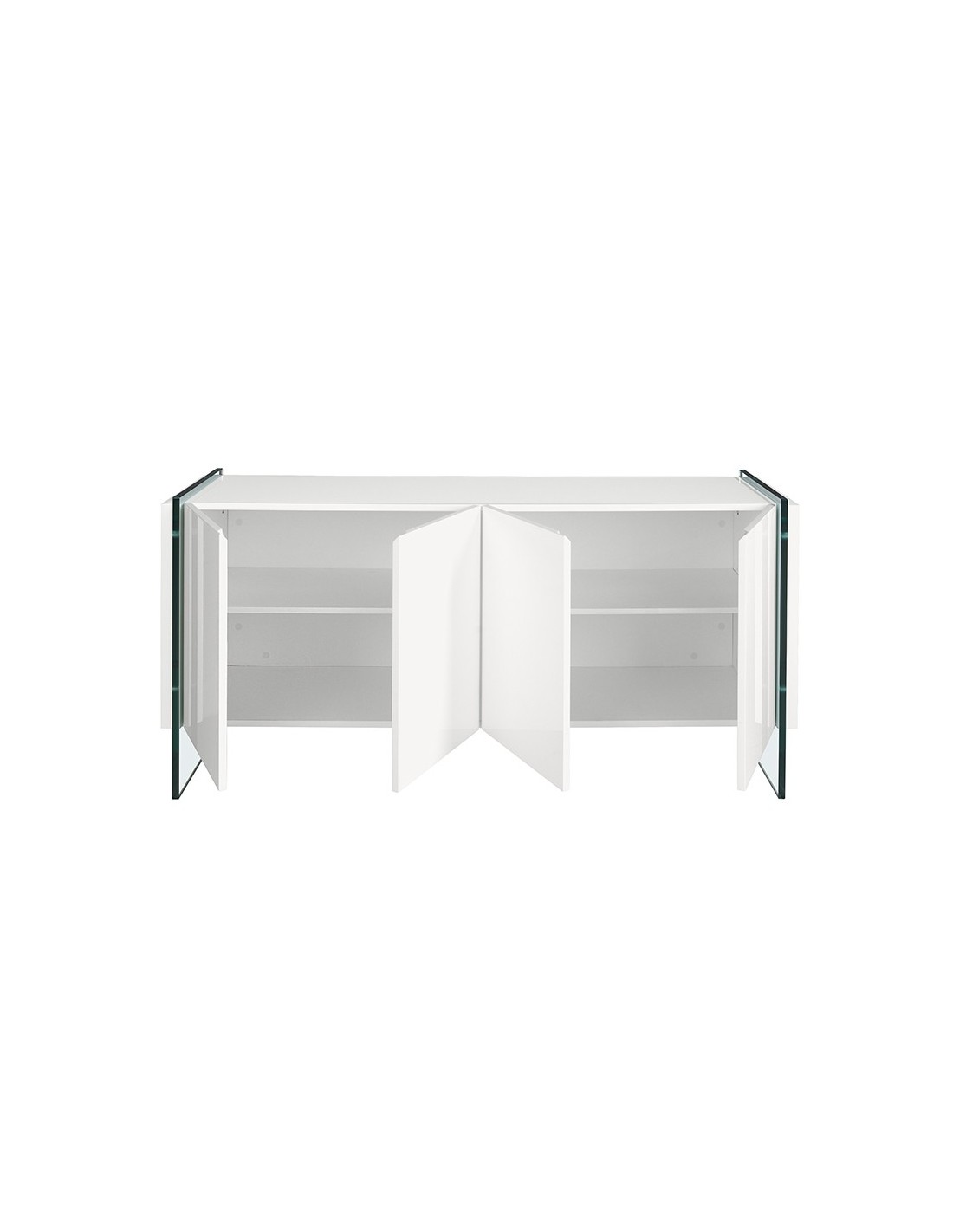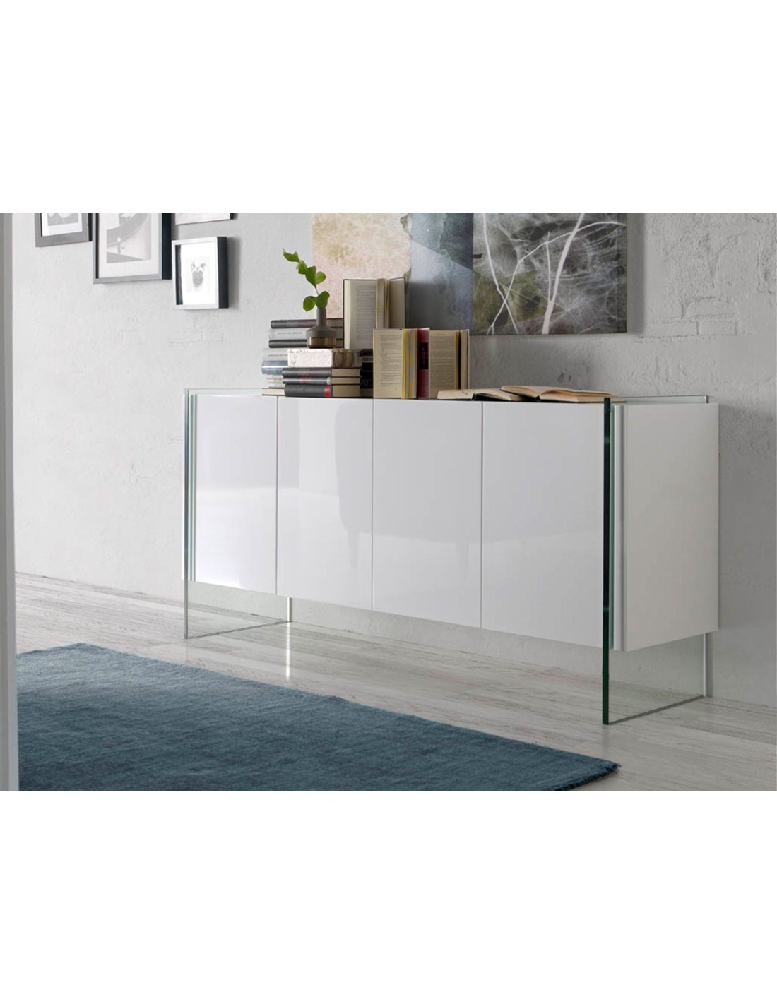 Aparador madera blanco y cristal templado Aparador de diseño moderno con estructura de madera de MDF color blanco y unas originales patas de cristal templado. Cuenta con un amplio espacio de almacenaje con 4 puertas con sistema de apertura uñero y cierre soft-closing. Medidas del producto: 170 x 43 x 77 cm.- Tanto por el lacado como por su diseño lineal y moderno, este aparador se convertirá en la pieza perfecta para su salón o comedor. - El acabado de sus patas en cristal templado creará una mayor sensación de luminosidad, a la vez que de mayor calidez. - Por su diseño de líneas rectas, aportará un aire de calma y calidez a cualquier estancia. - Gracias a sus baldas de madera, podrá disfrutar de un amplio espacio para guardar su vajilla o menaje de mesa. - Si lo que busca es un hogar tranquilo y relajado, este mueble auxiliar le ayudará a mantener el orden gracias a su gran espacio de almacenaje.