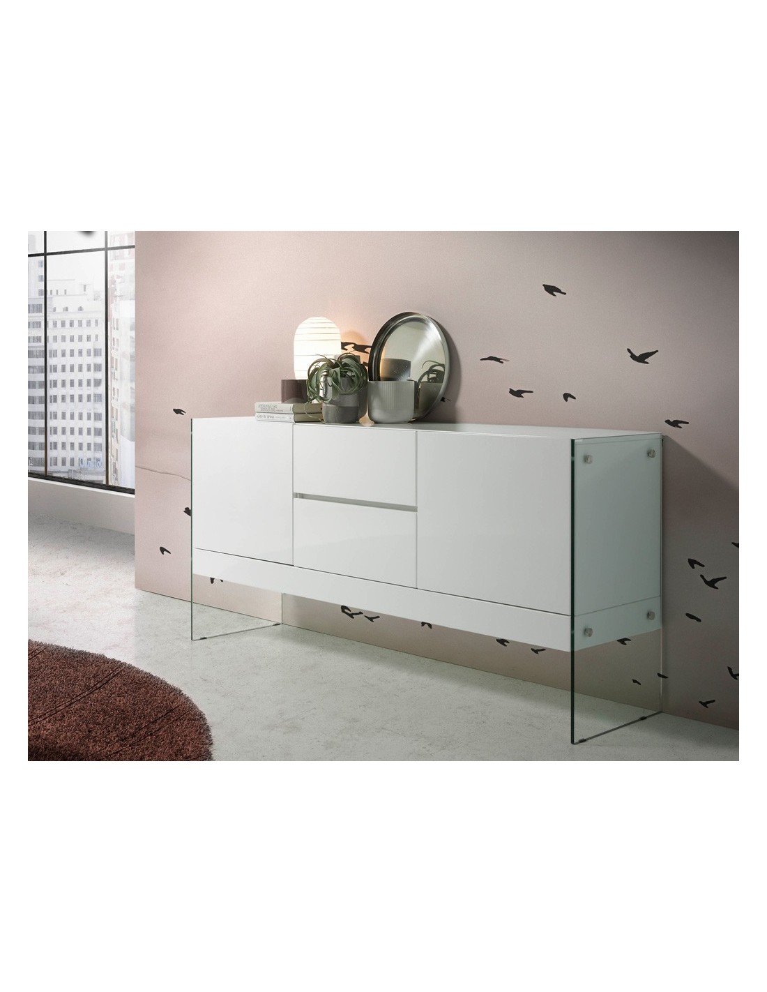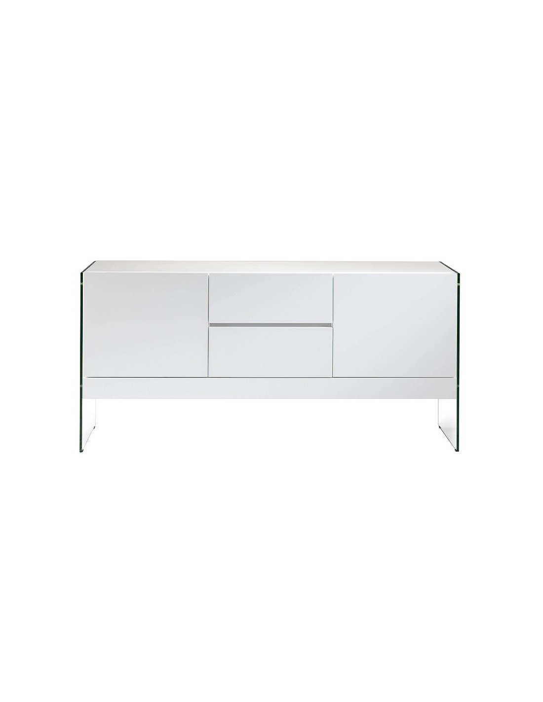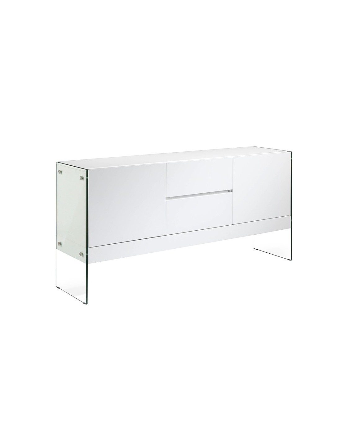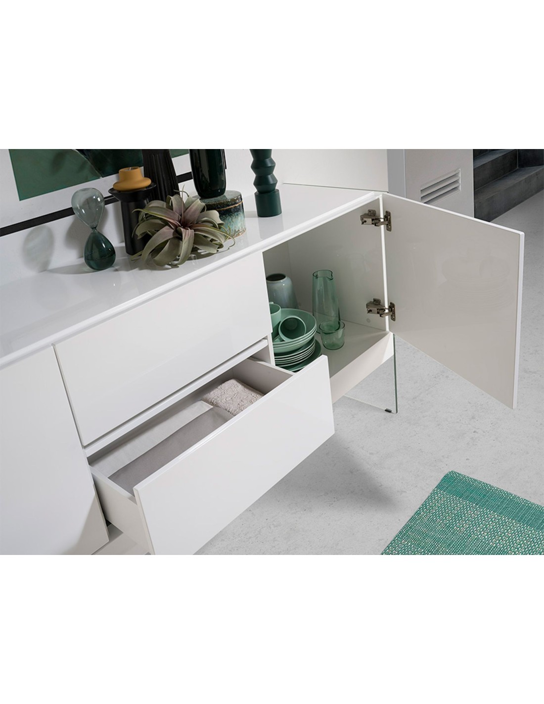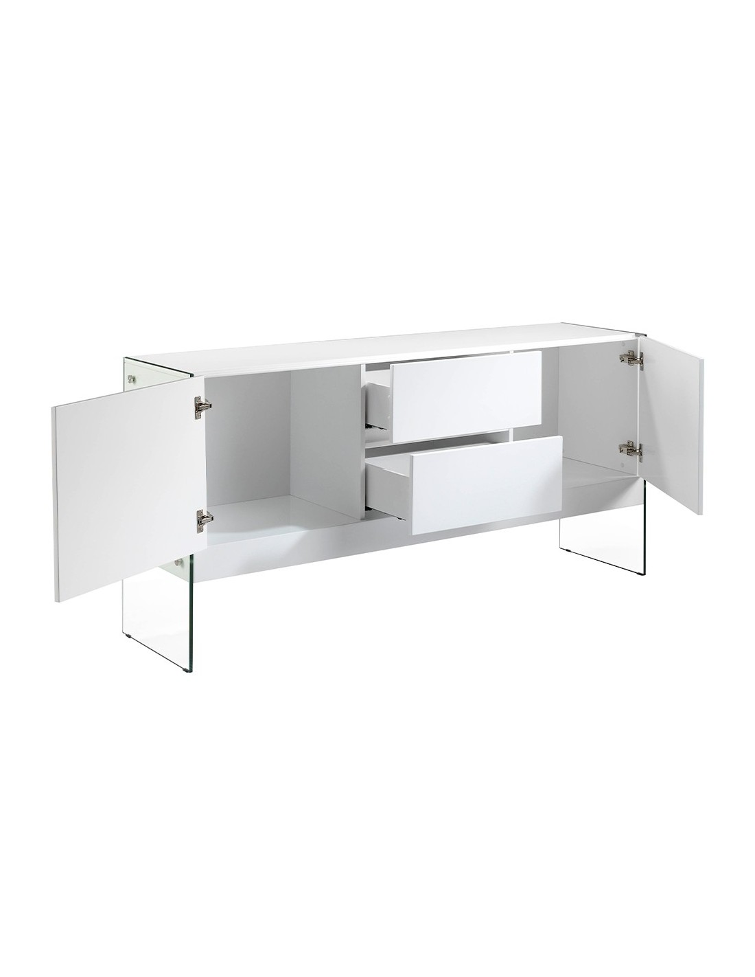Aparador madera blanco y cristal templado Aparador de diseño moderno con estructura de madera de MDF color blanco y unas originales patas de cristal templado. Cuenta con un amplio espacio de almacenaje con 2 cajones con sistema de apertura uñero y cierre soft-closing, y 2 puertas con sistema de apertura uñero y cierre soft-closing. Medidas del producto: 180 x 45 x 85 cm.- Tanto por el lacado como por su diseño lineal y moderno, este aparador se convertirá en la pieza perfecta para su salón o comedor. - El acabado de sus patas en cristal templado creará una mayor sensación de luminosidad, a la vez que de mayor calidez. - Por su diseño de líneas rectas, aportará un aire de calma y calidez a cualquier estancia. - Gracias a sus baldas de madera, podrá disfrutar de un amplio espacio para guardar su vajilla o menaje de mesa. - Práctico y funcional, gracias a su espacio de almacenaje podrá mantener todo en su sitio, eliminando ruido visual en su salón o comedor.
