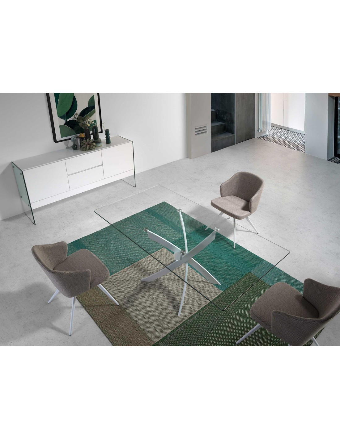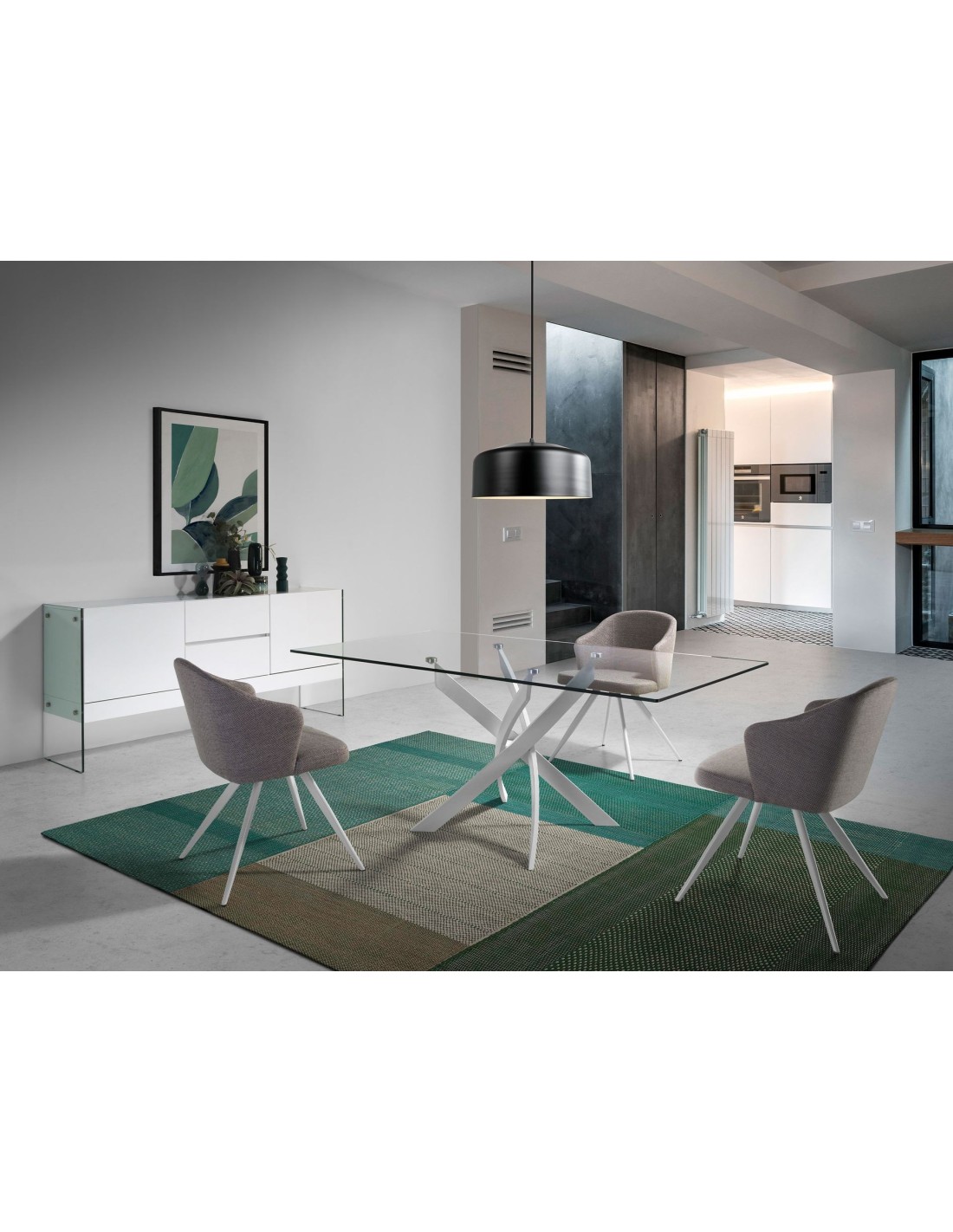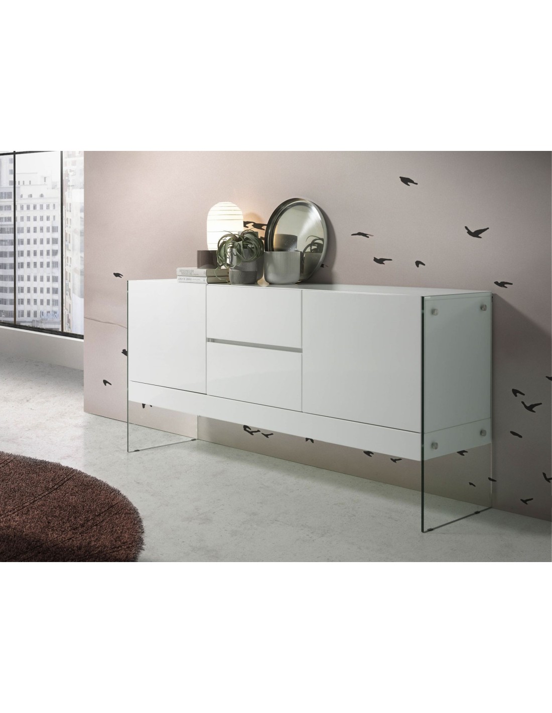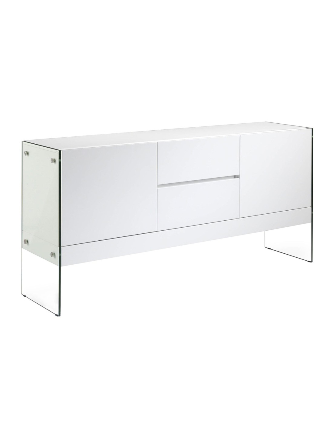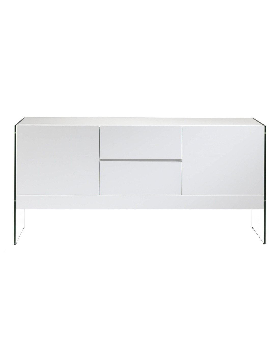 Aparador madera blanco y cristal templado Aparador de diseño moderno con estructura de madera de MDF color blanco y unas originales patas de cristal templado. Cuenta con un amplio espacio de almacenaje con 2 cajones con sistema de apertura uñero y cierre soft-closing, y 2 puertas con sistema de apertura uñero y cierre soft-closing. Medidas del producto: 180 x 45 x 85 cm.- Tanto por el lacado como por su diseño lineal y moderno, este aparador se convertirá en la pieza perfecta para su salón o comedor. - El acabado de sus patas en cristal templado creará una mayor sensación de luminosidad, a la vez que de mayor calidez. - Por su diseño de líneas rectas, aportará un aire de calma y calidez a cualquier estancia. - Gracias a sus baldas de madera, podrá disfrutar de un amplio espacio para guardar su vajilla o menaje de mesa. - Práctico y funcional, gracias a su espacio de almacenaje podrá mantener todo en su sitio, eliminando ruido visual en su salón o comedor.