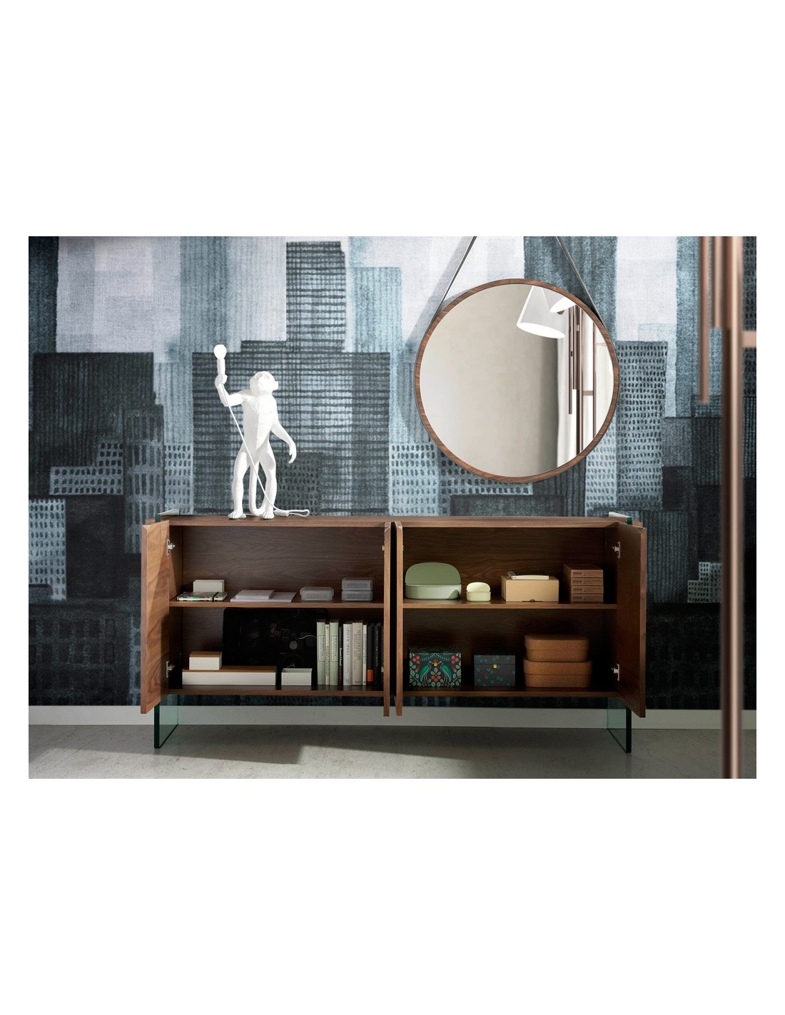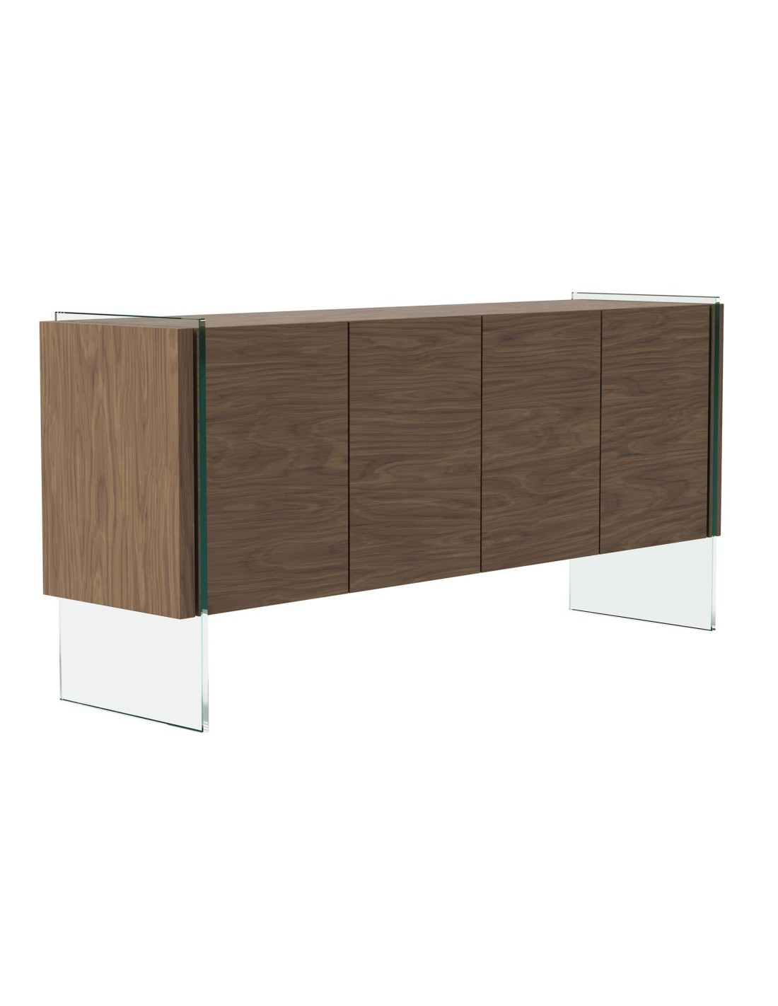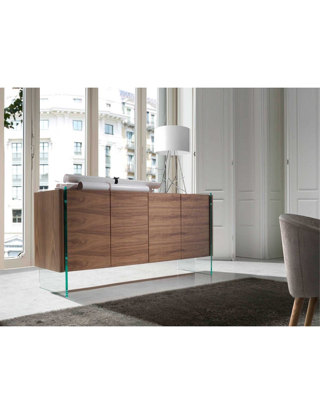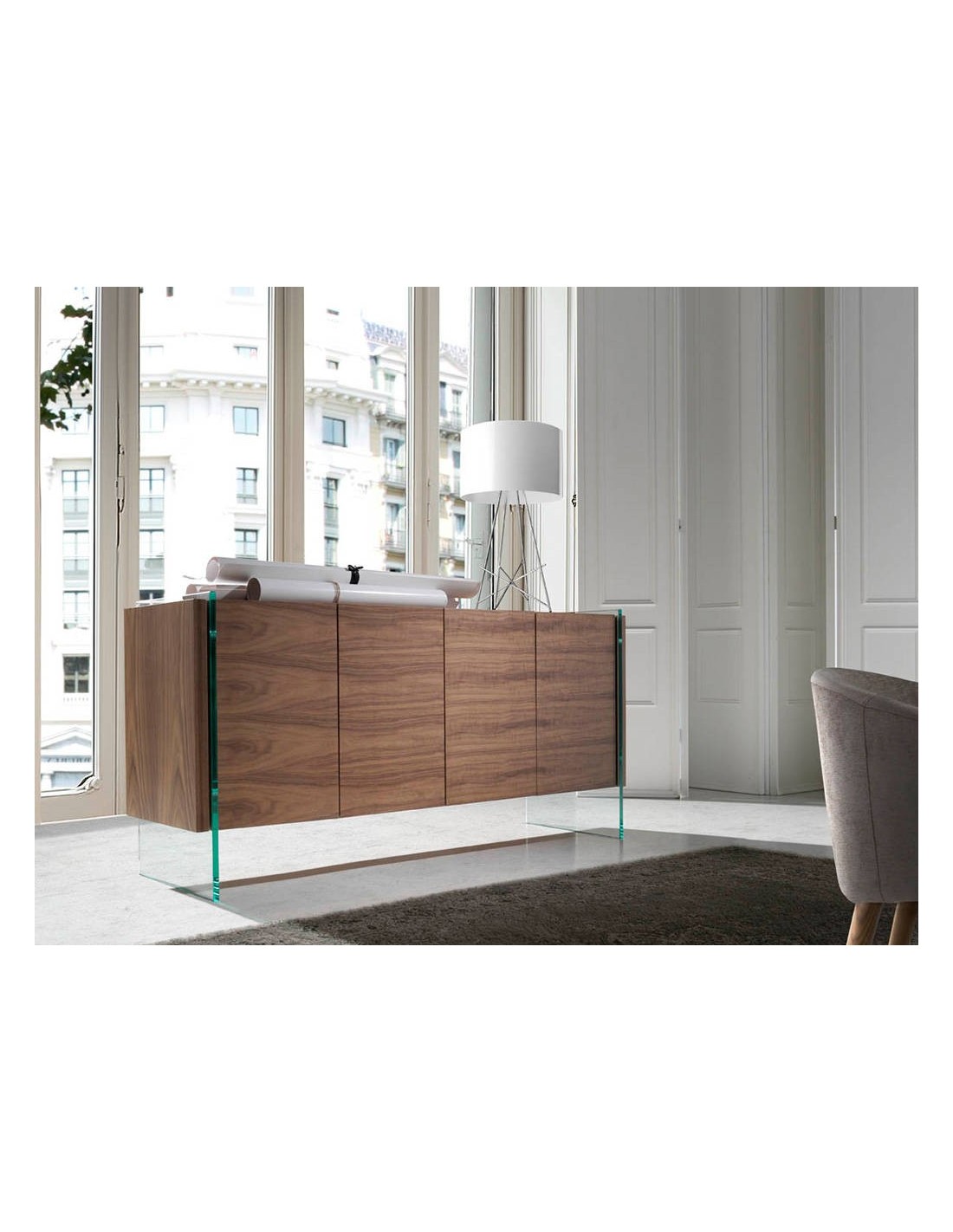 Aparador nogal y cristal templado Aparador de diseño moderno con estructura de madera chapada en nogal natural y unas originales patas de cristal templado. Cuenta con un amplio espacio de almacenaje con 4 puertas con sistema de apertura uñero y cierre soft-closing. Medidas del producto: 170 x 43 x 77 cm.- Un aparador elegante y sofisticado de madera chapada en nogal natural de 0,5 mm de espesor con el que conseguirá el toque de modernidad y calidez que busca para su salón o comedor. - El acabado de sus patas en cristal templado creará una mayor sensación de luminosidad, a la vez que de mayor calidez. - Por su diseño de líneas rectas, aportará un aire de calma y calidez a cualquier estancia. - Gracias a sus baldas de madera, podrá disfrutar de un amplio espacio para guardar su vajilla o menaje de mesa. - Práctico y funcional, gracias a su espacio de almacenaje podrá mantener todo en su sitio, eliminando ruido visual en su salón o comedor.