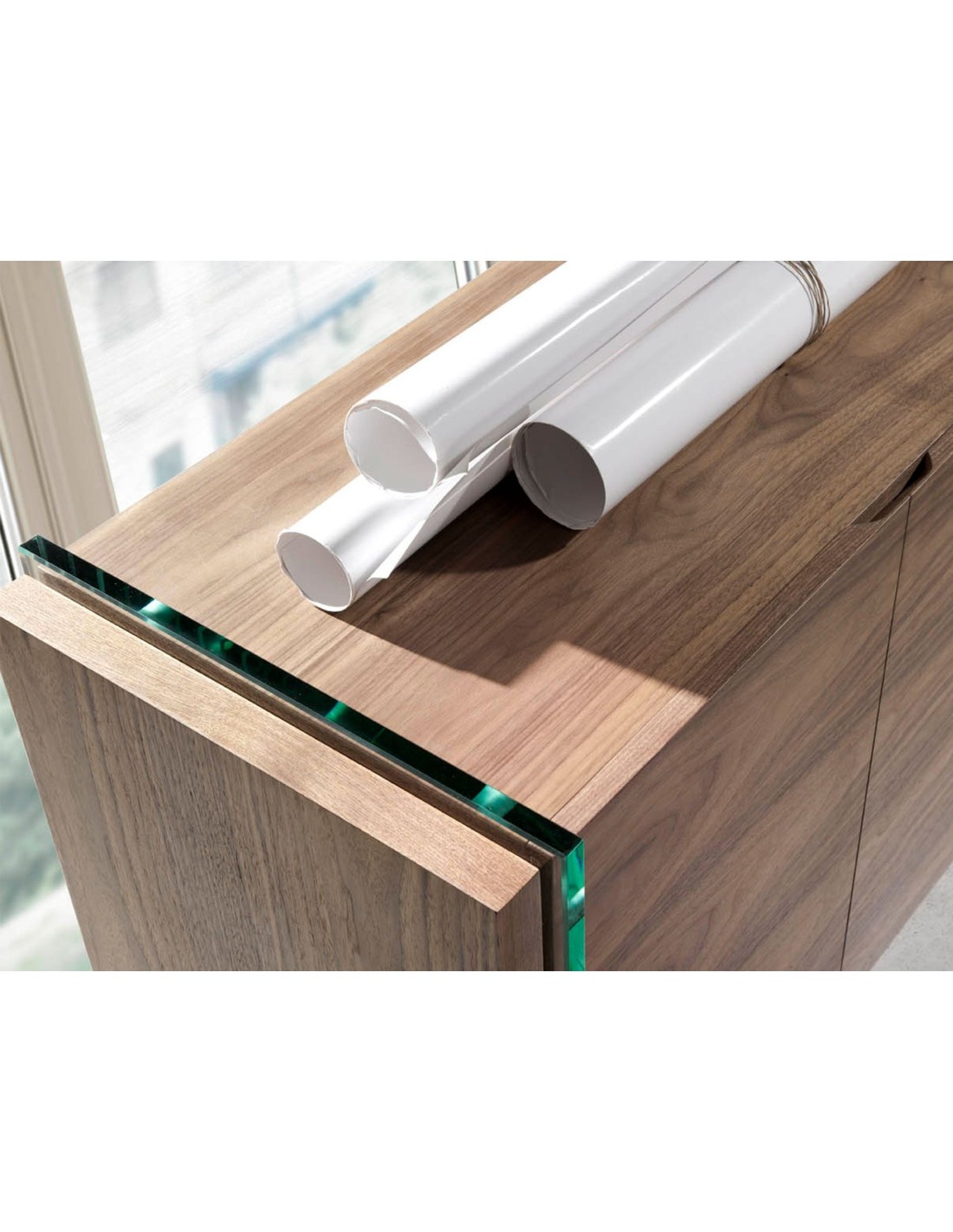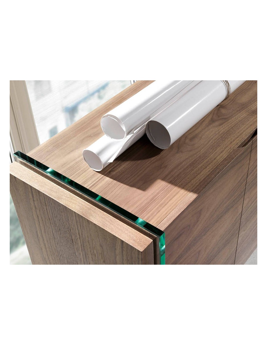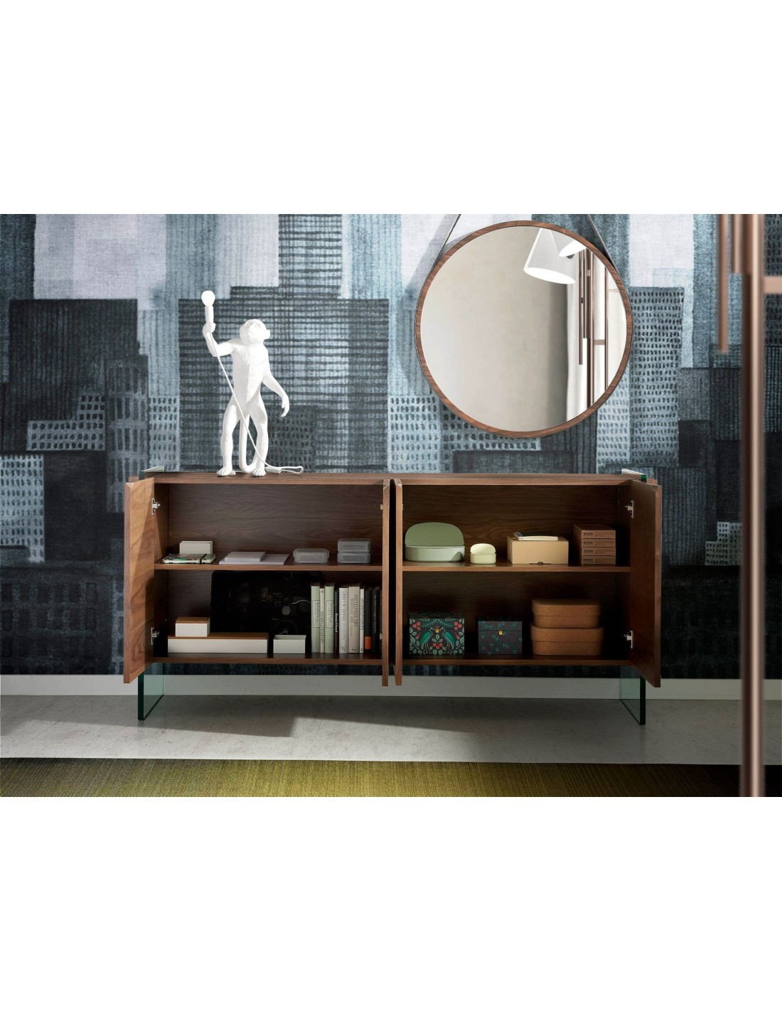 Aparador nogal y cristal templado Aparador de diseño moderno con estructura de madera chapada en nogal natural y unas originales patas de cristal templado. Cuenta con un amplio espacio de almacenaje con 4 puertas con sistema de apertura uñero y cierre soft-closing. Medidas del producto: 170 x 43 x 77 cm.- Un aparador elegante y sofisticado de madera chapada en nogal natural de 0,5 mm de espesor con el que conseguirá el toque de modernidad y calidez que busca para su salón o comedor. - El acabado de sus patas en cristal templado creará una mayor sensación de luminosidad, a la vez que de mayor calidez. - Por su diseño de líneas rectas, aportará un aire de calma y calidez a cualquier estancia. - Gracias a sus baldas de madera, podrá disfrutar de un amplio espacio para guardar su vajilla o menaje de mesa. - Práctico y funcional, gracias a su espacio de almacenaje podrá mantener todo en su sitio, eliminando ruido visual en su salón o comedor.