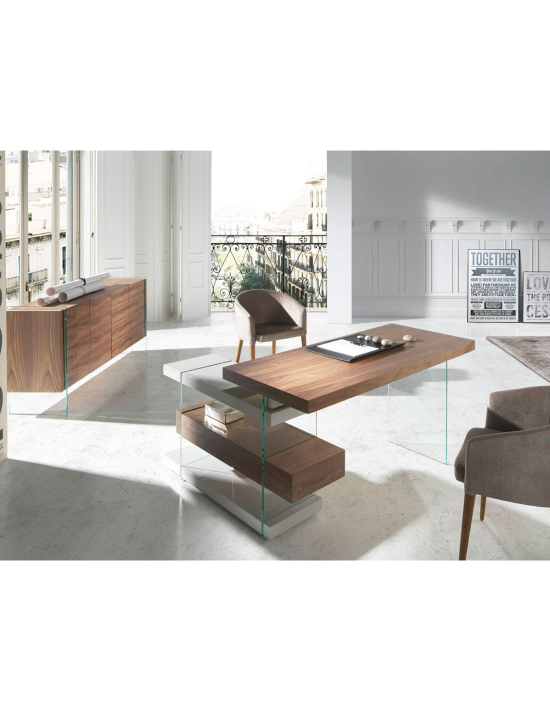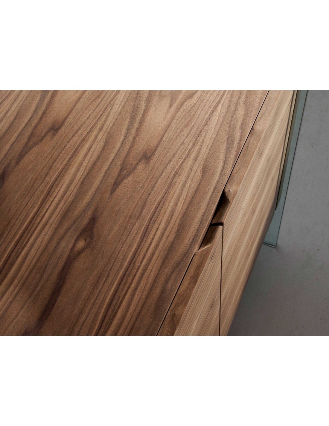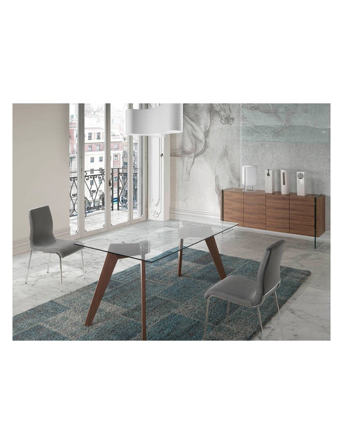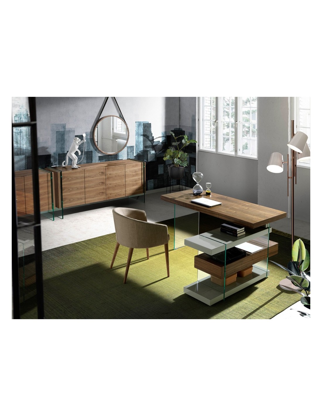 Aparador nogal y cristal templado Aparador de diseño moderno con estructura de madera chapada en nogal natural y unas originales patas de cristal templado. Cuenta con un amplio espacio de almacenaje con 4 puertas con sistema de apertura uñero y cierre soft-closing. Medidas del producto: 170 x 43 x 77 cm.- Un aparador elegante y sofisticado de madera chapada en nogal natural de 0,5 mm de espesor con el que conseguirá el toque de modernidad y calidez que busca para su salón o comedor. - El acabado de sus patas en cristal templado creará una mayor sensación de luminosidad, a la vez que de mayor calidez. - Por su diseño de líneas rectas, aportará un aire de calma y calidez a cualquier estancia. - Gracias a sus baldas de madera, podrá disfrutar de un amplio espacio para guardar su vajilla o menaje de mesa. - Práctico y funcional, gracias a su espacio de almacenaje podrá mantener todo en su sitio, eliminando ruido visual en su salón o comedor.