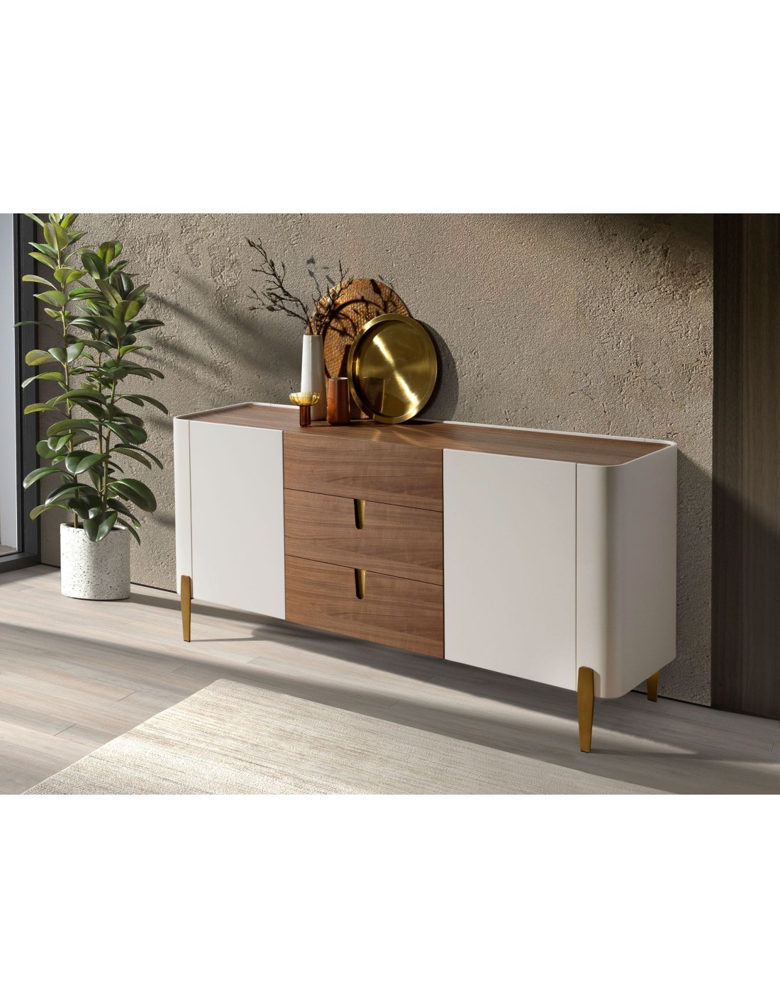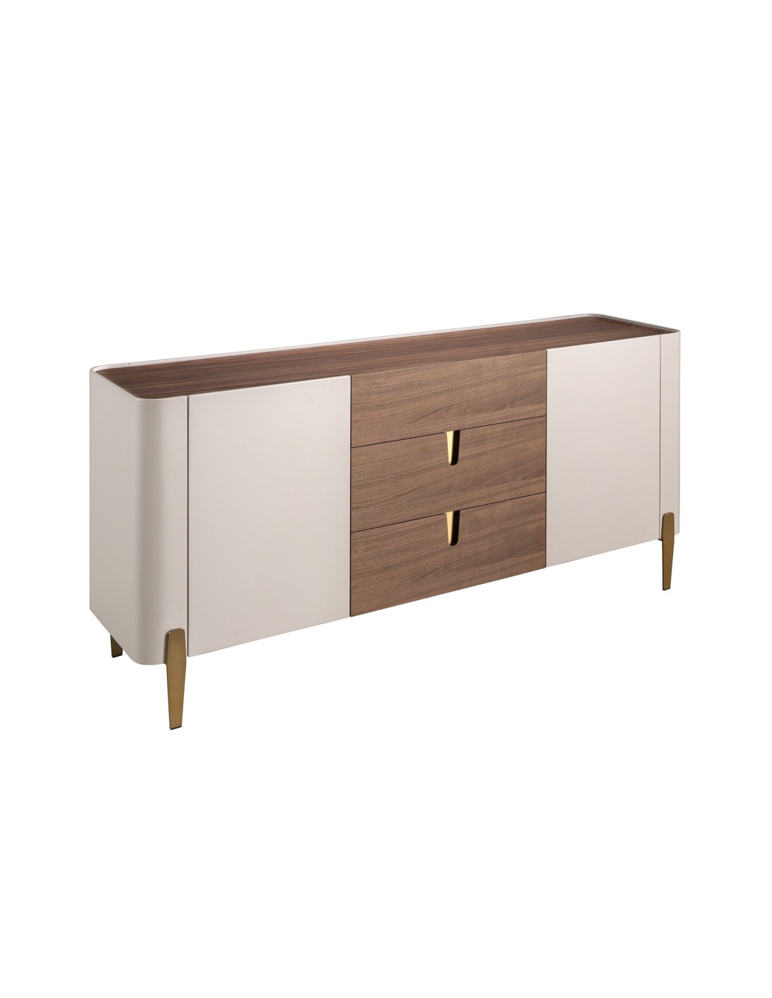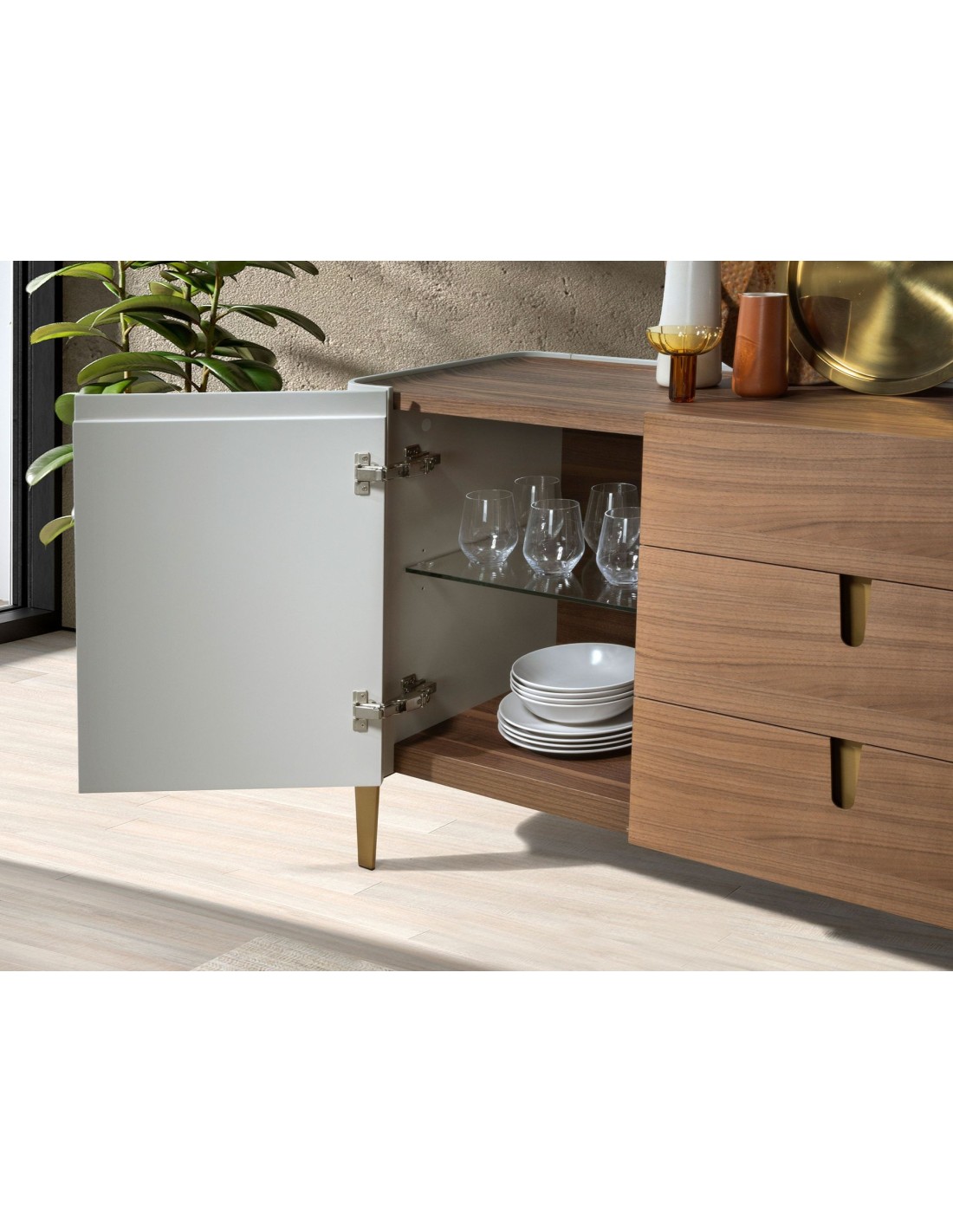 Aparador nogal, beige, acero pulido dorado y tapa de nogal Aparador de diseño moderno con estructura de madera chapada en nogal natural y madera MDF lacada en color beige, y unas originales patas de acero inoxidable pulido en color dorado. Gracias a su elegante tapa de madera chapada en nogal natural, conseguirá el look sofisticado que busca para sus estancias. Su original detalle en acero inoxidable pulido en color dorado aporta el toque de estilo ideal para tu salón. Cuenta con un amplio espacio de almacenaje con 3 cajones con sistema de apertura uñero y cierre soft-closing, y 2 puertas con sistema de apertura uñero y cierre soft-closing. Medidas del producto: 180 x 47 x 80 cm.- Este elegante aparador de madera chapada en nogal natural de 0,5 mm de espesor, aportará el toque diferente y moderno que busca para su hogar. - El acero de sus patas, así como su diseño lineal, permite que encaje en cualquier espacio de su hogar. - Tanto por el lacado como por su diseño lineal y moderno, este aparador se convertirá en la pieza perfecta para su salón o comedor. - Gracias a sus baldas de cristal extraíbles y ajustables en altura, podrá disfrutar de un amplio espacio para guardar su vajilla o menaje de mesa. - Si lo que busca es un hogar tranquilo y relajado, este mueble auxiliar le ayudará a mantener el orden gracias a su gran espacio de almacenaje.