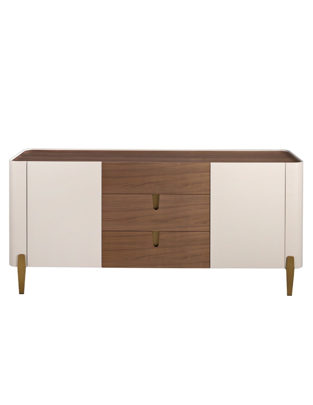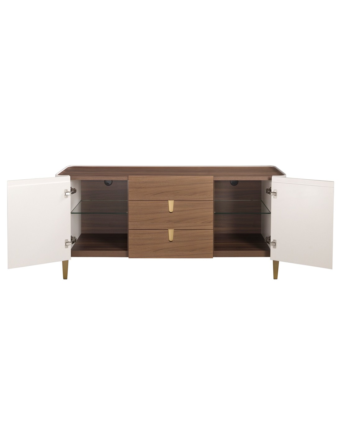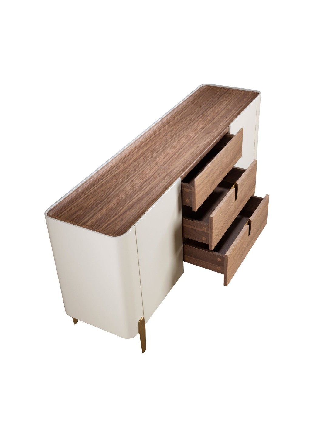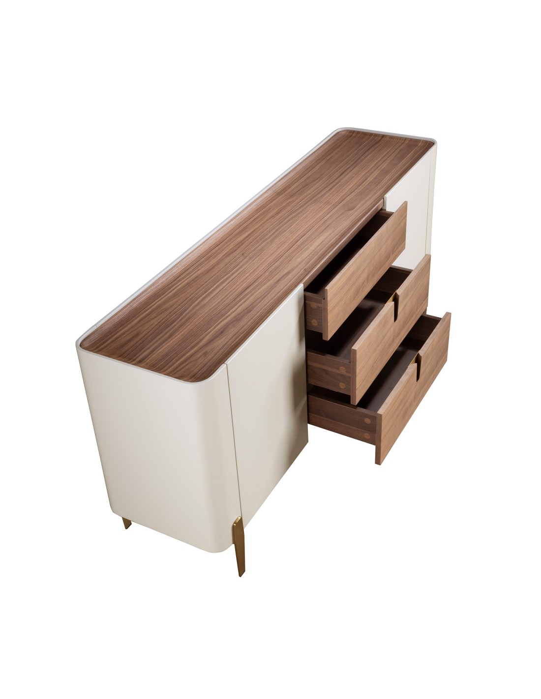 Aparador nogal, beige, acero pulido dorado y tapa de nogal Aparador de diseño moderno con estructura de madera chapada en nogal natural y madera MDF lacada en color beige, y unas originales patas de acero inoxidable pulido en color dorado. Gracias a su elegante tapa de madera chapada en nogal natural, conseguirá el look sofisticado que busca para sus estancias. Su original detalle en acero inoxidable pulido en color dorado aporta el toque de estilo ideal para tu salón. Cuenta con un amplio espacio de almacenaje con 3 cajones con sistema de apertura uñero y cierre soft-closing, y 2 puertas con sistema de apertura uñero y cierre soft-closing. Medidas del producto: 180 x 47 x 80 cm.- Este elegante aparador de madera chapada en nogal natural de 0,5 mm de espesor, aportará el toque diferente y moderno que busca para su hogar. - El acero de sus patas, así como su diseño lineal, permite que encaje en cualquier espacio de su hogar. - Tanto por el lacado como por su diseño lineal y moderno, este aparador se convertirá en la pieza perfecta para su salón o comedor. - Gracias a sus baldas de cristal extraíbles y ajustables en altura, podrá disfrutar de un amplio espacio para guardar su vajilla o menaje de mesa. - Si lo que busca es un hogar tranquilo y relajado, este mueble auxiliar le ayudará a mantener el orden gracias a su gran espacio de almacenaje.
