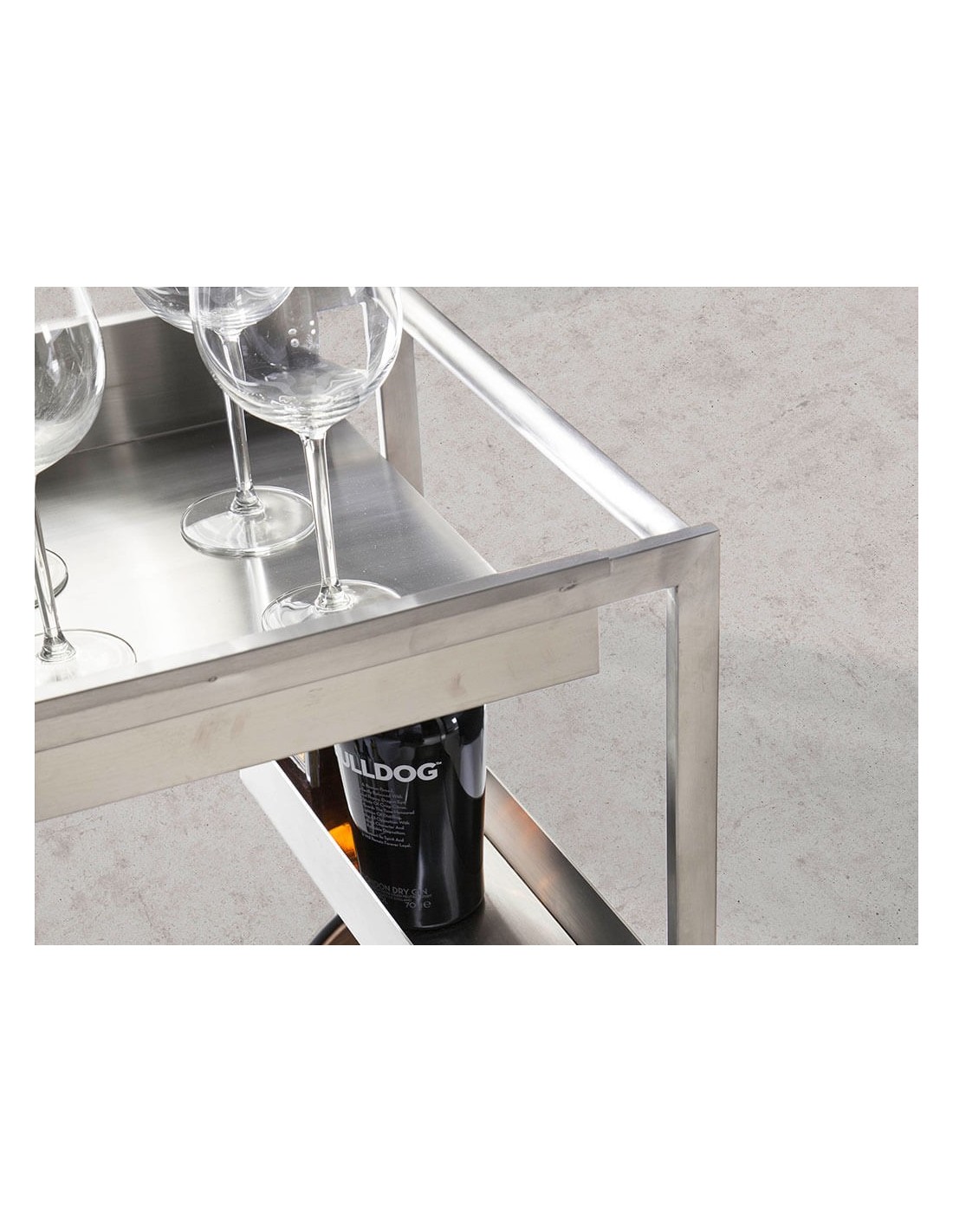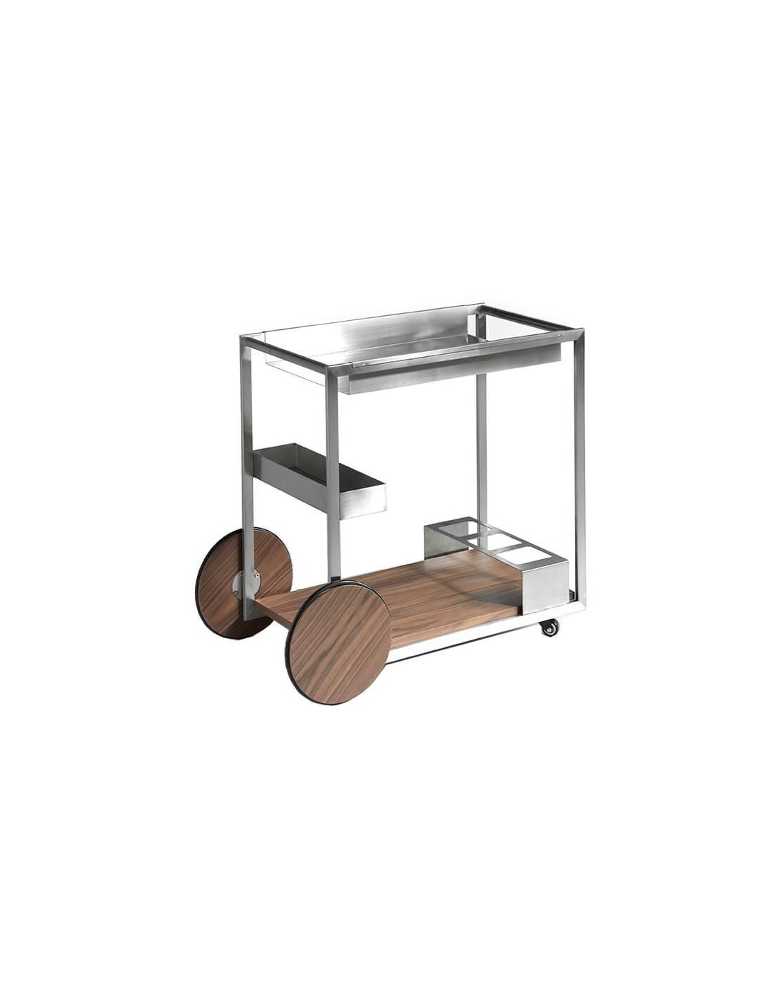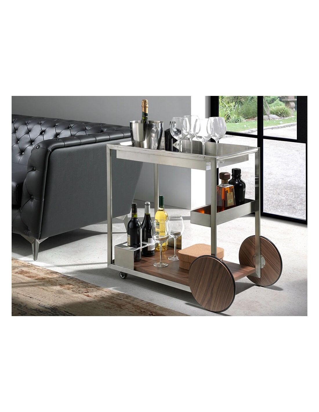 Carrito minibar acero y nogal Carrito minibar fabricado en acero inoxidable pulido con dos bandejas y hueco botellero de acero pulido. Remate de la base y las ruedas en madera chapada en nogal.Medidas del producto: 91 x 38 x 74 cm.- Este original carrito minibar de diseño moderno aportará el toque diferente y sofisticado que buscas para tu salón y comedor. - Gracias a su acabado de diseño es ideal para combinar con las últimas tendencias en decoración. - Tanto por su diseño como por su acabado en acero inoxidable pulido y madera chapada en nogal, se trata de un mueble auxiliar versátil y funcional perfecto para cualquier salón o comedor, así como para los restaurantes y bares más elegantes.- Todos nuestros muebles de bar están fabricados con materiales de la más alta calidad, siendo garantía de mobiliario duradero y funcional. - El diseño sencillo a la vez que exquisito de este carrito minibar lo convierte en una pieza clave para tu estancia. La madera de nogal combinada con el acero, aportará vanguardia y calidez a tus estancias.- Su elegante diseño no está reñido con la funcionalidad, y es que contarás con un gran espacio de almacenamiento con sus dos bandejas y hueco botellero, que te permitirá crear un ambiente de diseño, a la vez que mantienes todo en orden y en su sitio.