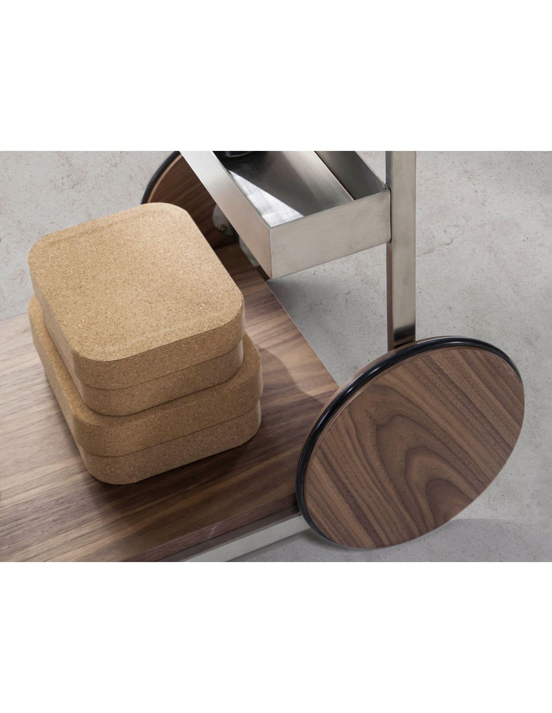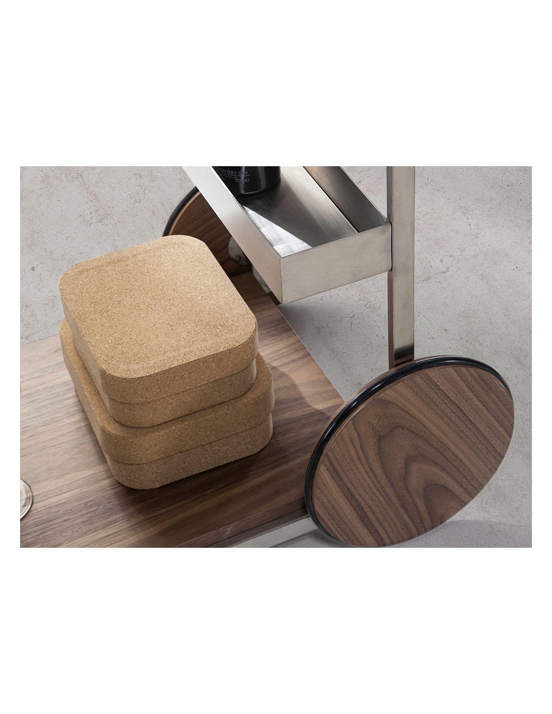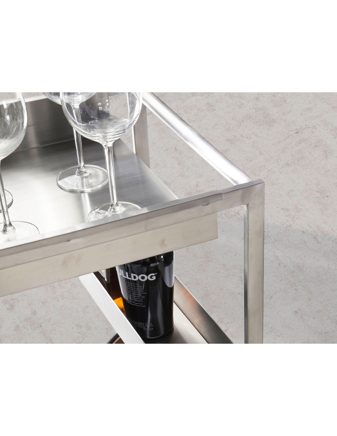 Carrito minibar acero y nogal Carrito minibar fabricado en acero inoxidable pulido con dos bandejas y hueco botellero de acero pulido. Remate de la base y las ruedas en madera chapada en nogal.Medidas del producto: 91 x 38 x 74 cm.- Este original carrito minibar de diseño moderno aportará el toque diferente y sofisticado que buscas para tu salón y comedor. - Gracias a su acabado de diseño es ideal para combinar con las últimas tendencias en decoración. - Tanto por su diseño como por su acabado en acero inoxidable pulido y madera chapada en nogal, se trata de un mueble auxiliar versátil y funcional perfecto para cualquier salón o comedor, así como para los restaurantes y bares más elegantes.- Todos nuestros muebles de bar están fabricados con materiales de la más alta calidad, siendo garantía de mobiliario duradero y funcional. - El diseño sencillo a la vez que exquisito de este carrito minibar lo convierte en una pieza clave para tu estancia. La madera de nogal combinada con el acero, aportará vanguardia y calidez a tus estancias.- Su elegante diseño no está reñido con la funcionalidad, y es que contarás con un gran espacio de almacenamiento con sus dos bandejas y hueco botellero, que te permitirá crear un ambiente de diseño, a la vez que mantienes todo en orden y en su sitio.