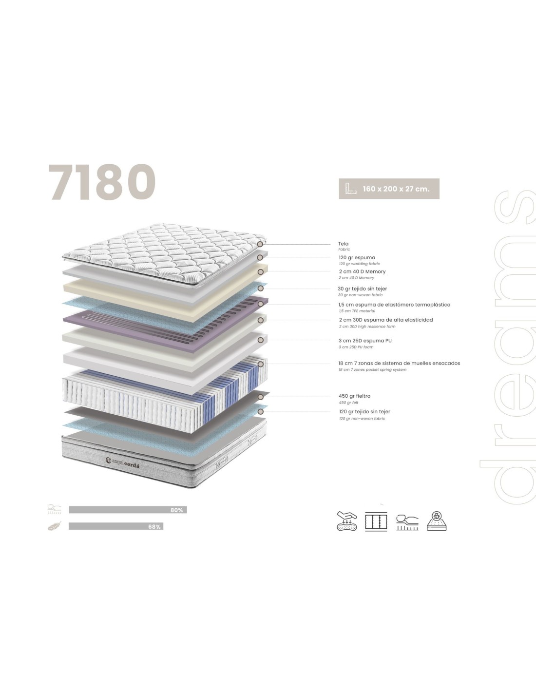 Colchón híbrido de muelles ensacados y viscoelástica 160 x 200 Colchón híbrido multicapa con muelles ensacados y viscoelástica Memory Foam de firmeza media. Ofrece una gran transpirabilidad gracias a su núcleo de muelles ensacados que se adapta a cada persona. Gracias a su capa viscoelástica, proporciona alivio de presión y una mayor ergonomía. Este tipo de colchón es ideal para los que buscan el mejor confort y una experiencia de sueño equilibrada.Medidas del producto: 160 x 200 x 27 cm.- Este colchón, contiene 2 cm de espesor de espuma Memory Foam, lo que permite la perfecta distribución del peso potenciando un efecto de firmeza envolvente.- Gracias a su capa de silicona TPE con espuma revestida de 1,5cm, beneficiará de grandes propiedades de enfriamiento, ideales para mantener la temperatura corporal.- La combinación de espuma de alta elasticidad de 2cm y de espuma PU estándar de 3cm, le otorgará una mejor sensación de confort proporcionando la mayor adaptabilidad para todo el cuerpo.- Sus 7 zonas de muelles ensacados de 18cm, son ideales para una adaptación en las zonas de presión, que garantiza un descanso perfecto y confortable, permitiendo que tu espalda esté alineada.- Su fina capa de Eco-fieltro de 450 gr, funciona como una base transpirable, siendo un fantástico protector contra la humedad.- Gracias a su composición previene la aparición de ácaros, bacterias y hongos.