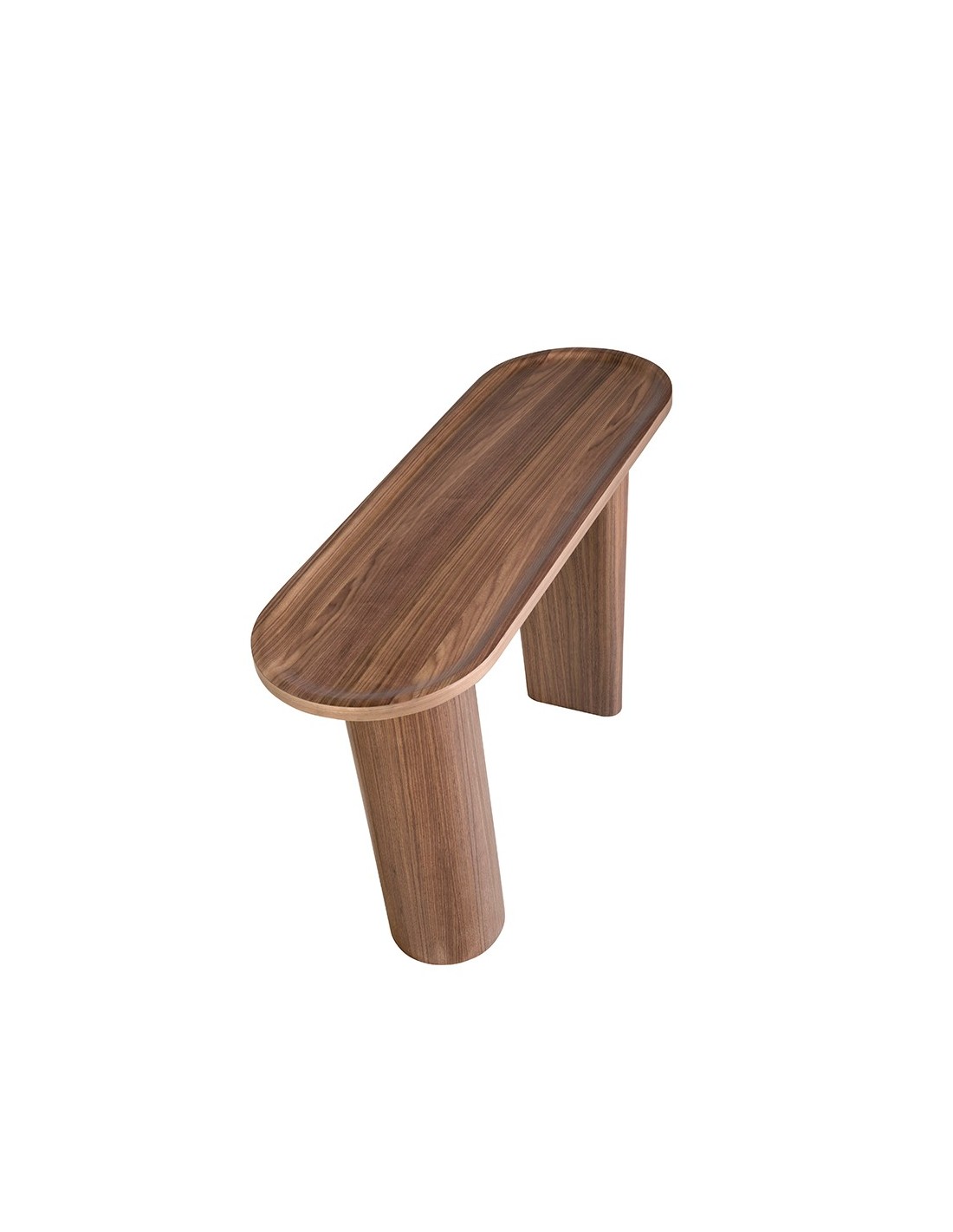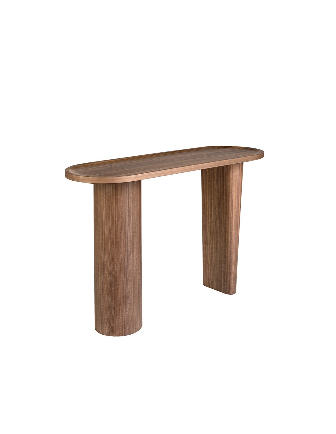 Consola ovalada medio punto nogal Consola ovalada medio punto de diseño moderno con tapa de madera chapada en nogal natural y unas originales patas de madera chapada en nogal natural. Una pieza con un diseño sencillo a la vez que original, con la que aportará un toque único y personal.Medidas del producto: Ø120 x 40 x 76 cm.- Gracias a su tapa de madera chapada en nogal natural de 0,5 mm de espesor podrá crear un ambiente cálido, acogedor y repleto de estilo. - Su original diseño de patas fabricadas en madera chapada en nogal natural de 0,5 mm de espesor, es perfecto para contar con el toque de calidez y diseño moderno que necesita en su entrada. - Las líneas redondeadas y curvas de su estructura le permitirá conseguir un ambiente relajado a la vez que exclusivo. - Tanto por sus medidas como por su fabricación con materiales de la mayor calidad, esta consola es el auxiliar ideal para el día a día, totalmente práctico y funcional.