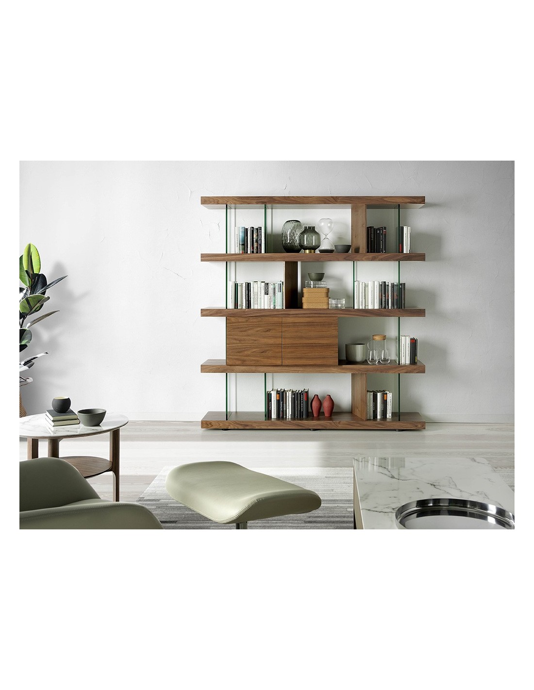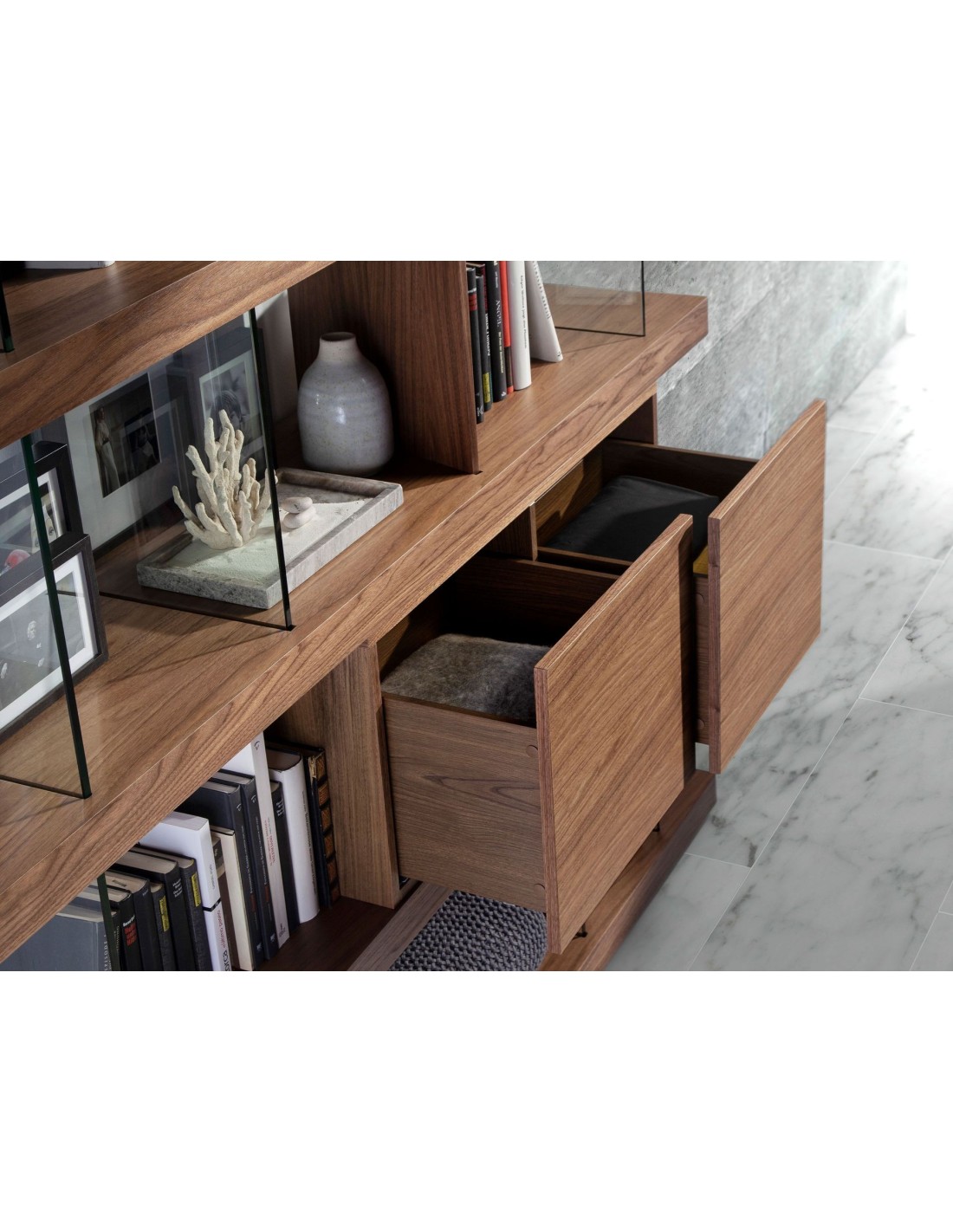 Estantería nogal y cristal Estantería de madera chapada en nogal con cajones con sistema push y cierre soft-closing, y cristales templados.Medidas del producto: 180 x 38 x 190 cm.- Esta original estantería con estantes de madera de nogal de diseño moderno aportará calidez y amplitud a cada ambiente de tu hogar, fiel a las últimas tendencias en decoración.- Su carácter versátil y funcional, permite que encaje en cualquier tipo de salón, comedor, zona de lectura o despacho.- Todas nuestras estanterías están fabricadas con materiales de la más alta calidad, siendo garantía de mobiliario duradero y funcional.- Por su diseño de líneas rectas y estilo minimalista, así como por su original diseño con laterales y separadores en cristal templado, conseguirás el toque elegante y personal que buscas para tu hogar.- Sus estantes y sus dos cajones conforman la combinación perfecta entre estilo y practicidad. Una estantería ideal para guardar todo lo que necesites y mantener tus estancias en orden.