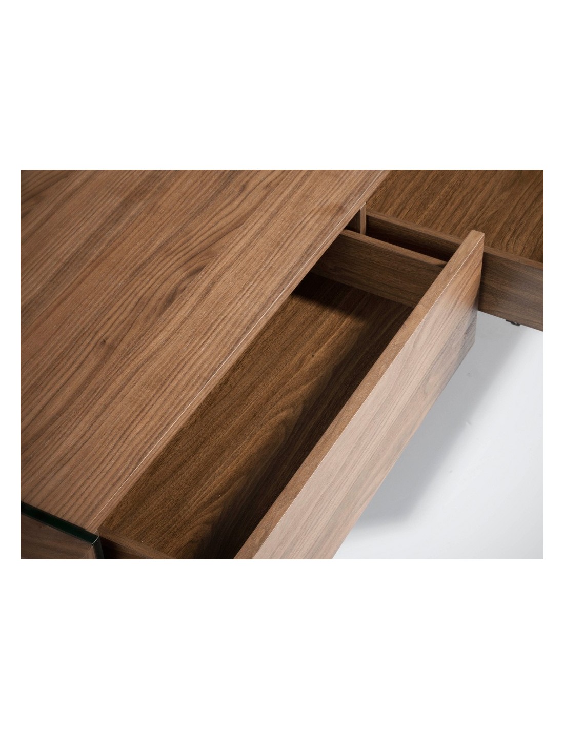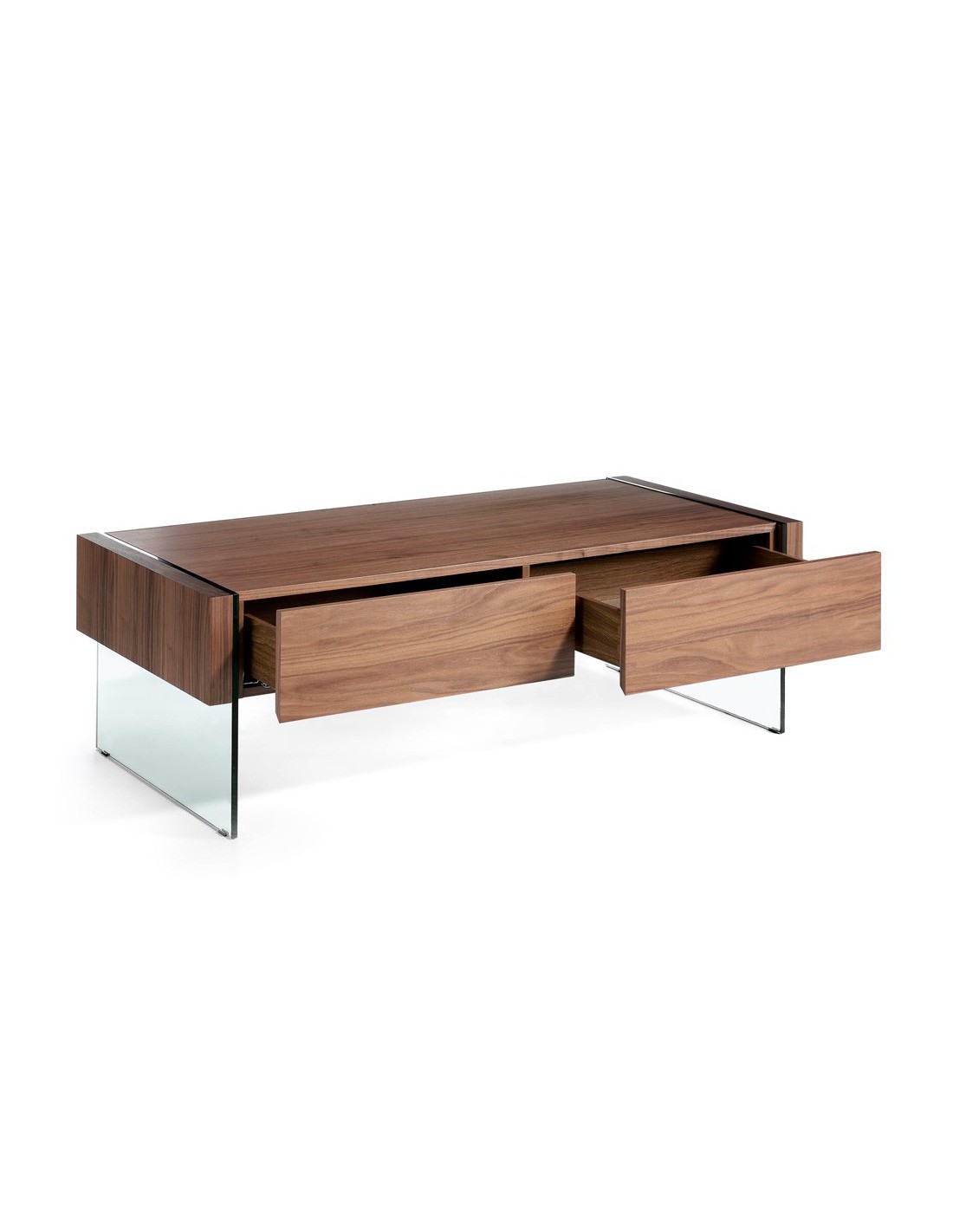 Mesa centro rectangular nogal y cristal templado Mesa centro rectangular de diseño moderno fabricada en madera chapada en nogal natural. Su estructura de patas de cristal templado, aporta el toque de modernidad y vanguardia que busca para su hogar. Cuenta con un amplio espacio de almacenaje con 2 cajones con sistema de apertura uñero y cierre soft-closing. Medidas del producto: 127 x 59 x 41 cm.- Gracias a su tapa de madera chapada en nogal natural de 0,5 mm de espesor podrá crear un ambiente cálido, acogedor y repleto de estilo. - El toque de elegancia y originalidad lo aportan sus patas de cristal templado, otorgando así una mayor sensación de luminosidad y amplitud al espacio. - Su diseño de líneas rectas le permitirá conseguir un ambiente de estilo vanguardista a la vez que sofisticado. - Tanto por su diseño como por su espacio de almacenaje, esta mesa auxiliar es perfecta para crear ambientes amplio y cálidos, a la vez que mantener todo en su sitio.