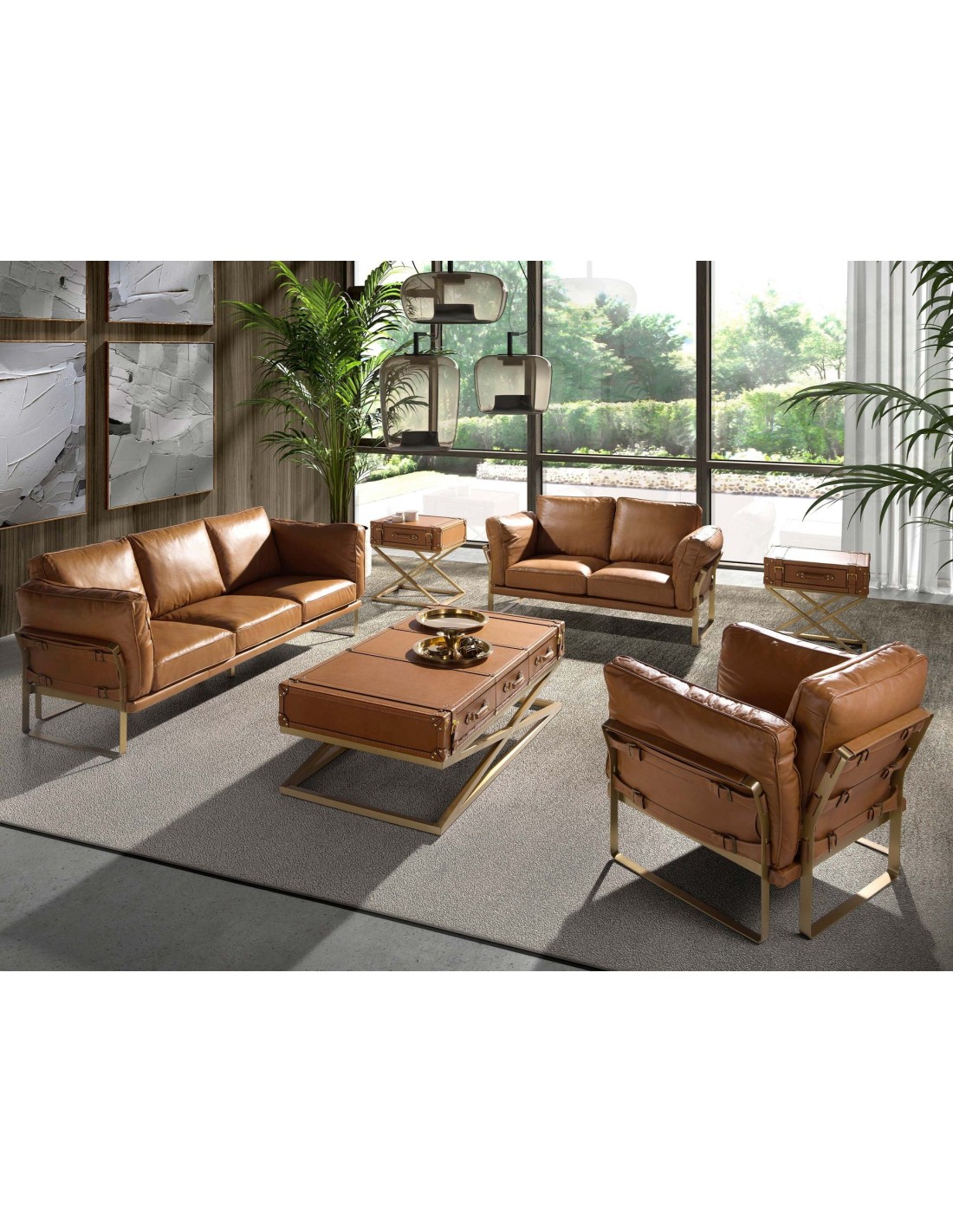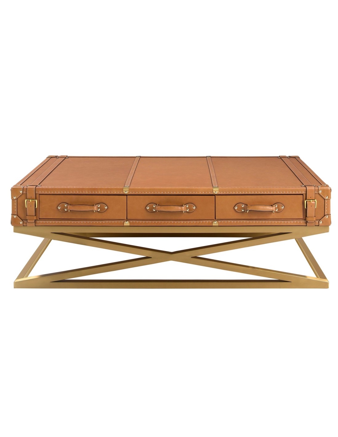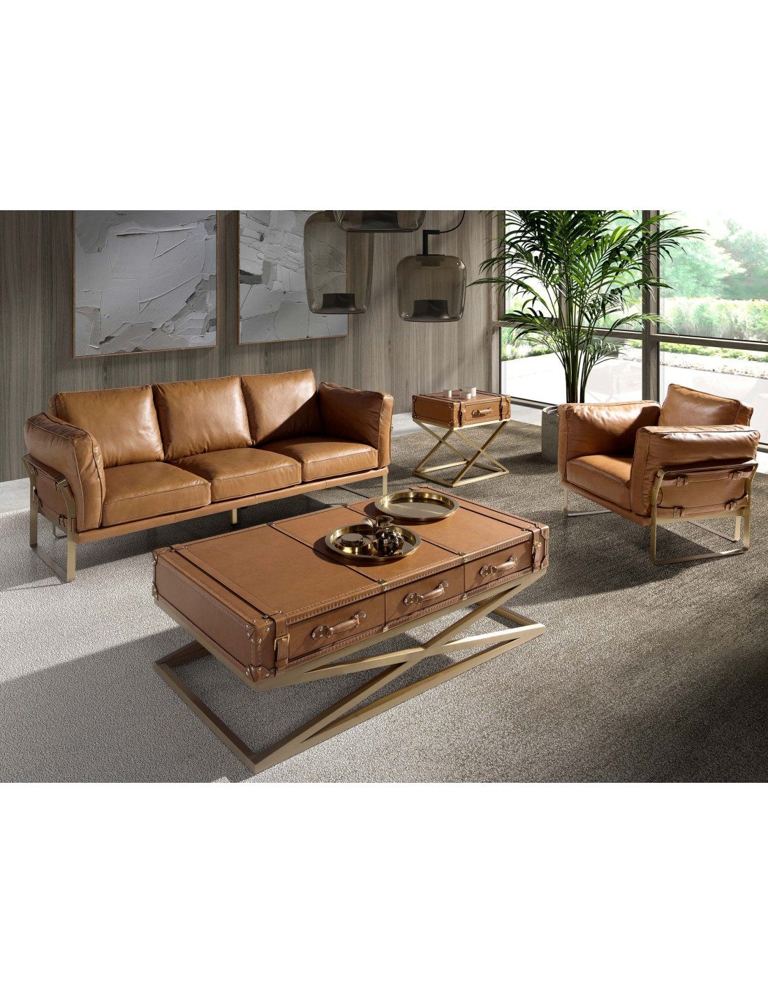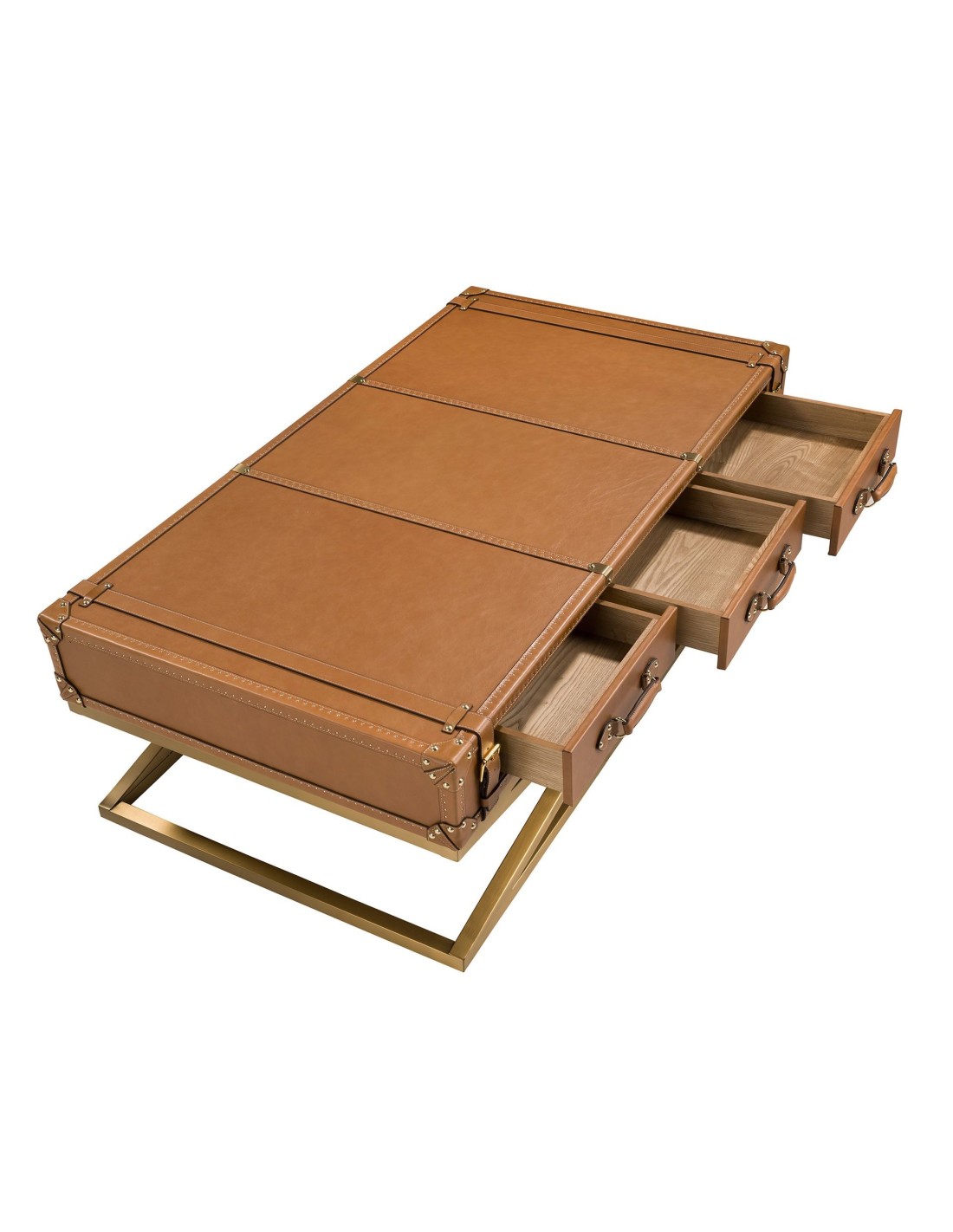 Mesa centro rectangular piel y acero dorado Mesa centro rectangular de diseño moderno fabricada en piel de origen vacuno. Su estructura de patas de acero inoxidable en color dorado, aporta el toque de modernidad y vanguardia que busca para su hogar. Cuenta con un amplio espacio de almacenaje con 3 cajones con sistema de apertura tirador de lengüeta y cierre soft-closing. Medidas del producto: 144 x 78 x 47 cm.- Tanto por su original diseño en forma de maleta como por su acabado tapizado en piel color camel, este mueble es perfecto para incluir un toque de vanguardia y calidez a su hogar. - El detalle en acero inoxidable color dorado en sus patas, aportará ese toque de vanguardia y elegancia que buscas para tu hogar. - Versátil y funcional, su diseño permite que encaje en cualquier ambiente, convirtiéndose en un elemento clave de la decoración de su hogar. - Tanto por sus medidas como por su fabricación con materiales de la mayor calidad, esta mesa es el auxiliar ideal para el día a día, totalmente práctico y funcional. - Su diseño original de correas que envuelve su estructura, le brinda un toque diferente y exclusivo convirtiéndolo en una pieza de estilo moderno ideal.