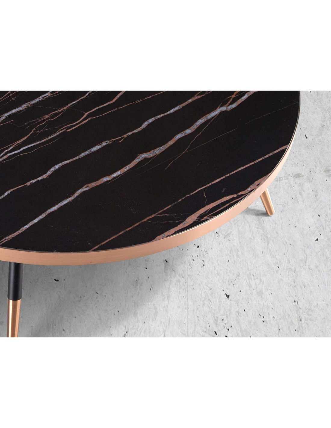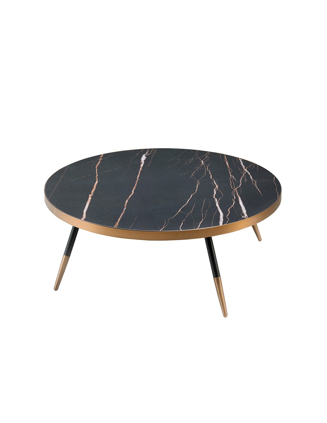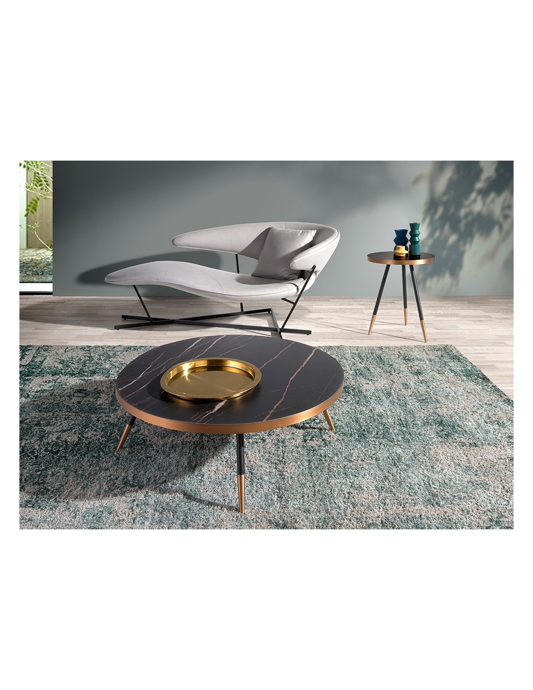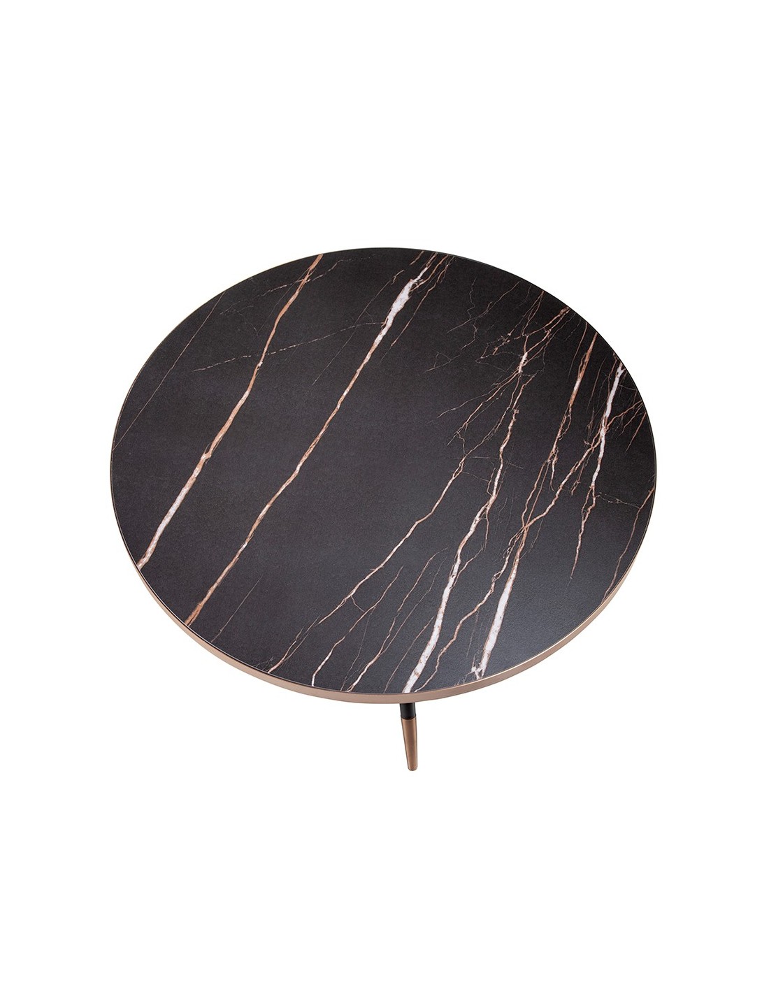 Mesa centro redonda mármol porcelánico y acero negro Mesa centro redonda de diseño moderno con tapa de mármol porcelánico negro con vetas en tonalidades marrones en acabado mate y unas originales patas de acero inoxidable color negro. Una pieza con un diseño sencillo a la vez que original, con la que aportará un toque único y personal. Su original detalle en acero inoxidable color bronce aporta el toque de estilo ideal para tu salón.Medidas del producto: Ø90 x 30 cm.- La original tapa de esta mesa auxiliar en mármol porcelánico negro con vetas en tonalidades marrones, aportará estilo, así como el toque elegante y sofisticado que busca para su salón. - Fiel a las últimas tendencias en decoración, el acero negro le permitirá crear un espacio único, personal y con carácter. - Tanto por su diseño como por su estilo moderno, le permitirá crear un ambiente repleto de vanguardia y sofisticación. - Versátil y funcional, su diseño permite que encaje en cualquier ambiente, convirtiéndose en un elemento clave de la decoración de su hogar. - El original detalle terminal en sus patas en acero color bronce le confiere un aire exclusivo y de tendencia.