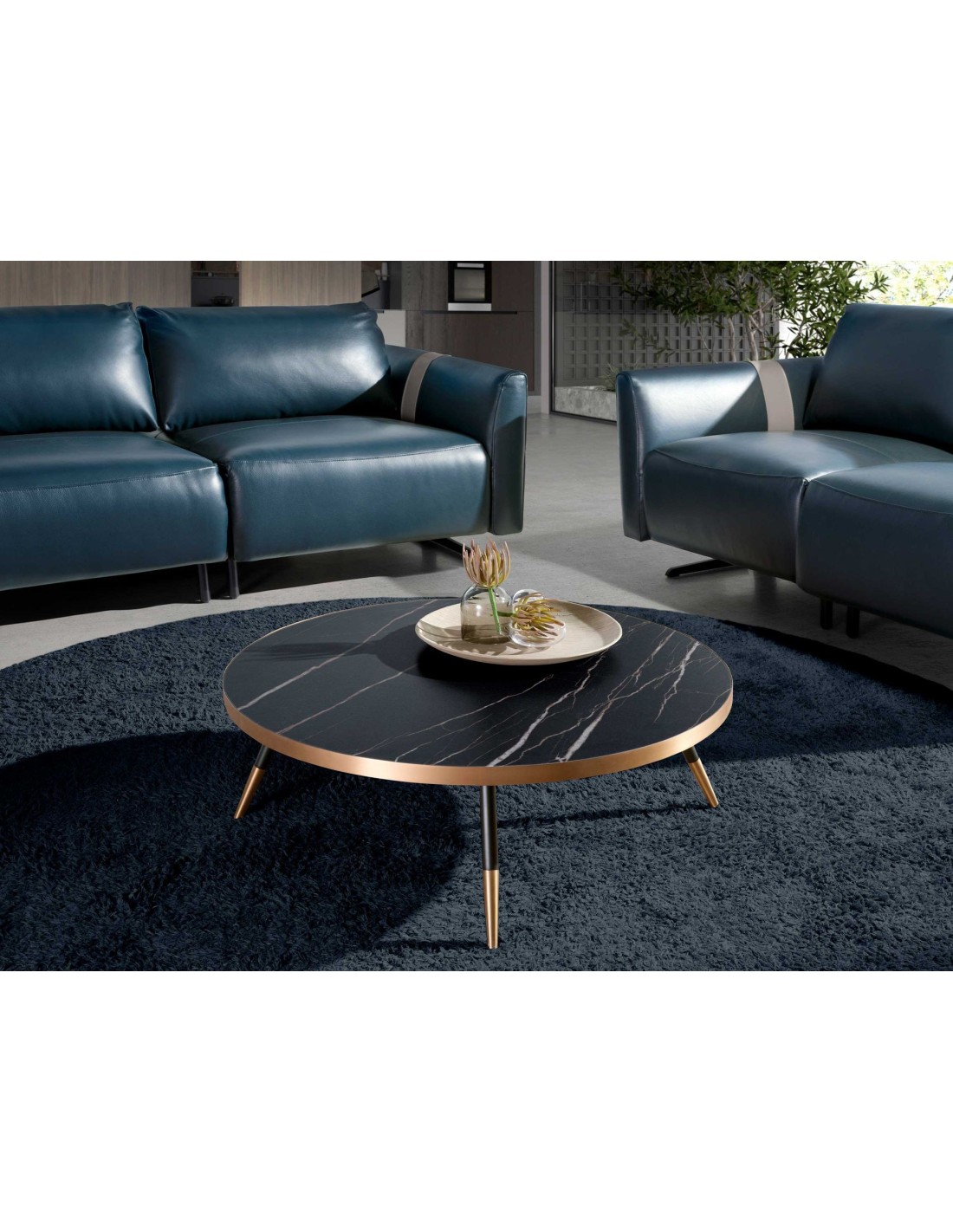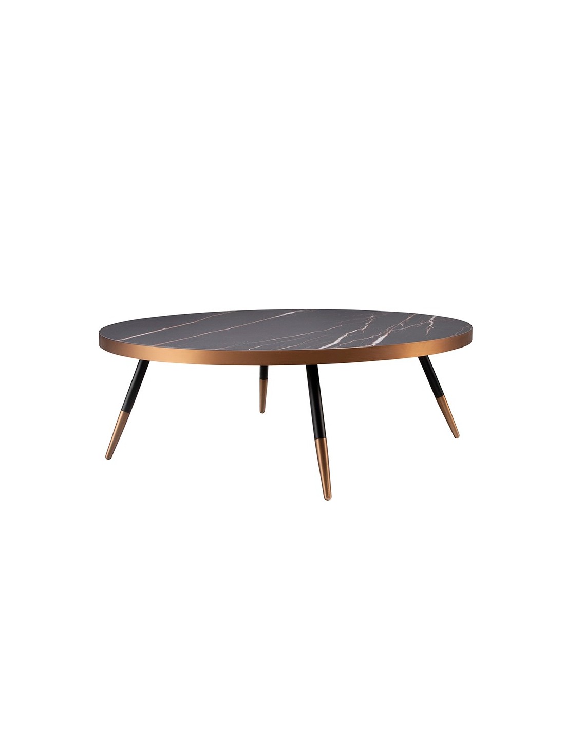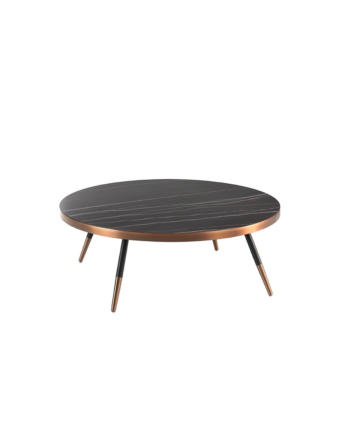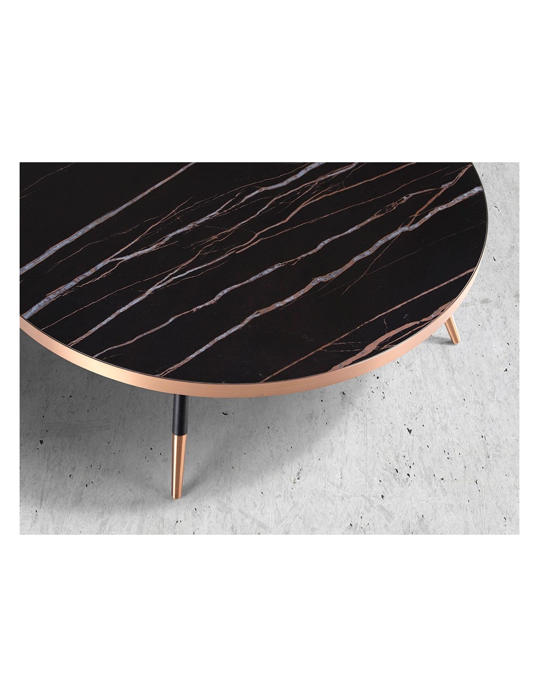 Mesa centro redonda mármol porcelánico y acero negro Mesa centro redonda de diseño moderno con tapa de mármol porcelánico negro con vetas en tonalidades marrones en acabado mate y unas originales patas de acero inoxidable color negro. Una pieza con un diseño sencillo a la vez que original, con la que aportará un toque único y personal. Su original detalle en acero inoxidable color bronce aporta el toque de estilo ideal para tu salón.Medidas del producto: Ø90 x 30 cm.- La original tapa de esta mesa auxiliar en mármol porcelánico negro con vetas en tonalidades marrones, aportará estilo, así como el toque elegante y sofisticado que busca para su salón. - Fiel a las últimas tendencias en decoración, el acero negro le permitirá crear un espacio único, personal y con carácter. - Tanto por su diseño como por su estilo moderno, le permitirá crear un ambiente repleto de vanguardia y sofisticación. - Versátil y funcional, su diseño permite que encaje en cualquier ambiente, convirtiéndose en un elemento clave de la decoración de su hogar. - El original detalle terminal en sus patas en acero color bronce le confiere un aire exclusivo y de tendencia.