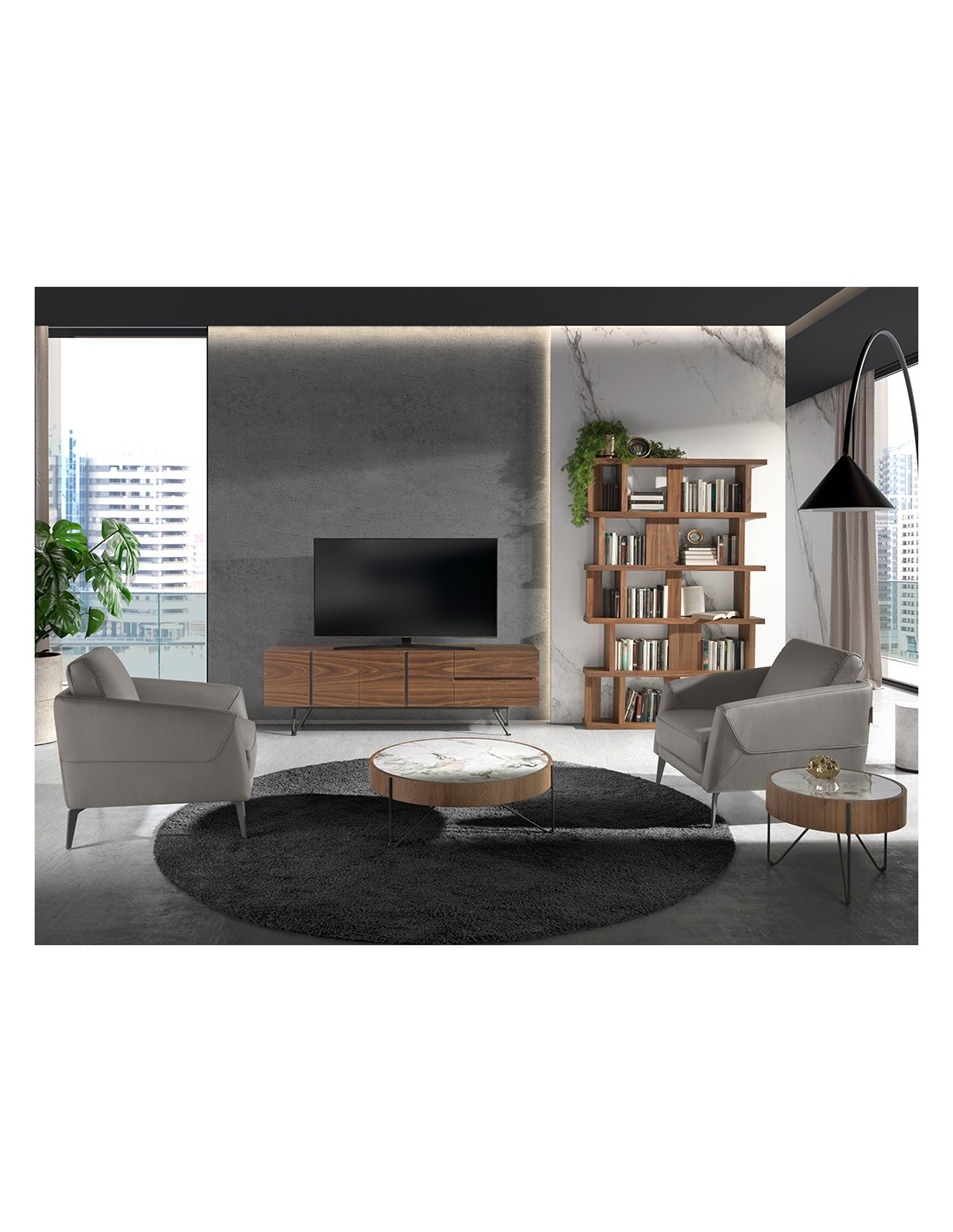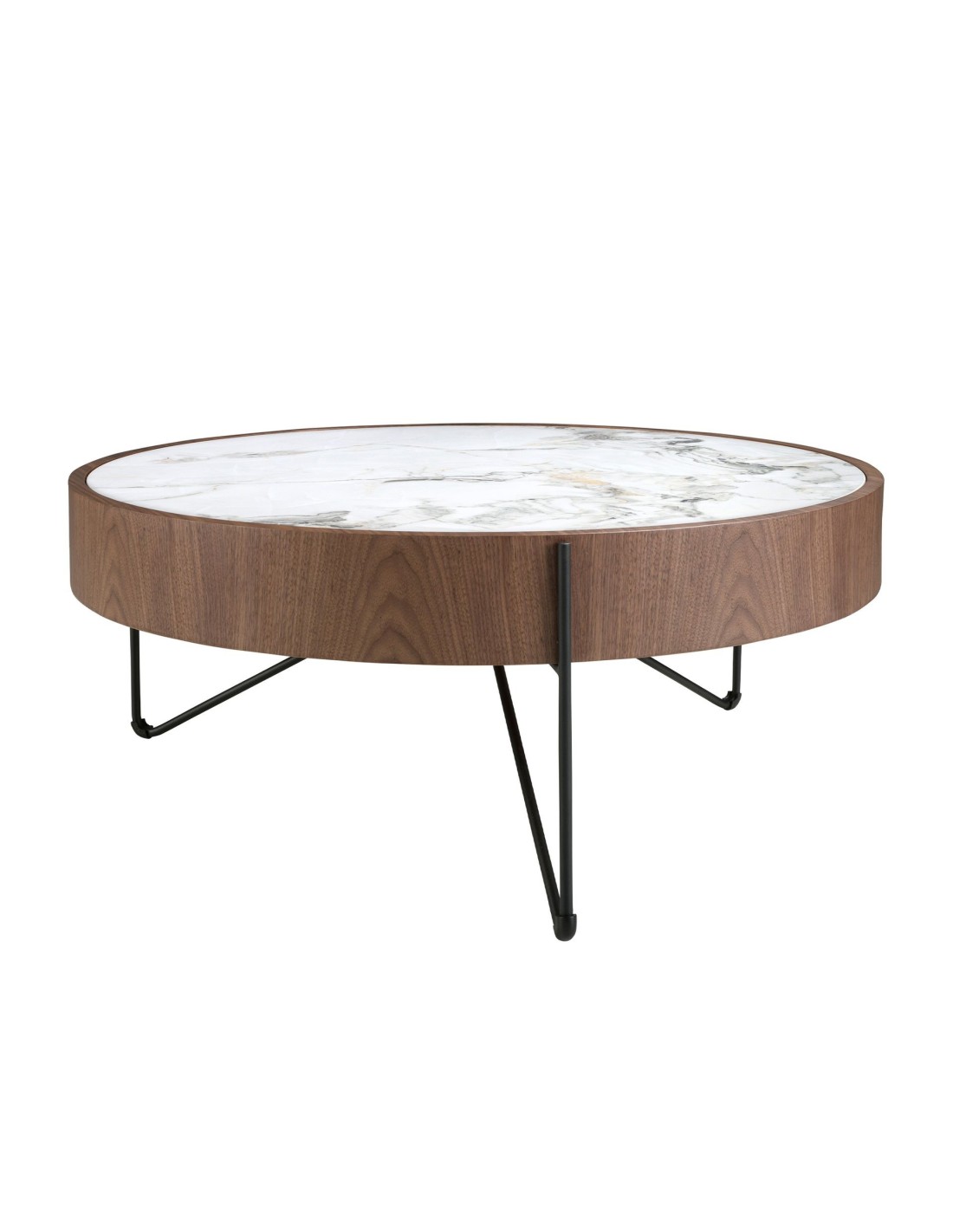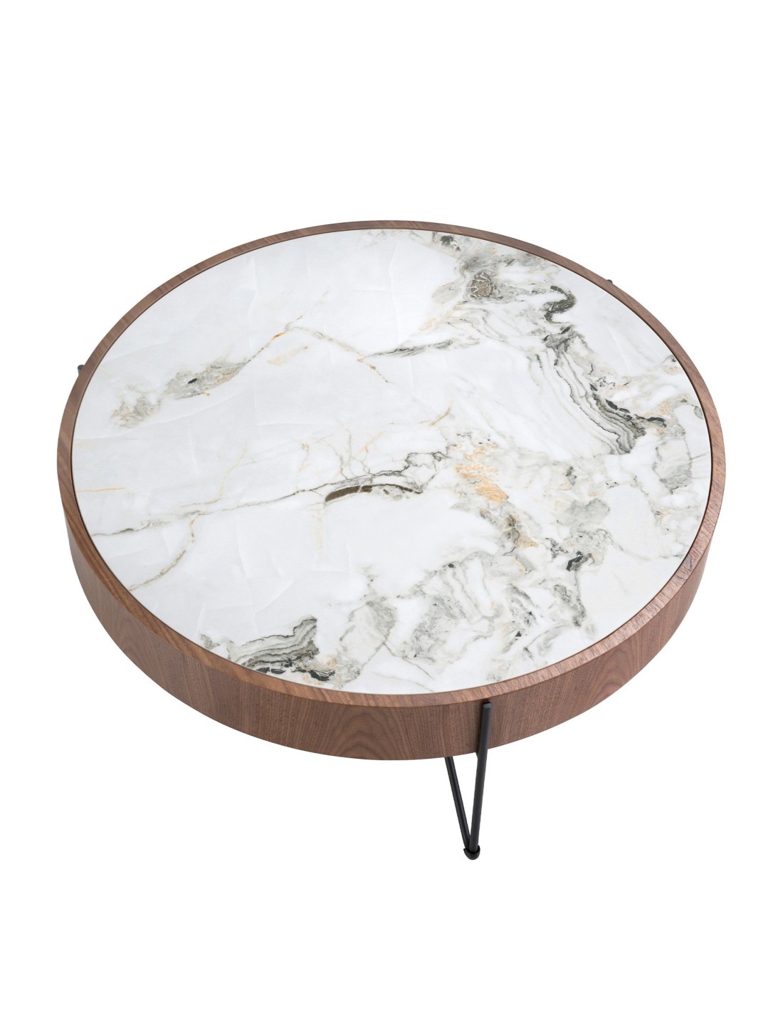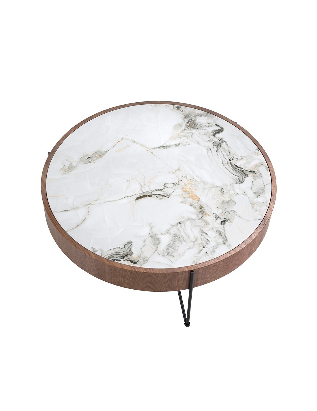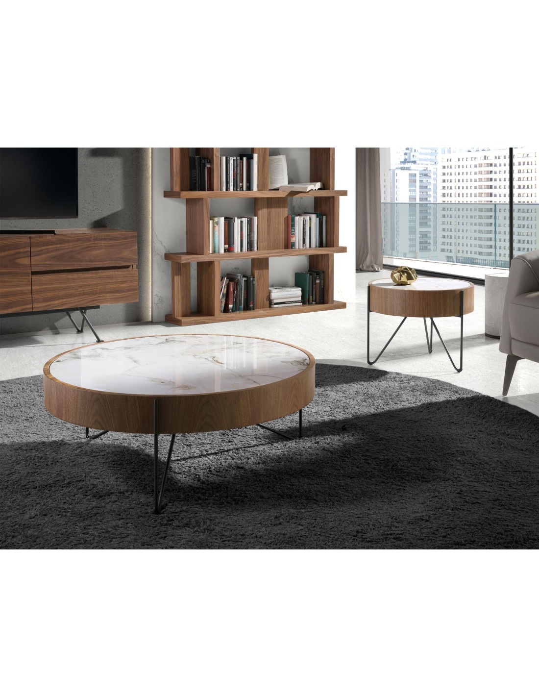 Mesa centro redonda mármol porcelánico, nogal y acero negro