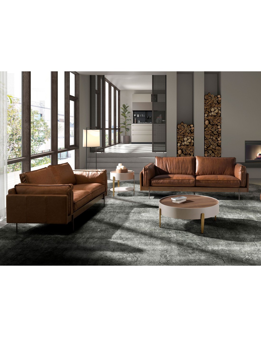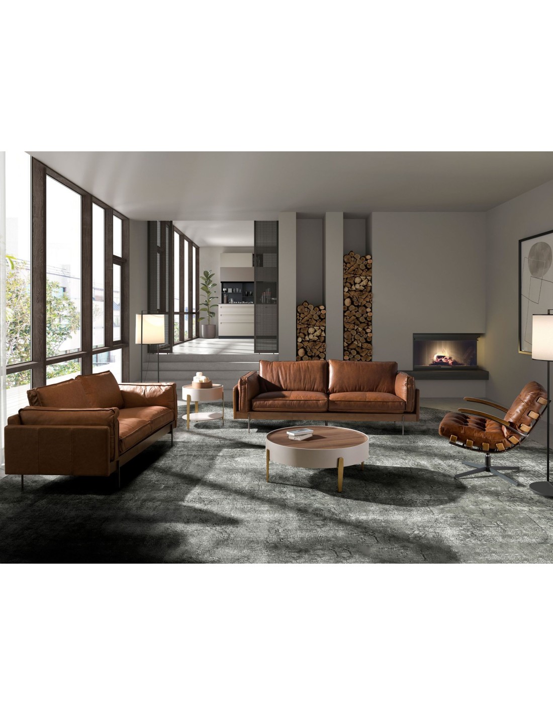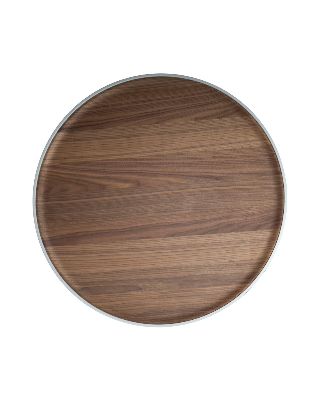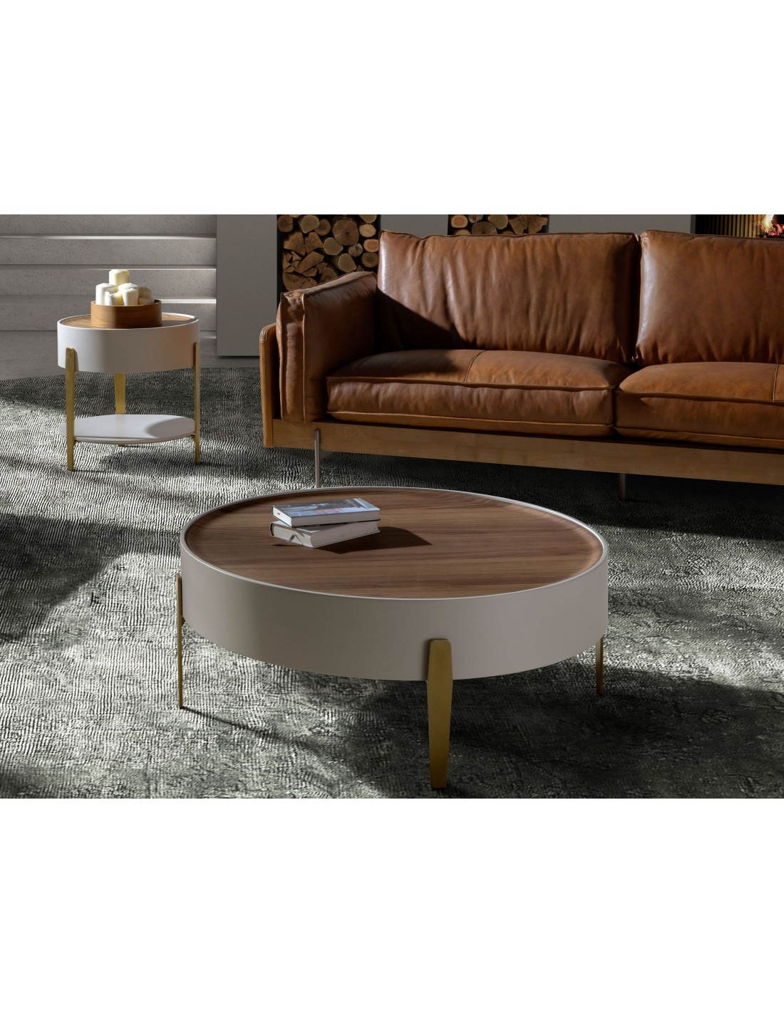 Mesa centro redonda nogal, madera beige y acero pulido dorado