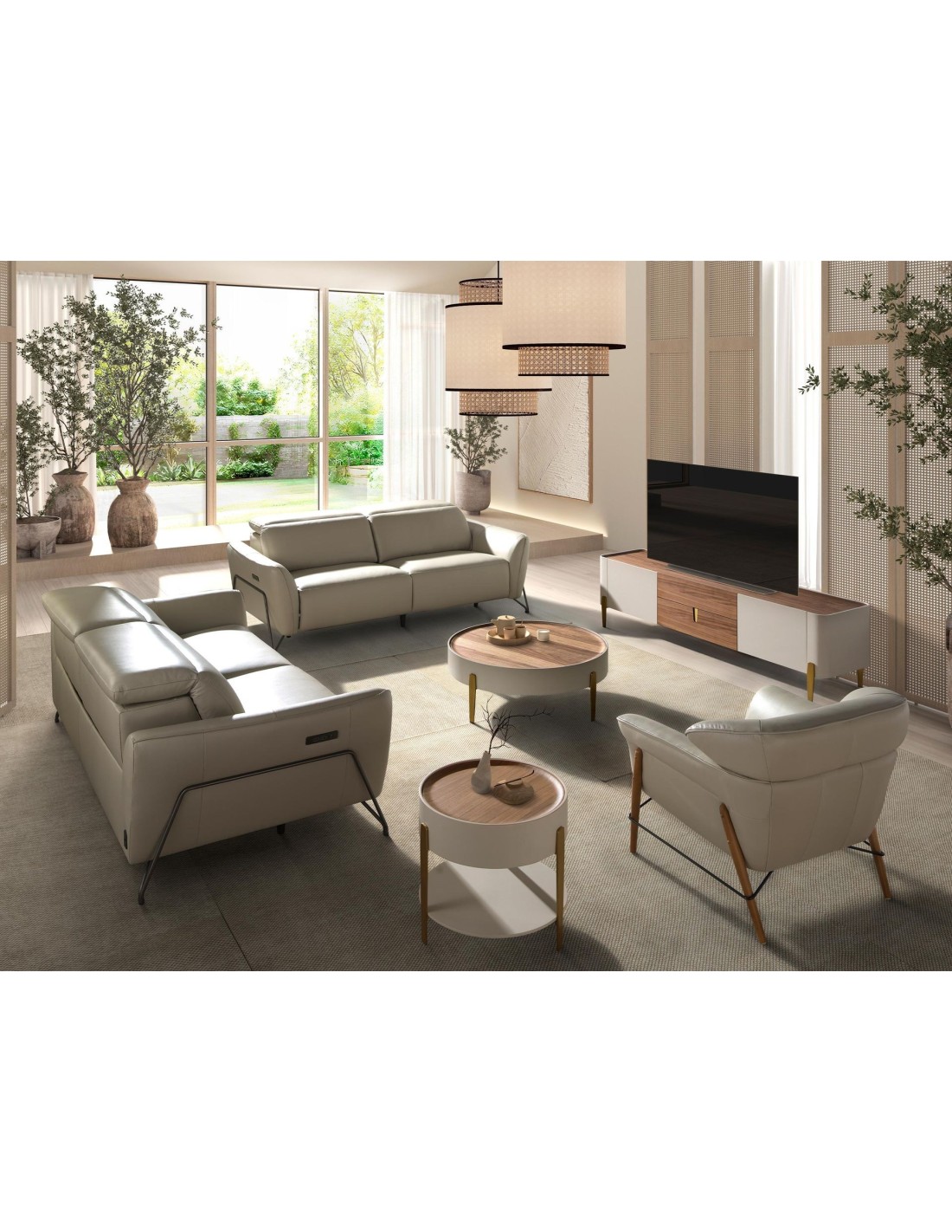 Mesa centro redonda nogal, madera beige y acero pulido dorado Mesa centro redonda de diseño moderno fabricada en madera de MDF color beige y una elegante tapa de madera chapada en nogal natural. Su estructura de patas de acero inoxidable pulido en color dorado, aporta el toque de modernidad y vanguardia que busca para su hogar.Medidas del producto: Ø92 x 35 cm.- Su tapa redonda, y su original estructura de patas, es sinónimo de elegancia, sofisticación y modernidad. Además, podrá combinarla con su mesa de rincón a juego para aportar una mayor funcionalidad y versatilidad al espacio. - El detalle en acero inoxidable color dorado en sus patas, aportará ese toque de vanguardia y elegancia que buscas para tu hogar. - La originalidad de su estructura, así como su diseño, convierte a esta mesita auxiliar redonda, en un elemento clave de decoración. - Versátil y funcional, su diseño permite que encaje en cualquier ambiente, convirtiéndose en un elemento clave de la decoración de su hogar. - Su acabado en madera MDF lacada en color es perfecta para combinar con las últimas tendencias en decoración.