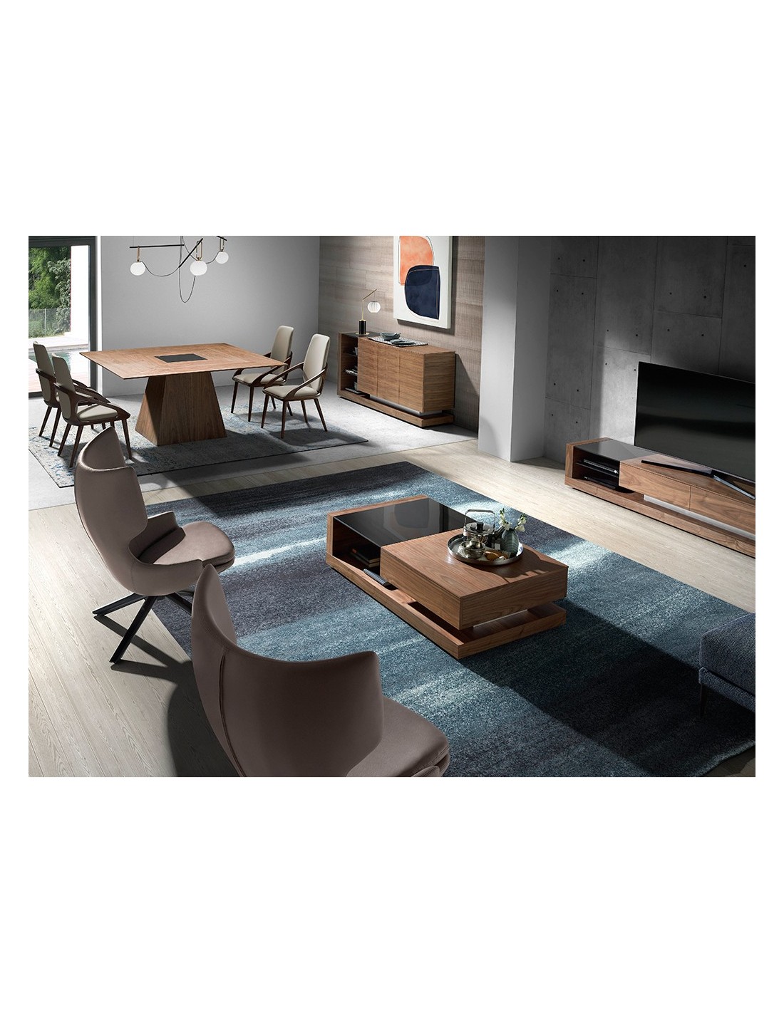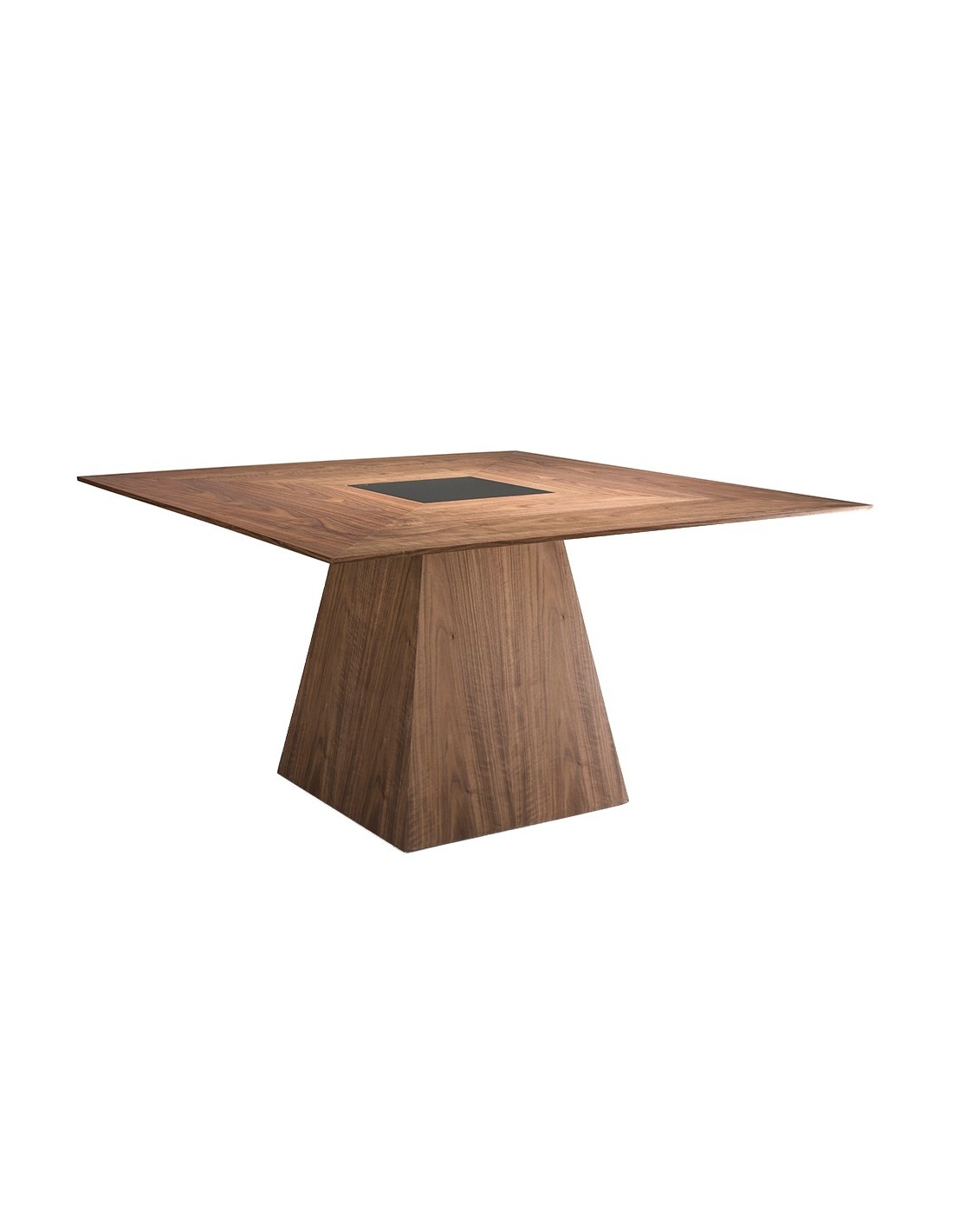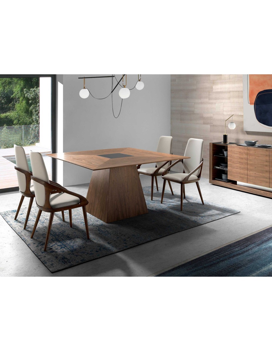Mesa comedor cuadrada nogal Mesa comedor cuadrada de diseño moderno con tapa fija y estructura de madera chapada en nogal natural. Una mesa perfecta para aportar luminosidad y vanguardia a tu cocina, salón o comedor.Medidas del producto: 150 x 150 x 79 cm.- Su tapa de madera chapada en nogal natural de 0,5 mm de espesor es resistente y duradera, ofreciendo además, un toque moderno y elegante al ambiente. - La originalidad de su estructura aúna modernidad y robustez, así como la mayor comodidad para sus comensales. - El perfil de la tapa recto de esta mesa de comedor aporta, gracias a su diseño lineal, el toque de vanguardia que busca para su comedor. - Si busca la mesa comedor perfecta para tu hogar, esta es una opción ideal para aunar el toque moderno y de vanguardia que necesitas, con la mayor calidad y funcionalidad. - Apta para un máximo de 8 comensales. - Su original detalle central en cristal tintado negro añade ese plus de estilo elegante y sobrio que busca para su comedor.