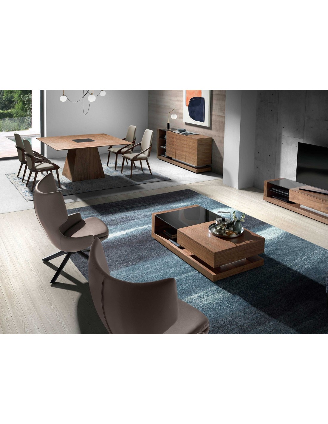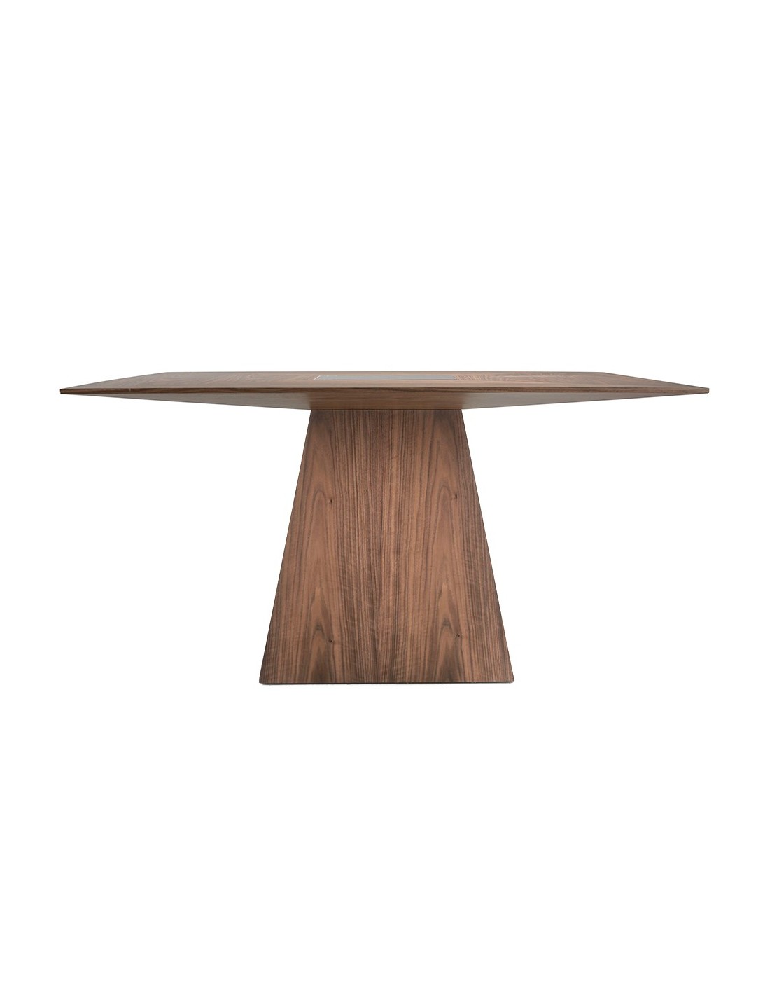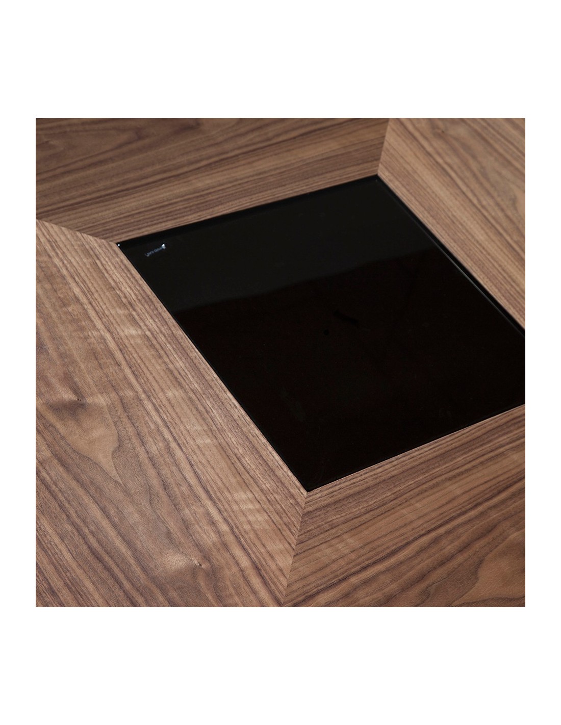 Mesa comedor cuadrada nogal Mesa comedor cuadrada de diseño moderno con tapa fija y estructura de madera chapada en nogal natural. Una mesa perfecta para aportar luminosidad y vanguardia a tu cocina, salón o comedor.Medidas del producto: 150 x 150 x 79 cm.- Su tapa de madera chapada en nogal natural de 0,5 mm de espesor es resistente y duradera, ofreciendo además, un toque moderno y elegante al ambiente. - La originalidad de su estructura aúna modernidad y robustez, así como la mayor comodidad para sus comensales. - El perfil de la tapa recto de esta mesa de comedor aporta, gracias a su diseño lineal, el toque de vanguardia que busca para su comedor. - Si busca la mesa comedor perfecta para tu hogar, esta es una opción ideal para aunar el toque moderno y de vanguardia que necesitas, con la mayor calidad y funcionalidad. - Apta para un máximo de 8 comensales. - Su original detalle central en cristal tintado negro añade ese plus de estilo elegante y sobrio que busca para su comedor.
