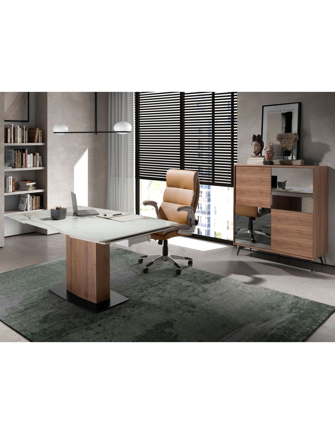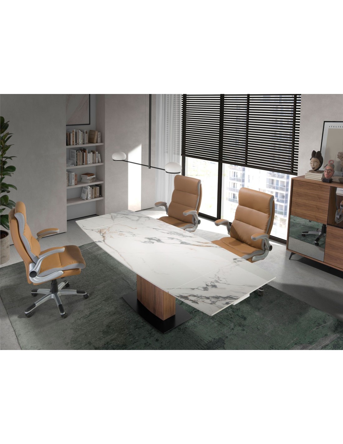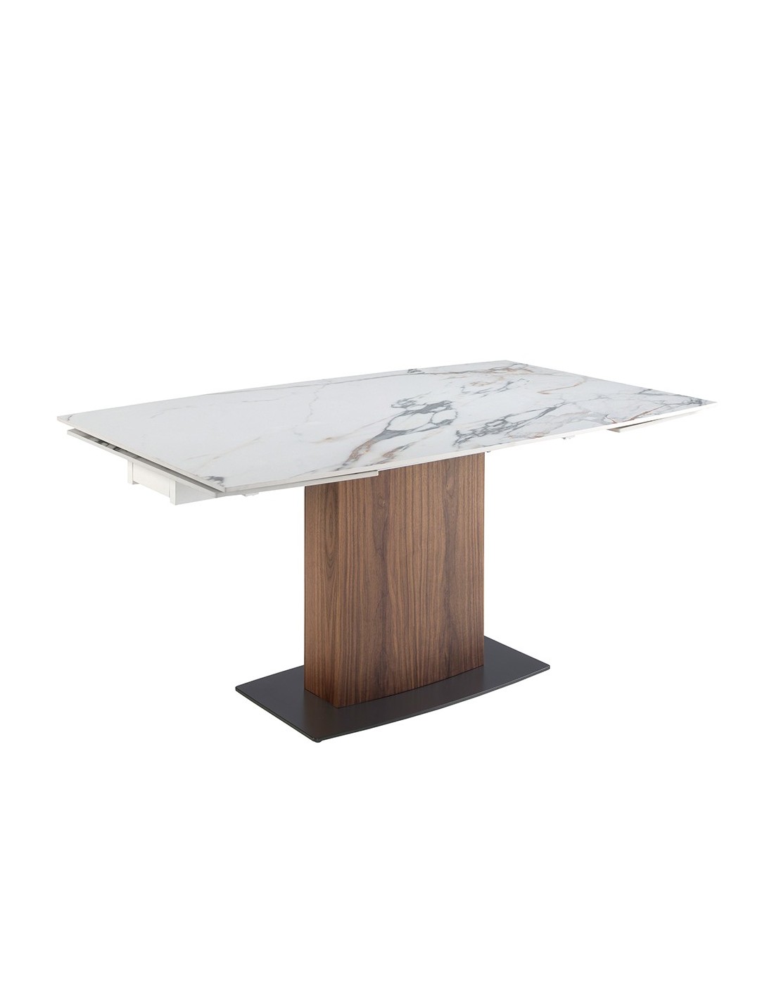 Mesa comedor extensible ovalada barril mármol porcelánico y nogal