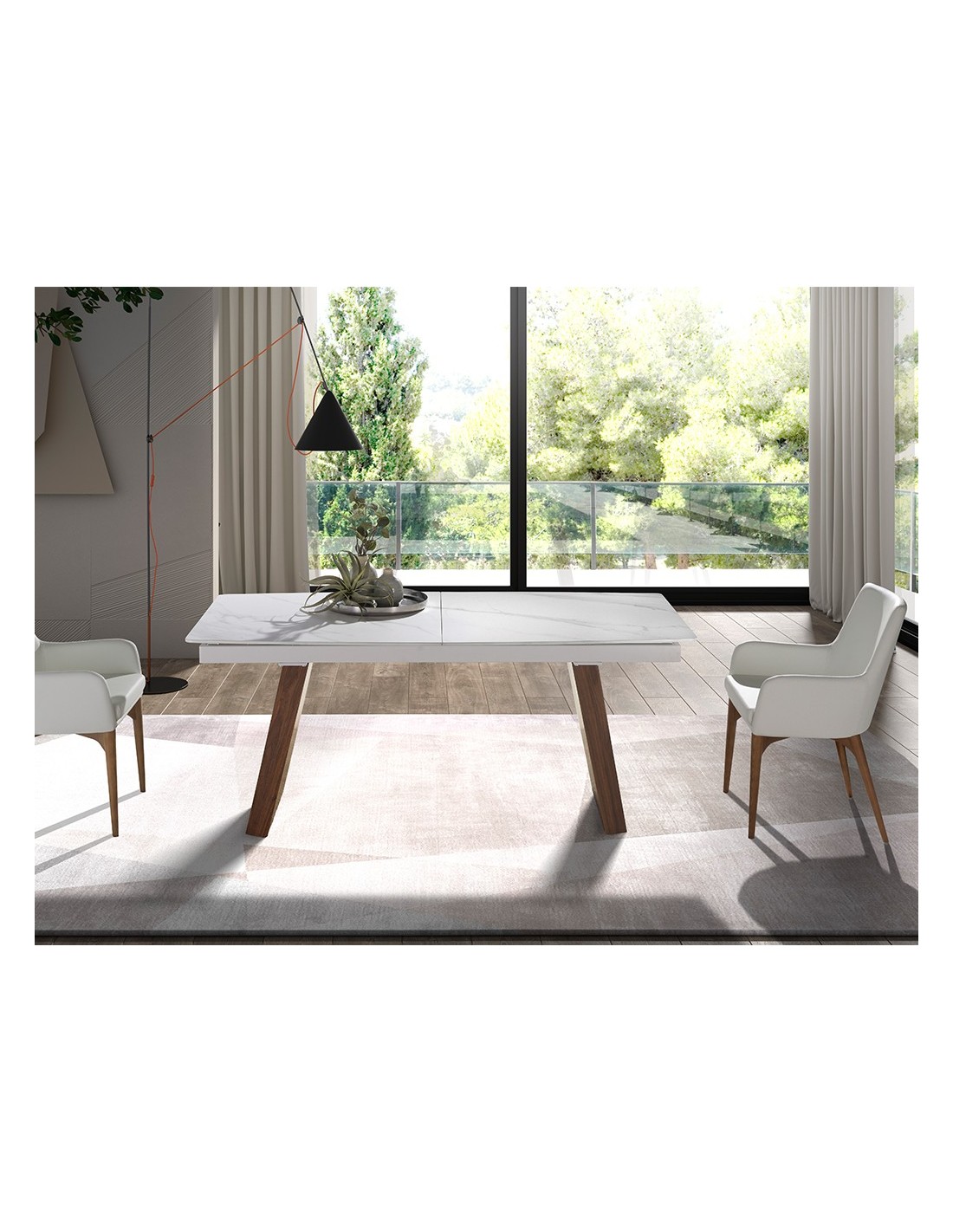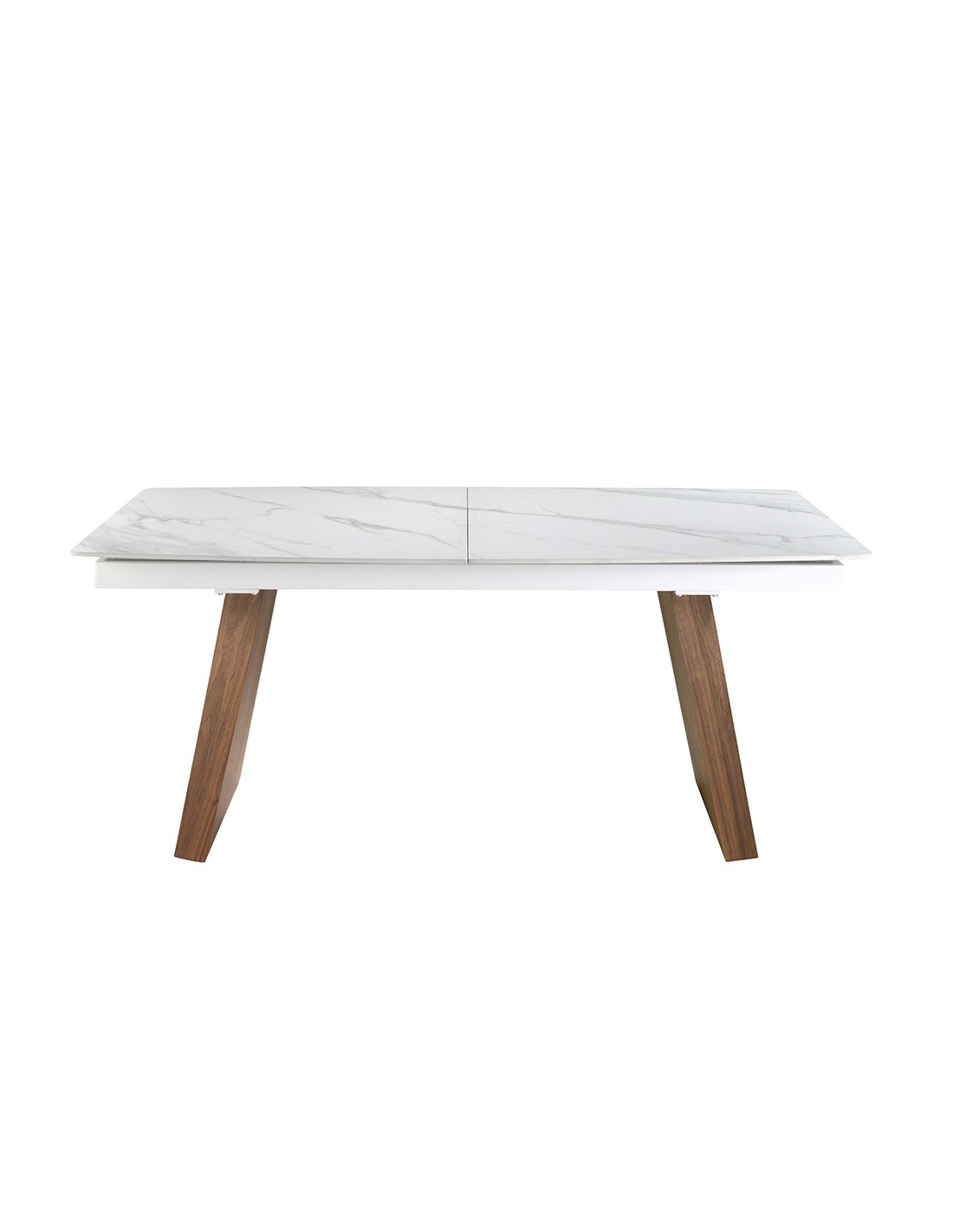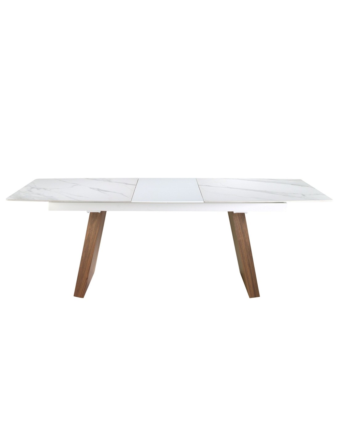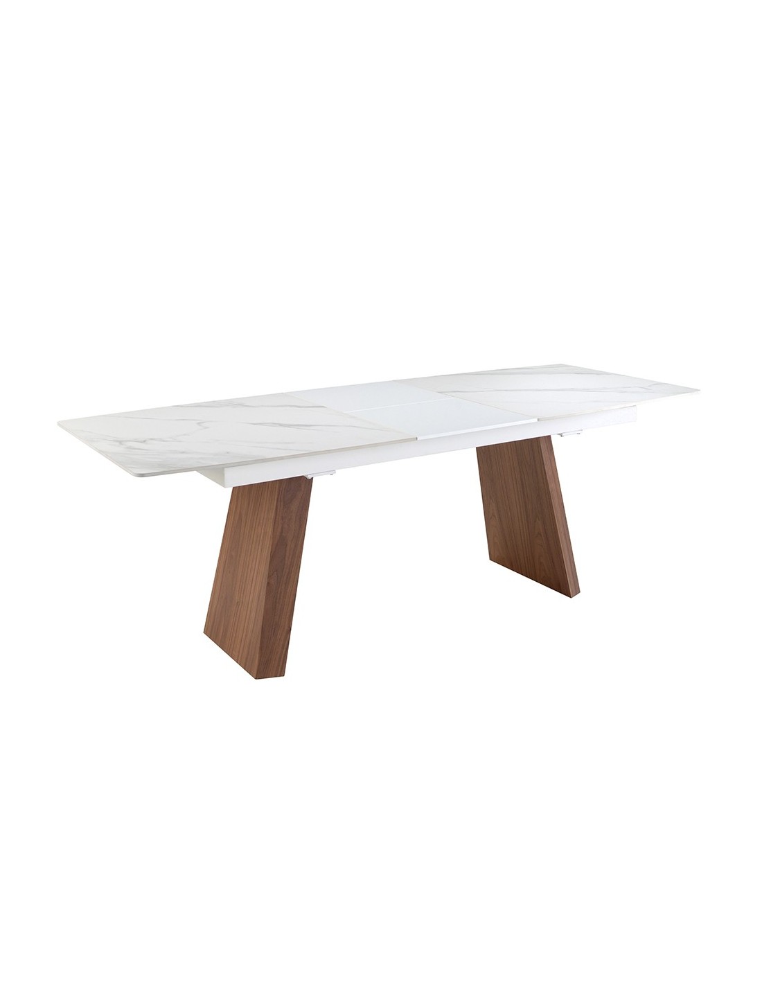 Mesa comedor extensible ovalada barril mármol porcelánico y nogal Mesa comedor extensible ovalada barril de diseño moderno con tapa de mármol porcelánico blanco con vetas en color gris en acabado mate. Sus patas de madera chapada en nogal natural así como su adaptabilidad, la convierten en un mueble totalmente funcional y versátil para el día a día.Medidas del producto: Ø180 x 90 x 76 cm.Esta mesa comedor cuenta con 1 extensible de 50 cm., pudiendo ampliarla de 180 a 230 cm.- Su tapa de mármol porcelánico es resistente y duradera, ofreciendo además un toque de vanguardia y elegancia al ambiente. - Sus patas robustas y de carácter lineal permite combinarla con cualquier silla de nuestro catálogo, sin molestar o interferir en la comodidad de los comensales. - El perfil de la tapa pulido de esta mesa de comedor ofrece un acabado de alta calidad, siendo además, sinónimo de comodidad y elegancia. - Gracias a su extensible mariposa central oculto disfrutará de una mesa totalmente versátil y funcional, que podrá adaptar según el número de invitados. - Apta para un máximo de 10 comensales. - Su extensible central está fabricado en madera MDF lacada en color blanco brillo.