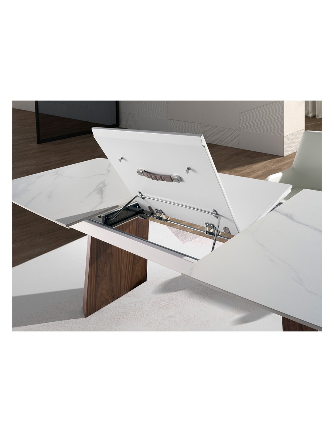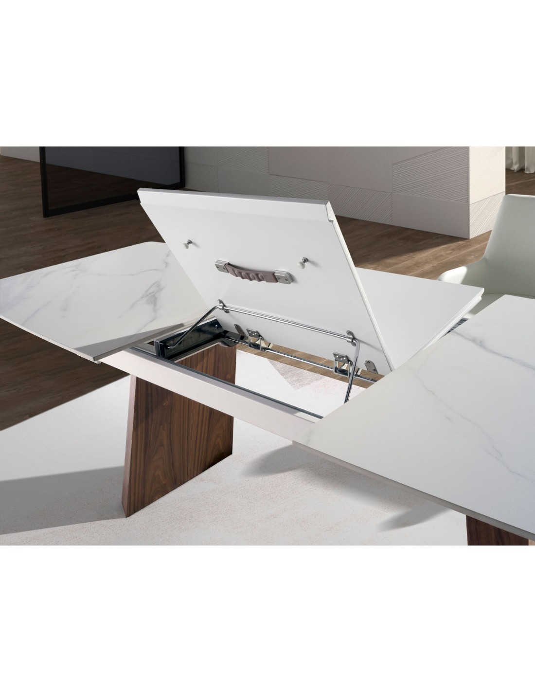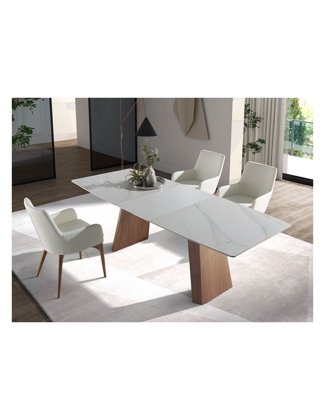 Mesa comedor extensible ovalada barril mármol porcelánico y nogal