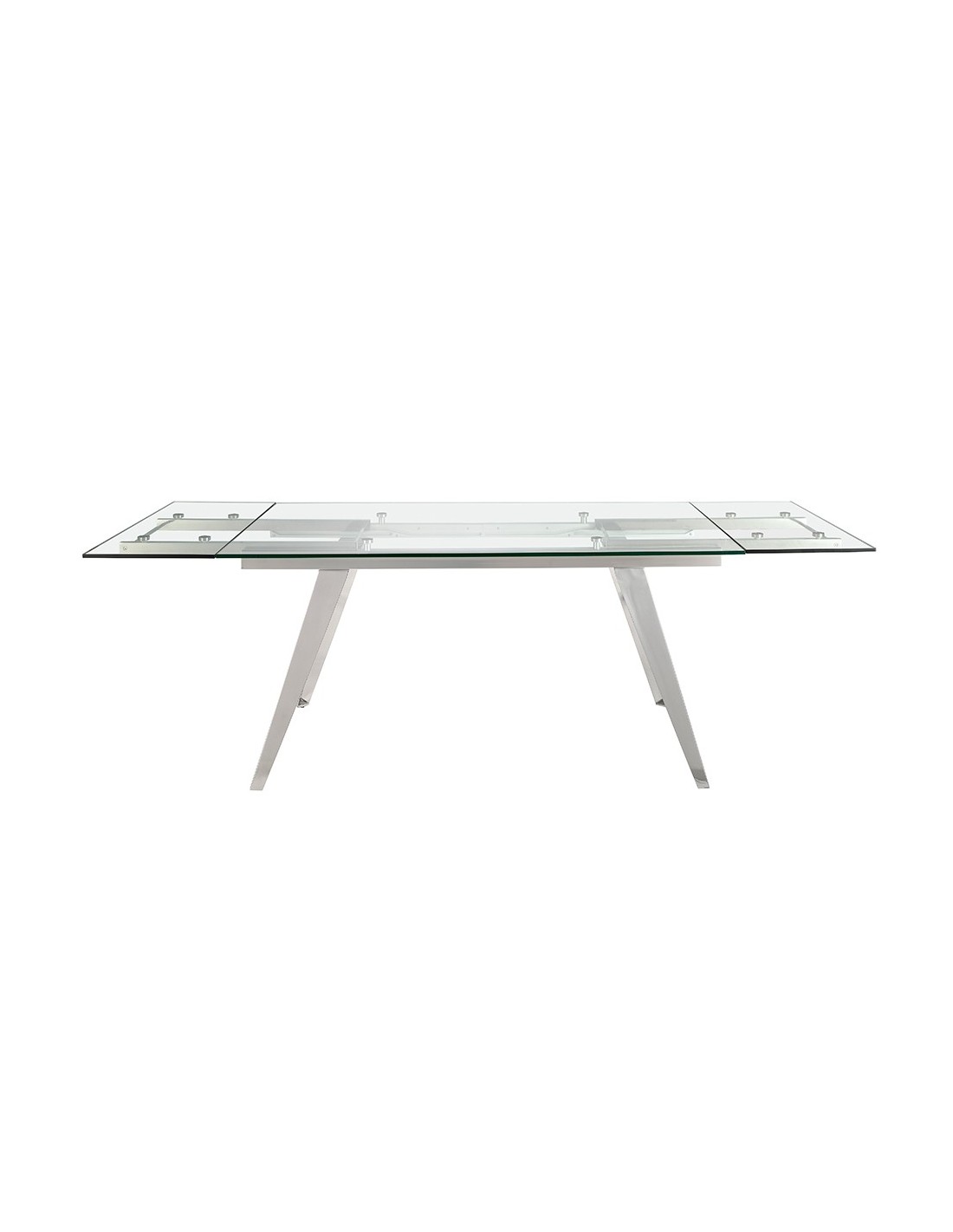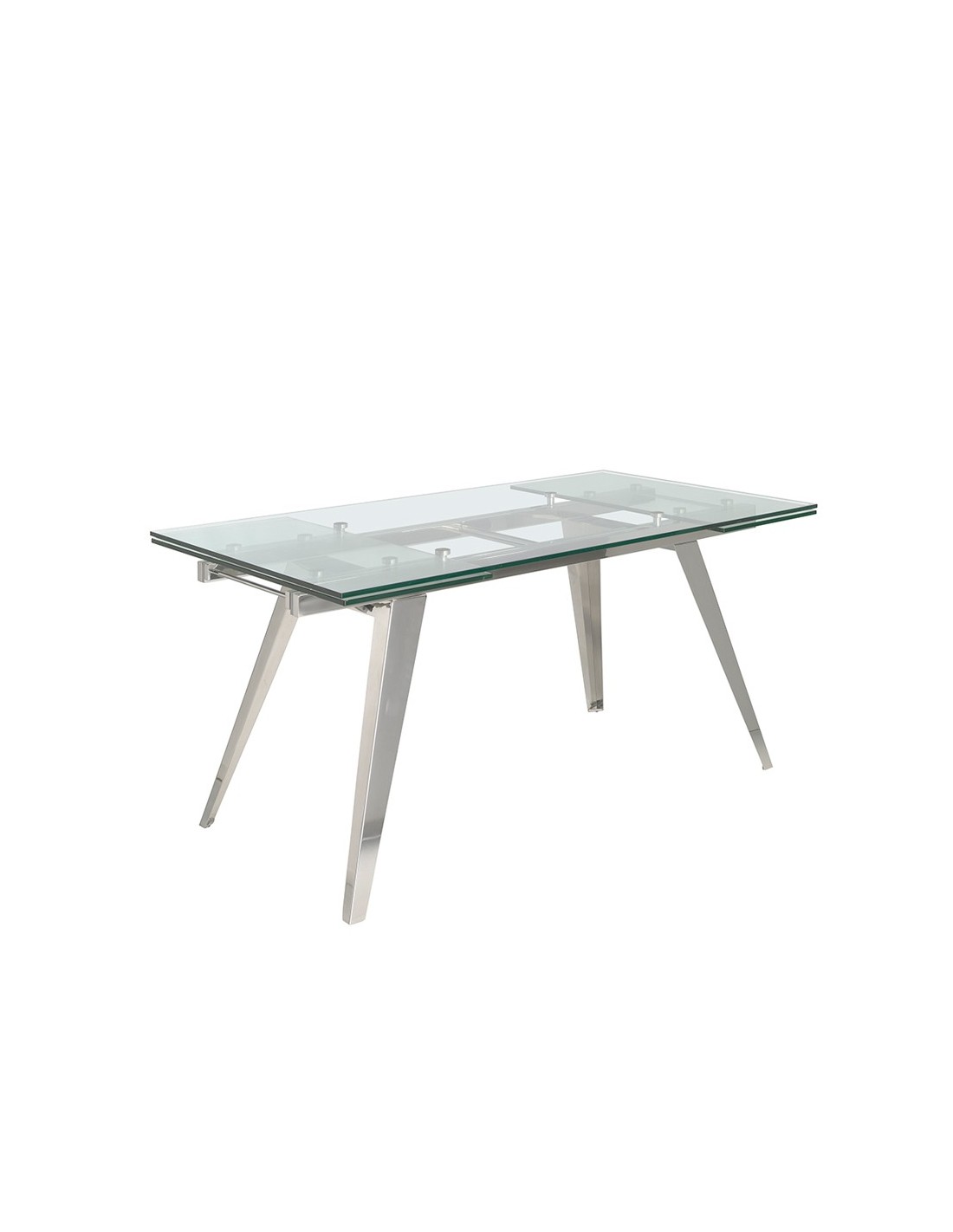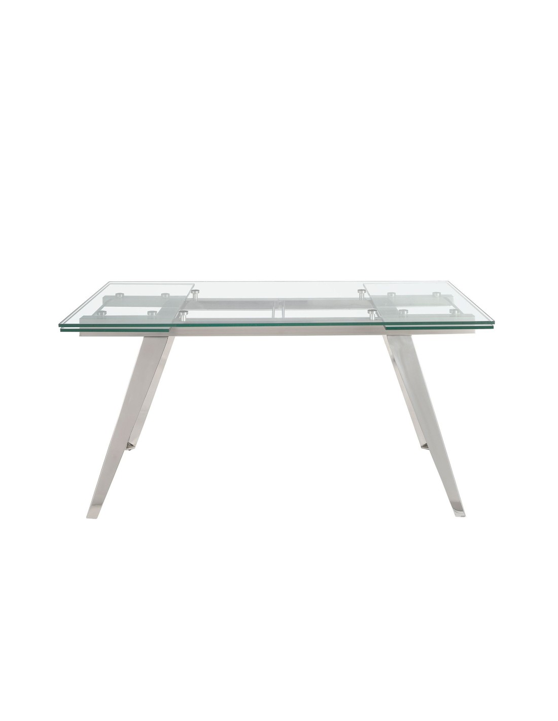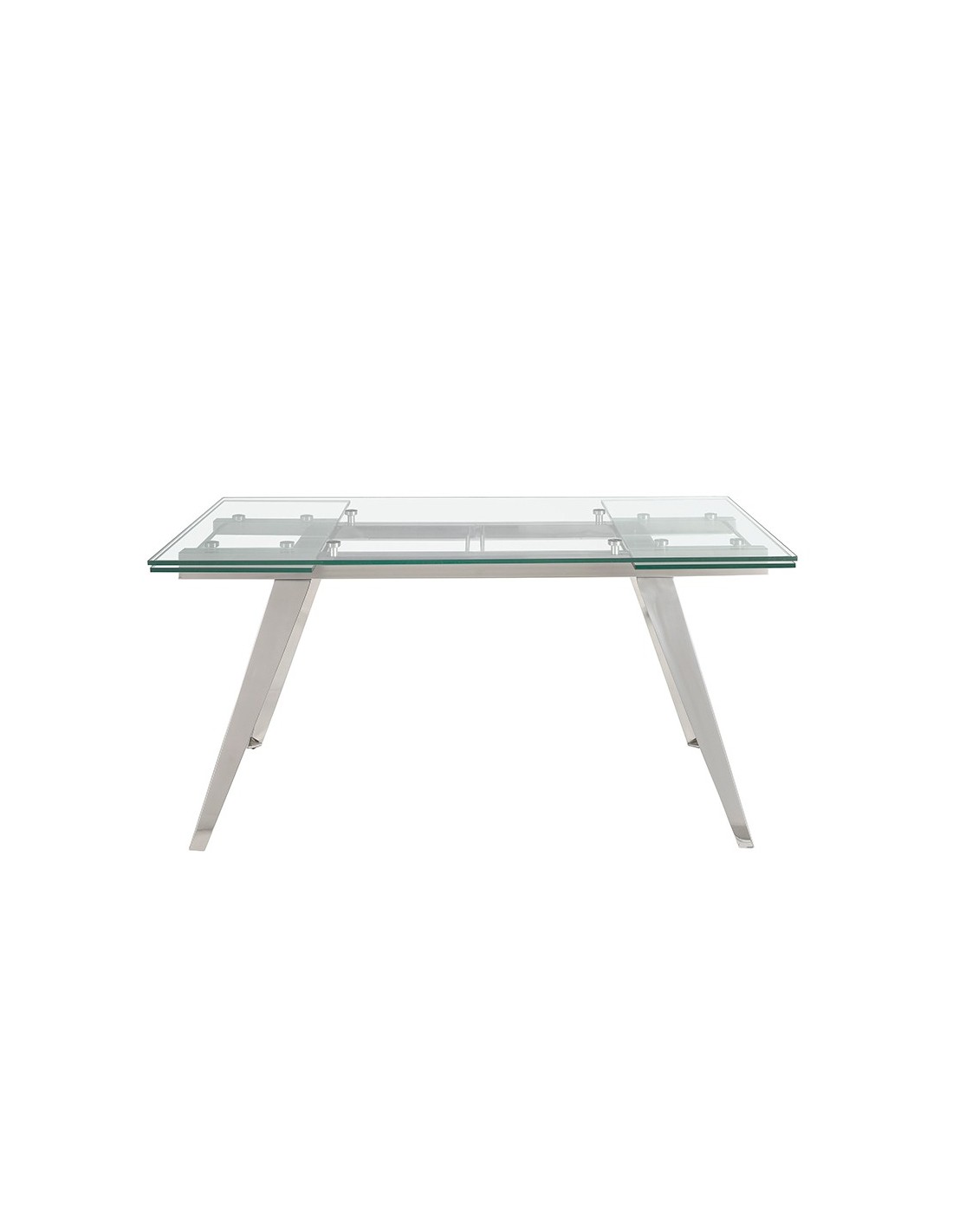 Mesa comedor extensible rectangular cristal templado y acero cromado Mesa comedor extensible rectangular de diseño moderno con tapa de cristal templado. Sus patas de acero inoxidable cromado así como su adaptabilidad, la convierten en un mueble totalmente funcional y versátil para el día a día.Medidas del producto: 160 x 90 x 76 cm.Esta mesa comedor cuenta con 2 extensibles de 40 cm., pudiendo ampliarla de 160 a 240 cm.- Su tapa de cristal templado de 12 mm de espesor es resistente, duradera, y favorece la sensación de amplitud en el espacio. - Sus patas robustas y de carácter lineal permite combinarla con cualquier silla de nuestro catálogo, sin molestar o interferir en la comodidad de los comensales. - El perfil de la tapa pulido de esta mesa de comedor ofrece un acabado de alta calidad, siendo además, sinónimo de comodidad y elegancia. - La transparencia del cristal, deja ver el mecanismo de apertura extensible de esta mesa, haciendo así, que su diseño sea mucho más único e innovador. - Apta para un máximo de 8 comensales.
