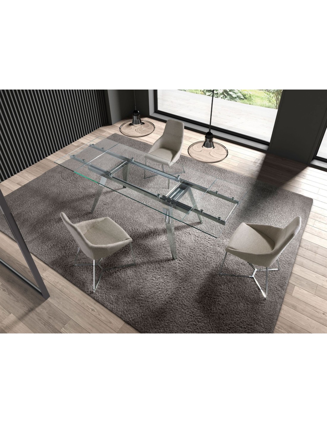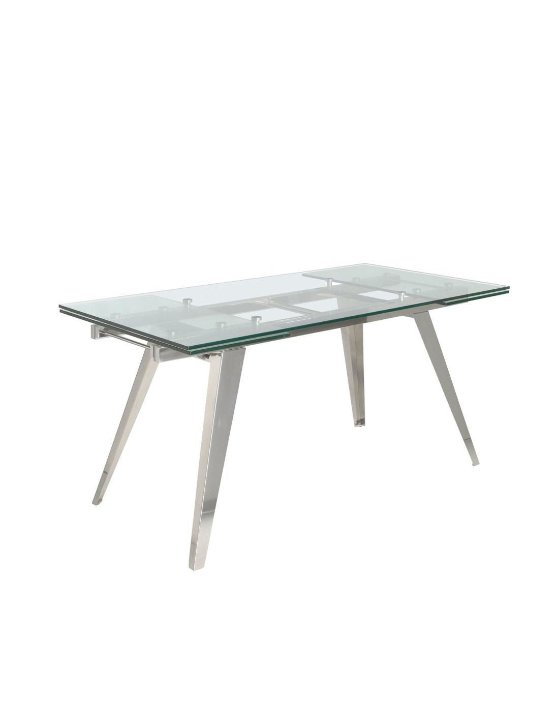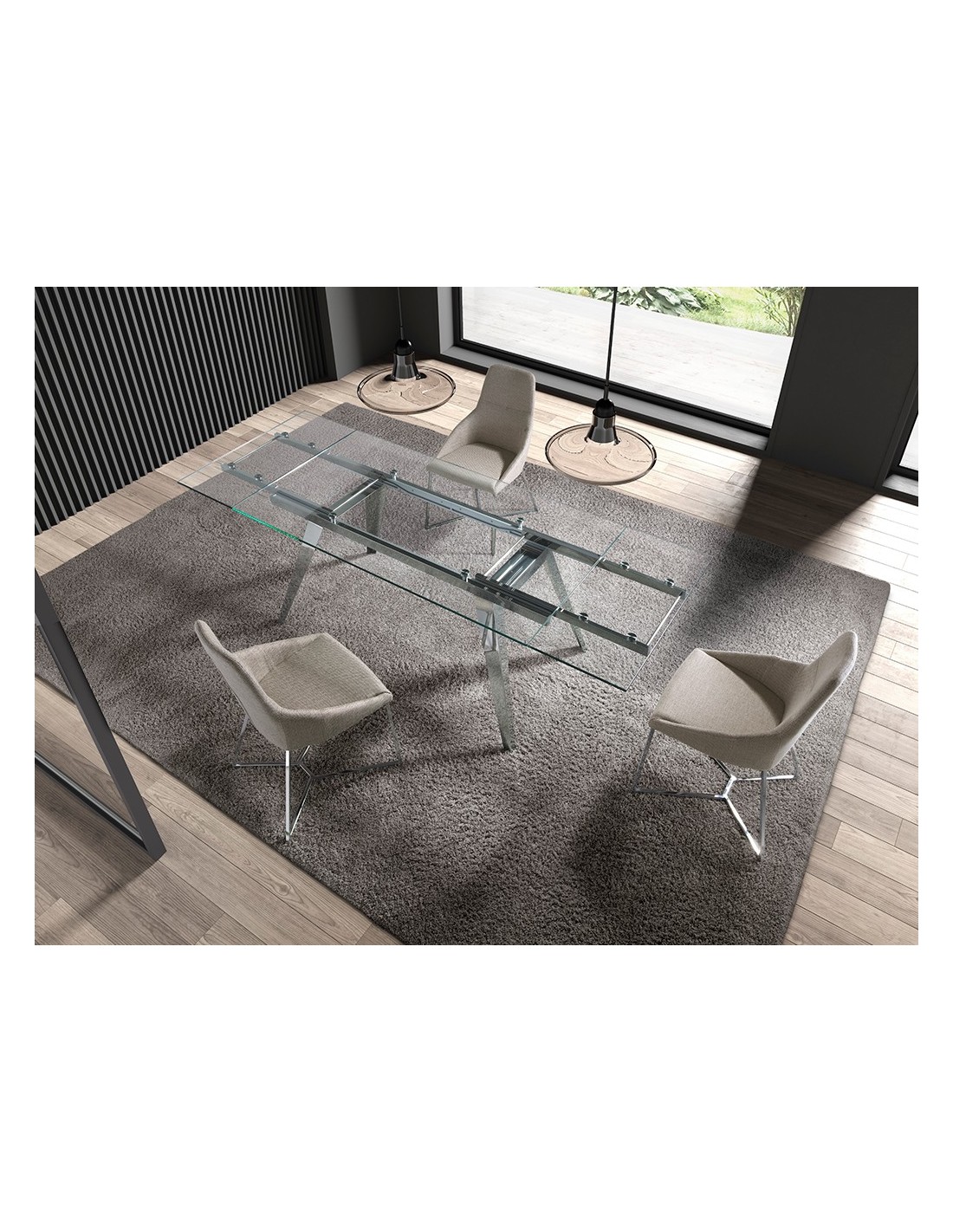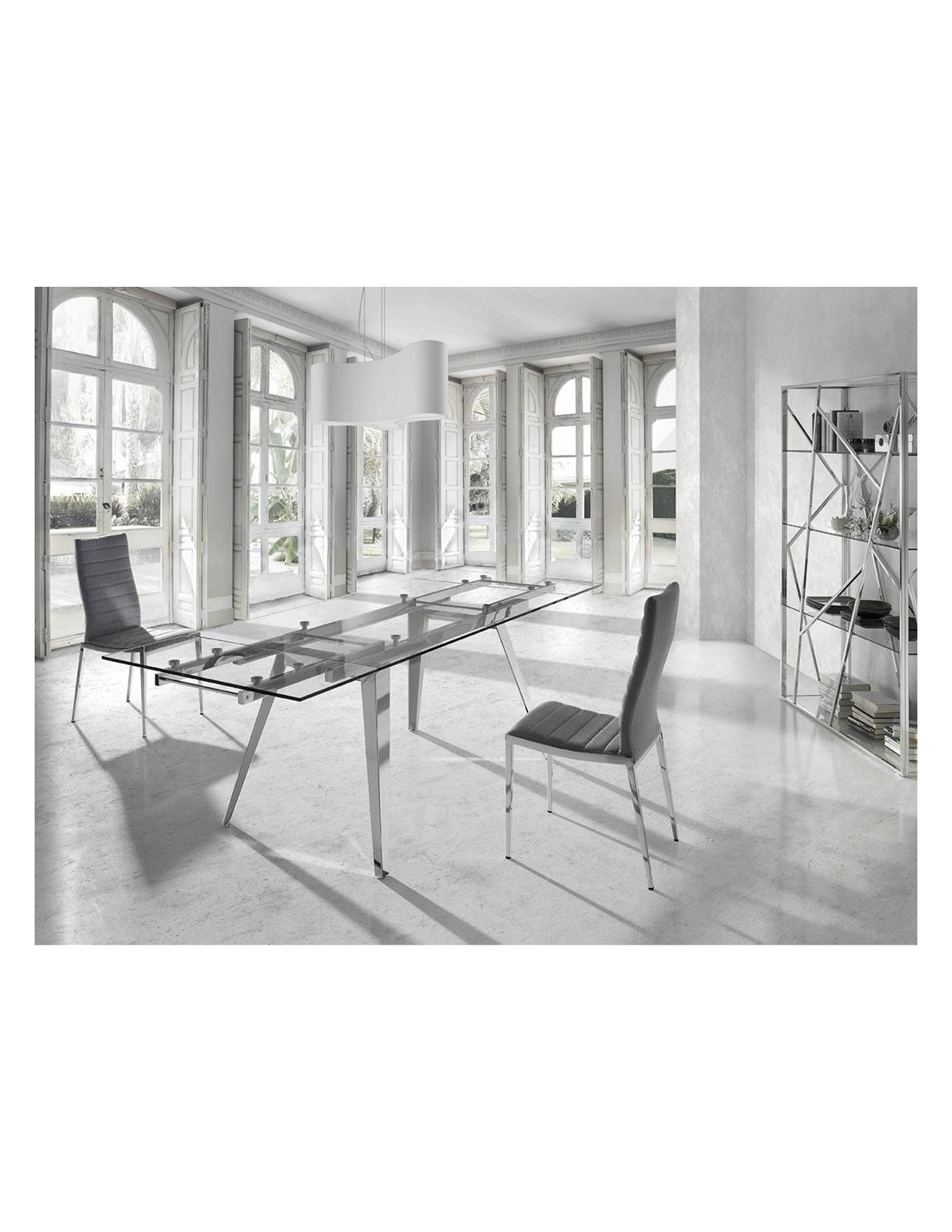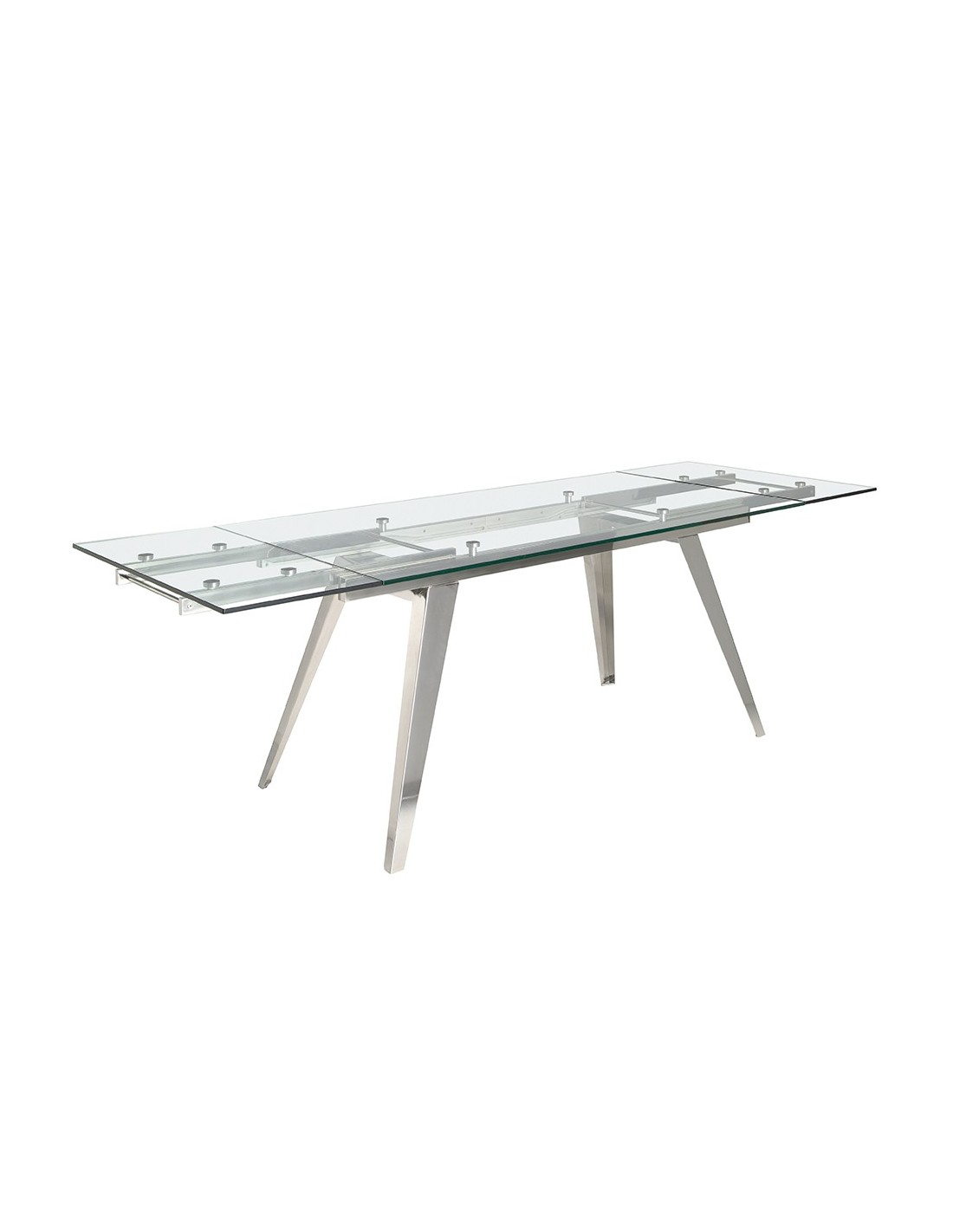 Mesa comedor extensible rectangular cristal templado y acero cromado Mesa comedor extensible rectangular de diseño moderno con tapa de cristal templado. Sus patas de acero inoxidable cromado así como su adaptabilidad, la convierten en un mueble totalmente funcional y versátil para el día a día.Medidas del producto: 160 x 90 x 76 cm.Esta mesa comedor cuenta con 2 extensibles de 40 cm., pudiendo ampliarla de 160 a 240 cm.- Su tapa de cristal templado de 12 mm de espesor es resistente, duradera, y favorece la sensación de amplitud en el espacio. - Sus patas robustas y de carácter lineal permite combinarla con cualquier silla de nuestro catálogo, sin molestar o interferir en la comodidad de los comensales. - El perfil de la tapa pulido de esta mesa de comedor ofrece un acabado de alta calidad, siendo además, sinónimo de comodidad y elegancia. - La transparencia del cristal, deja ver el mecanismo de apertura extensible de esta mesa, haciendo así, que su diseño sea mucho más único e innovador. - Apta para un máximo de 8 comensales.